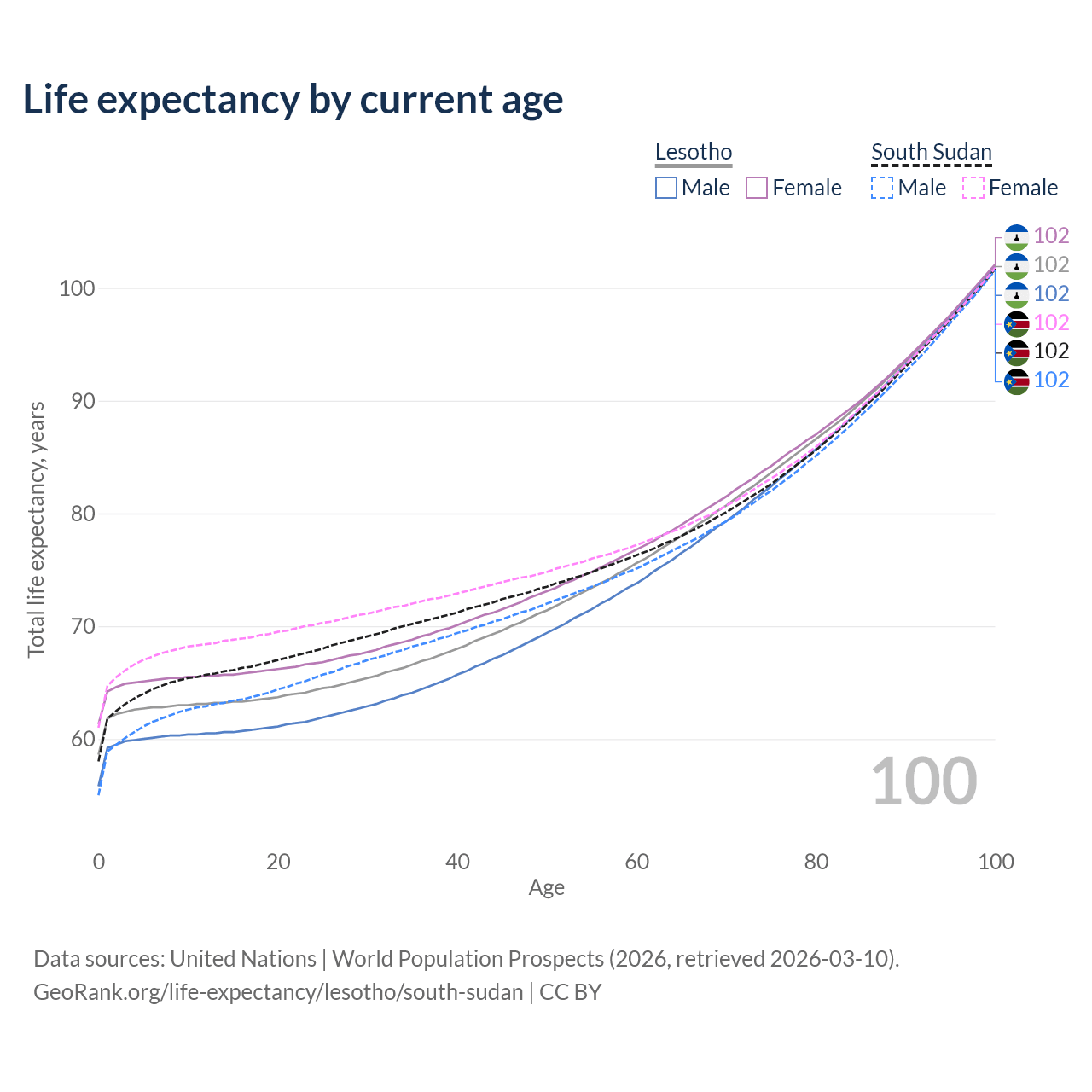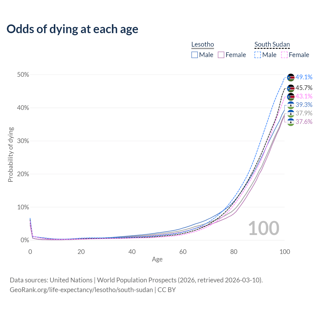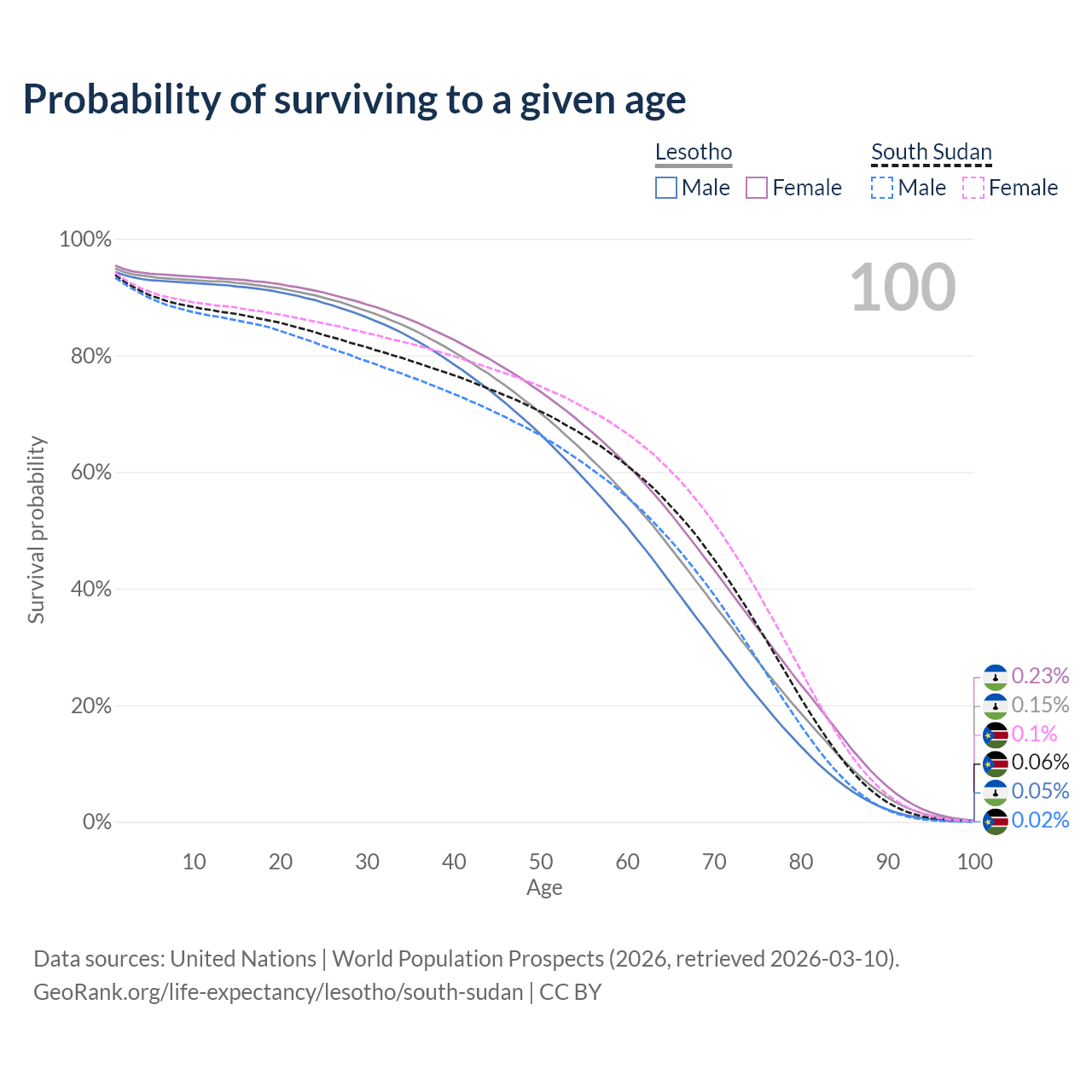 This life expectancy calculator shows the odds of living to 100, 95, 90, and below based on current age for both males and females in Lesotho and South Sudan, along with mean and median age of death. The calculations are based on the 2026 life tables (actuarial tables) from the UN World Population Prospects.