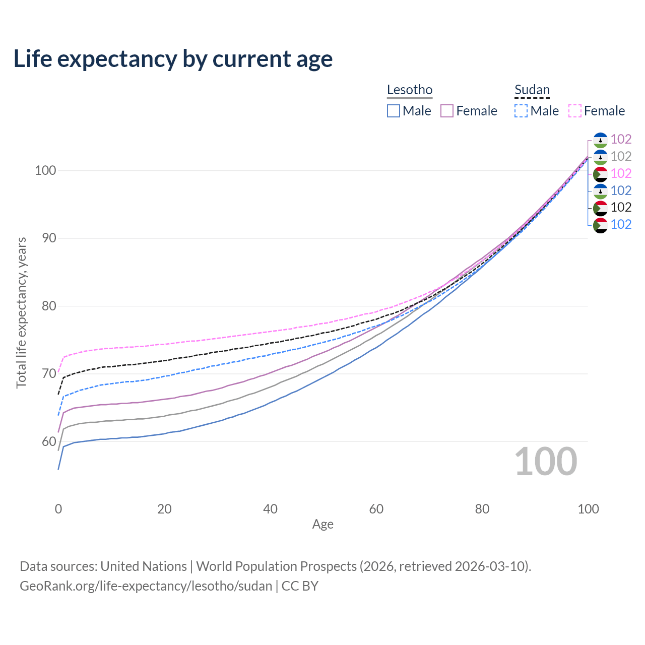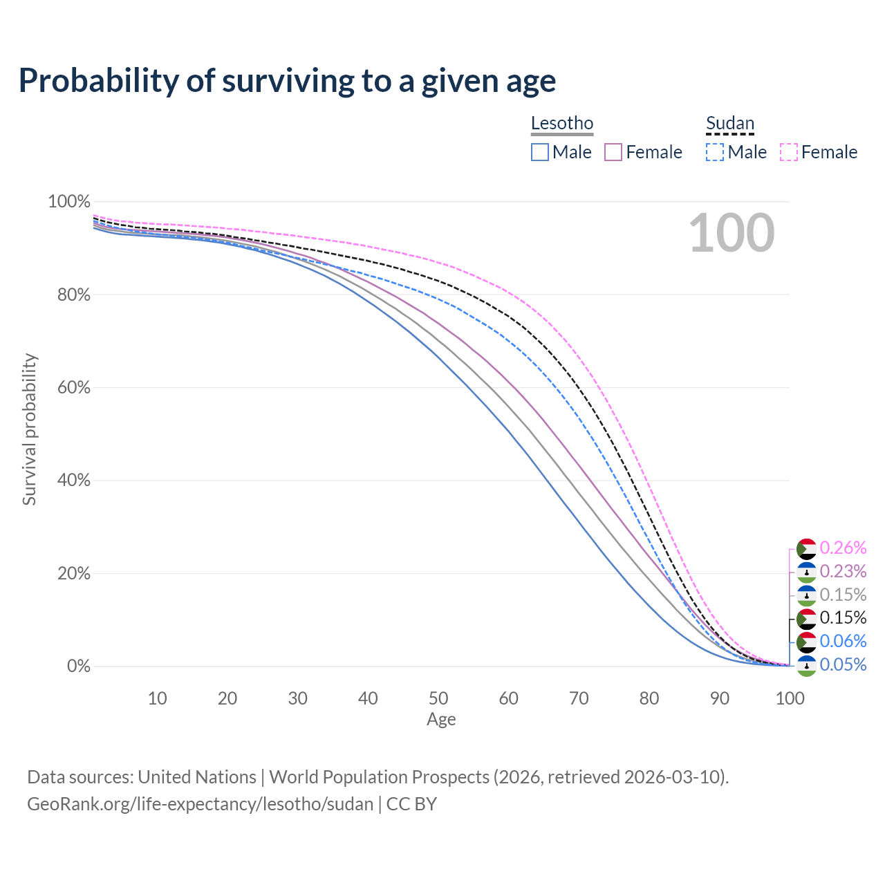 This life expectancy calculator shows the odds of living to 100, 95, 90, and below based on current age for both males and females in Lesotho and Sudan, along with mean and median age of death. The calculations are based on the 2026 life tables (actuarial tables) from the UN World Population Prospects.