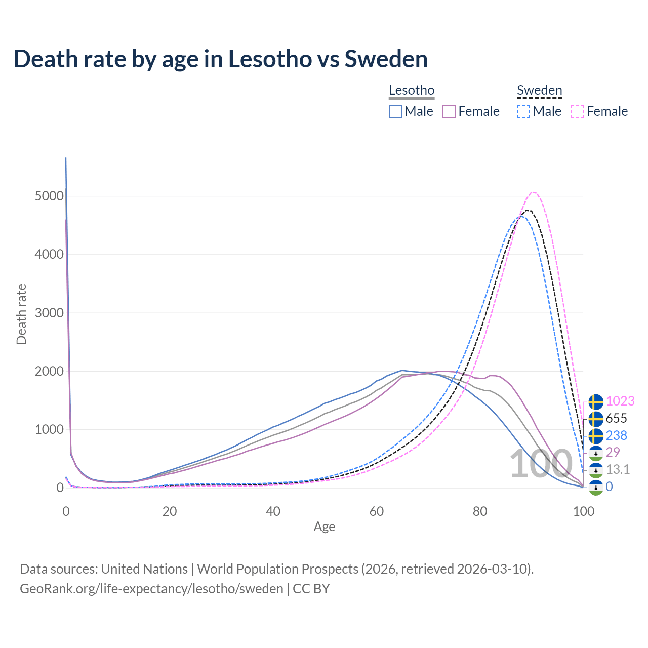 In Lesotho, the most common age of death is 0, compared to 89 in Sweden. The median age of death is 63.4 in Lesotho and 86.5 in Sweden, meaning only half of each cohort is expected to live past that age.