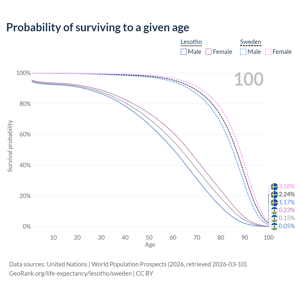 This life expectancy calculator shows the odds of living to 100, 95, 90, and below based on current age for both males and females in Lesotho and Sweden, along with mean and median age of death. The calculations are based on the 2026 life tables (actuarial tables) from the UN World Population Prospects.