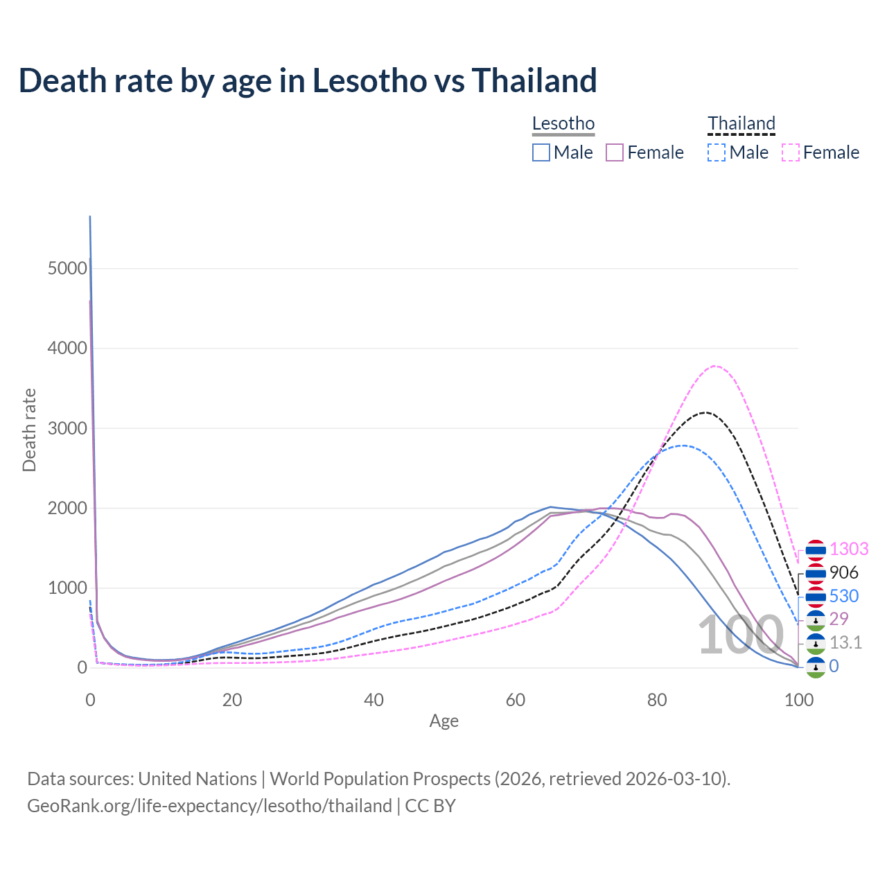 In Lesotho, the most common age of death is 0, compared to 87 in Thailand. The median age of death is 63.4 in Lesotho and 81.8 in Thailand, meaning only half of each cohort is expected to live past that age.