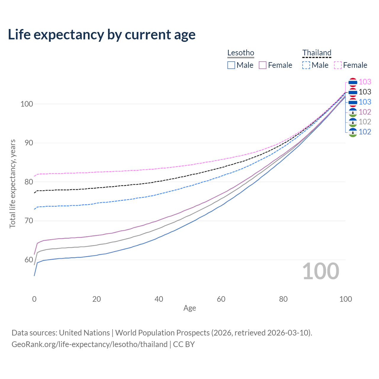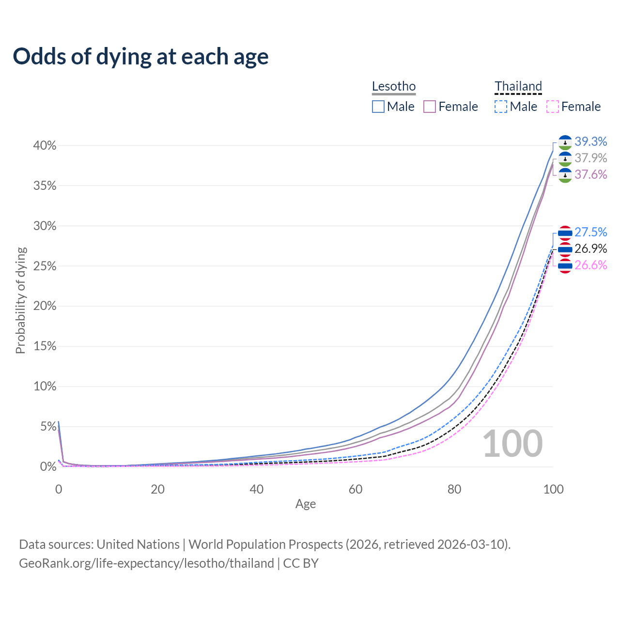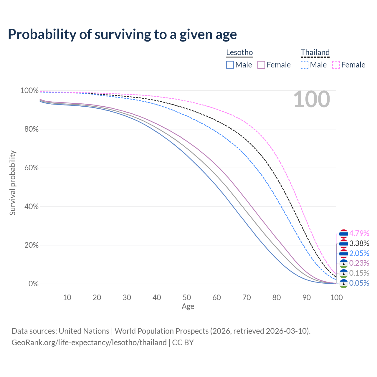 This life expectancy calculator shows the odds of living to 100, 95, 90, and below based on current age for both males and females in Lesotho and Thailand, along with mean and median age of death. The calculations are based on the 2026 life tables (actuarial tables) from the UN World Population Prospects.