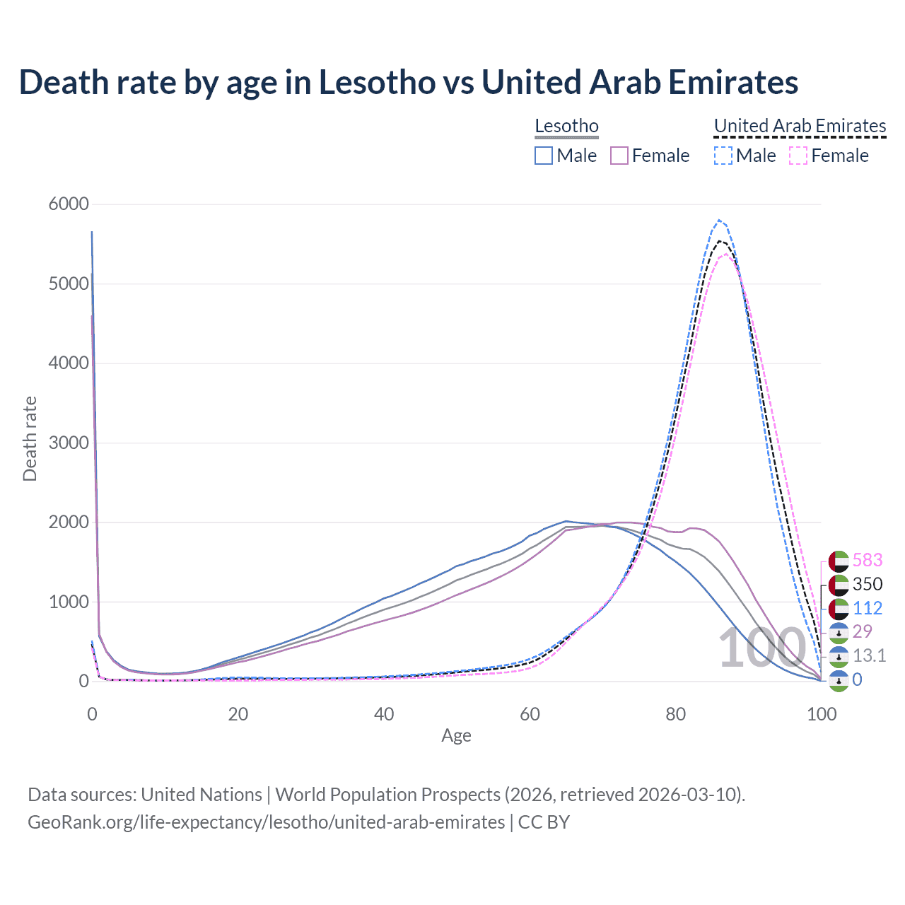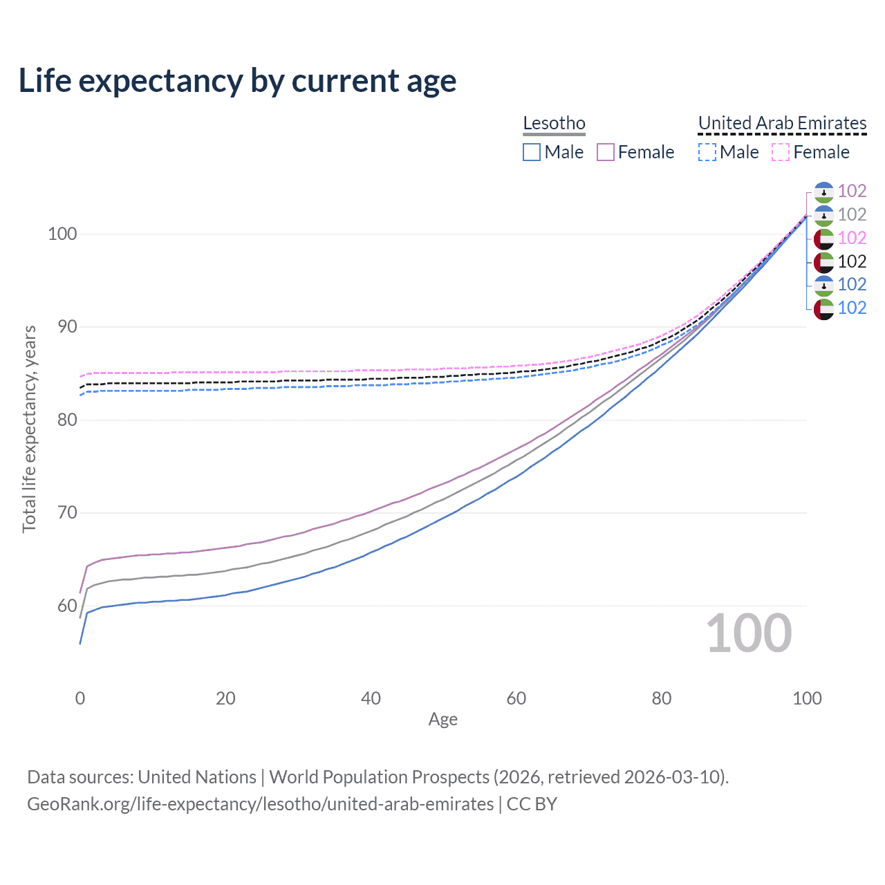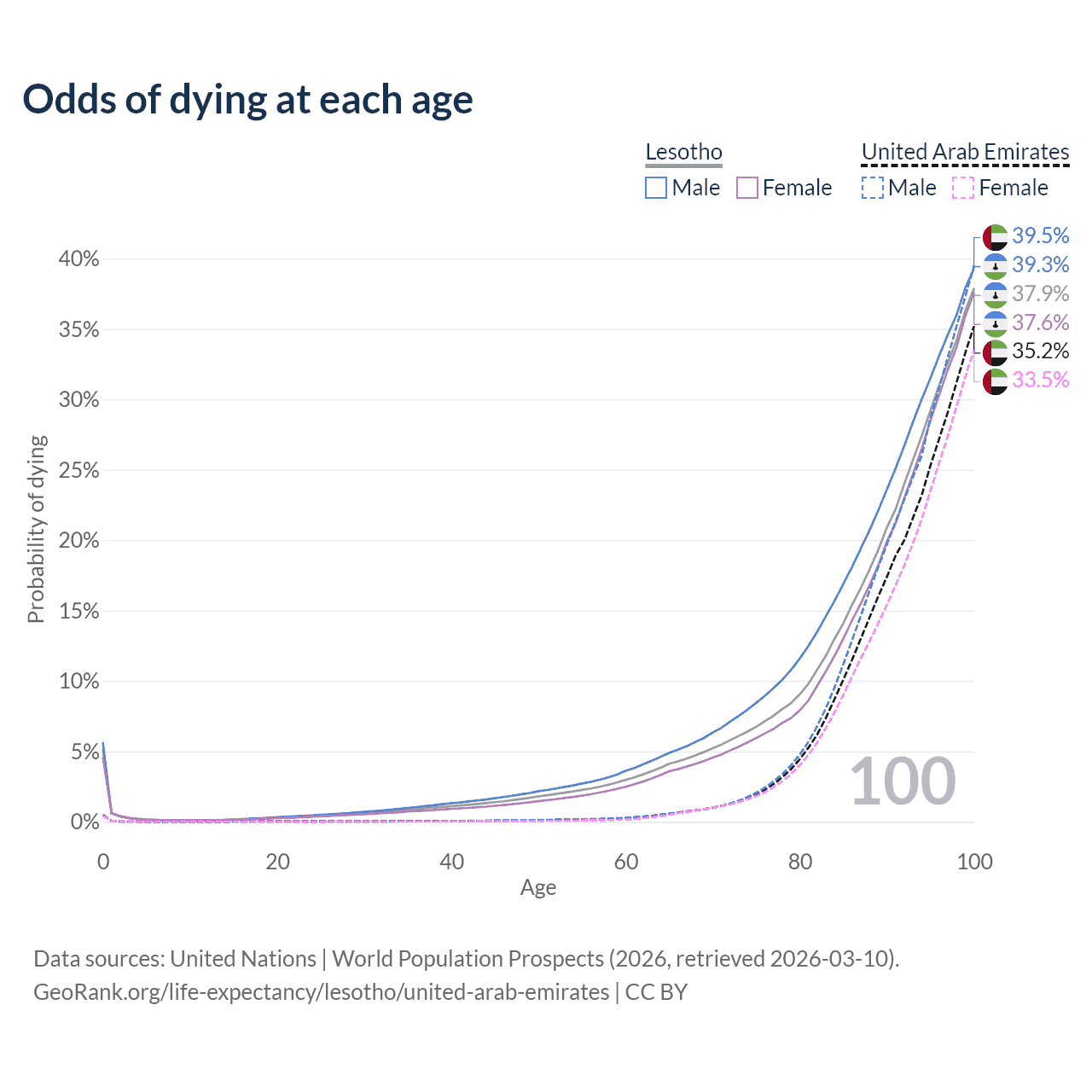 This life expectancy calculator shows the odds of living to 100, 95, 90, and below based on current age for both males and females in Lesotho and the United Arab Emirates, along with mean and median age of death. The calculations are based on the 2026 life tables (actuarial tables) from the UN World Population Prospects.