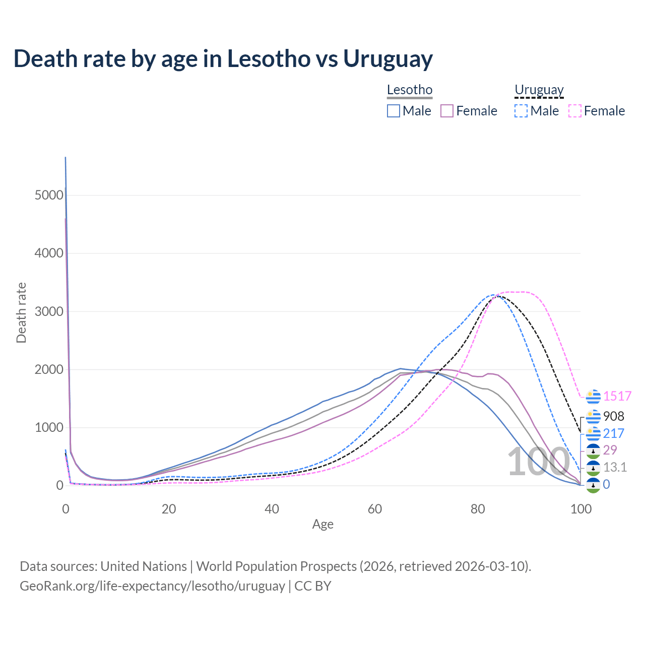 In Lesotho, the most common age of death is 0, compared to 84 in Uruguay. The median age of death is 63.4 in Lesotho and 81.8 in Uruguay, meaning only half of each cohort is expected to live past that age.