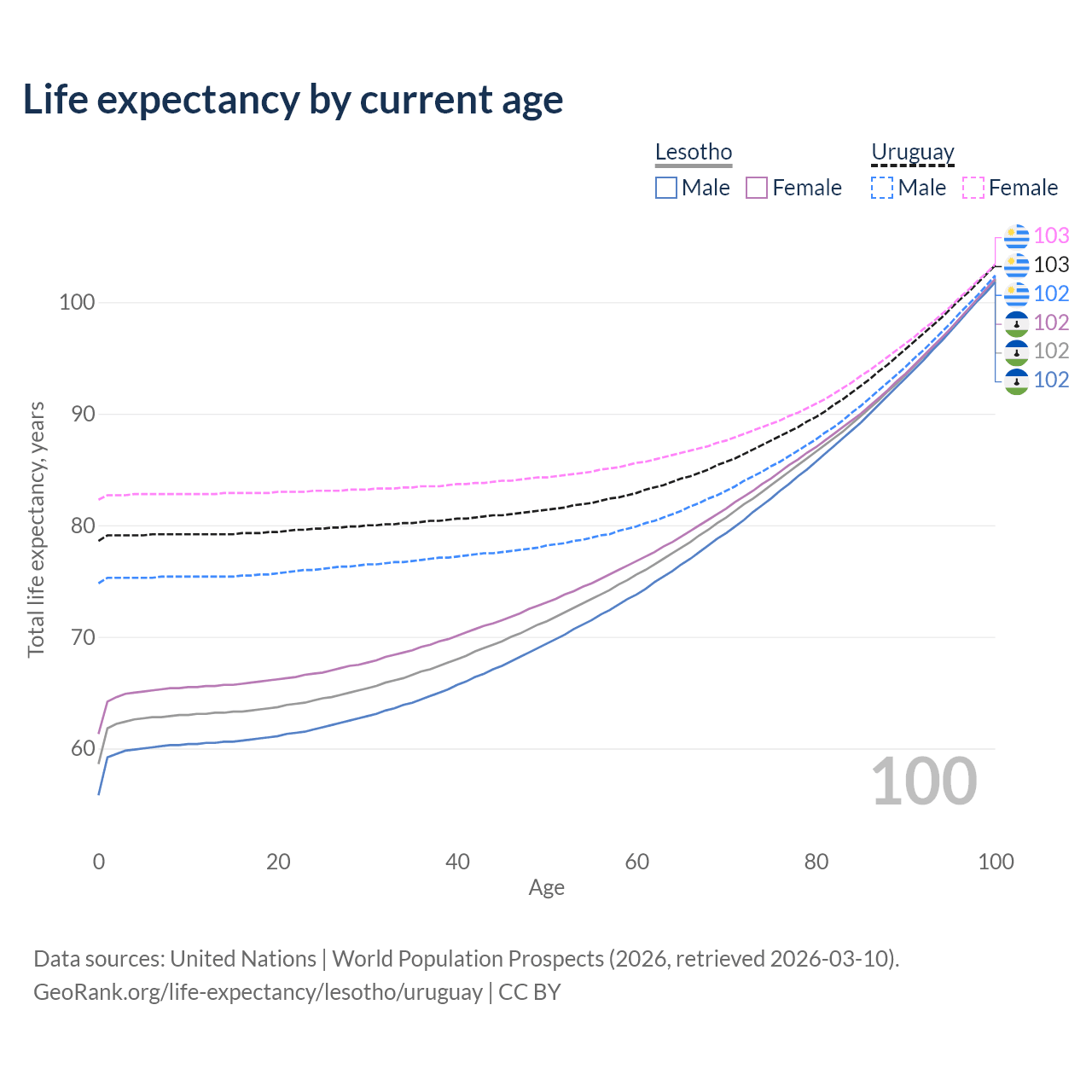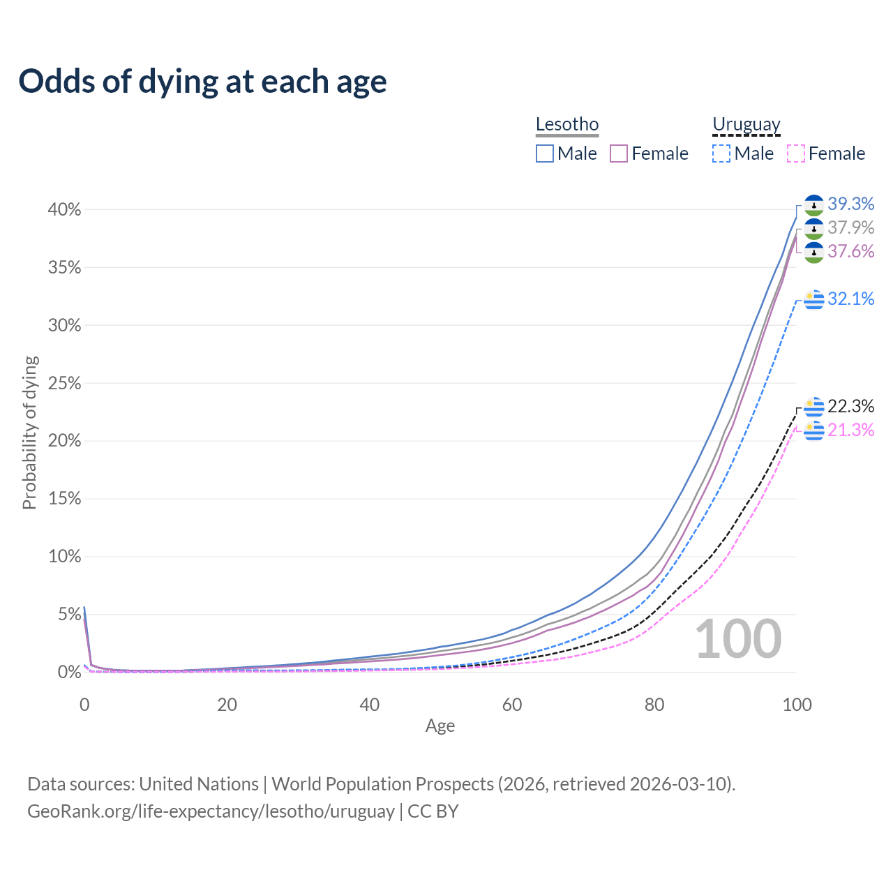 This life expectancy calculator shows the odds of living to 100, 95, 90, and below based on current age for both males and females in Lesotho and Uruguay, along with mean and median age of death. The calculations are based on the 2026 life tables (actuarial tables) from the UN World Population Prospects.