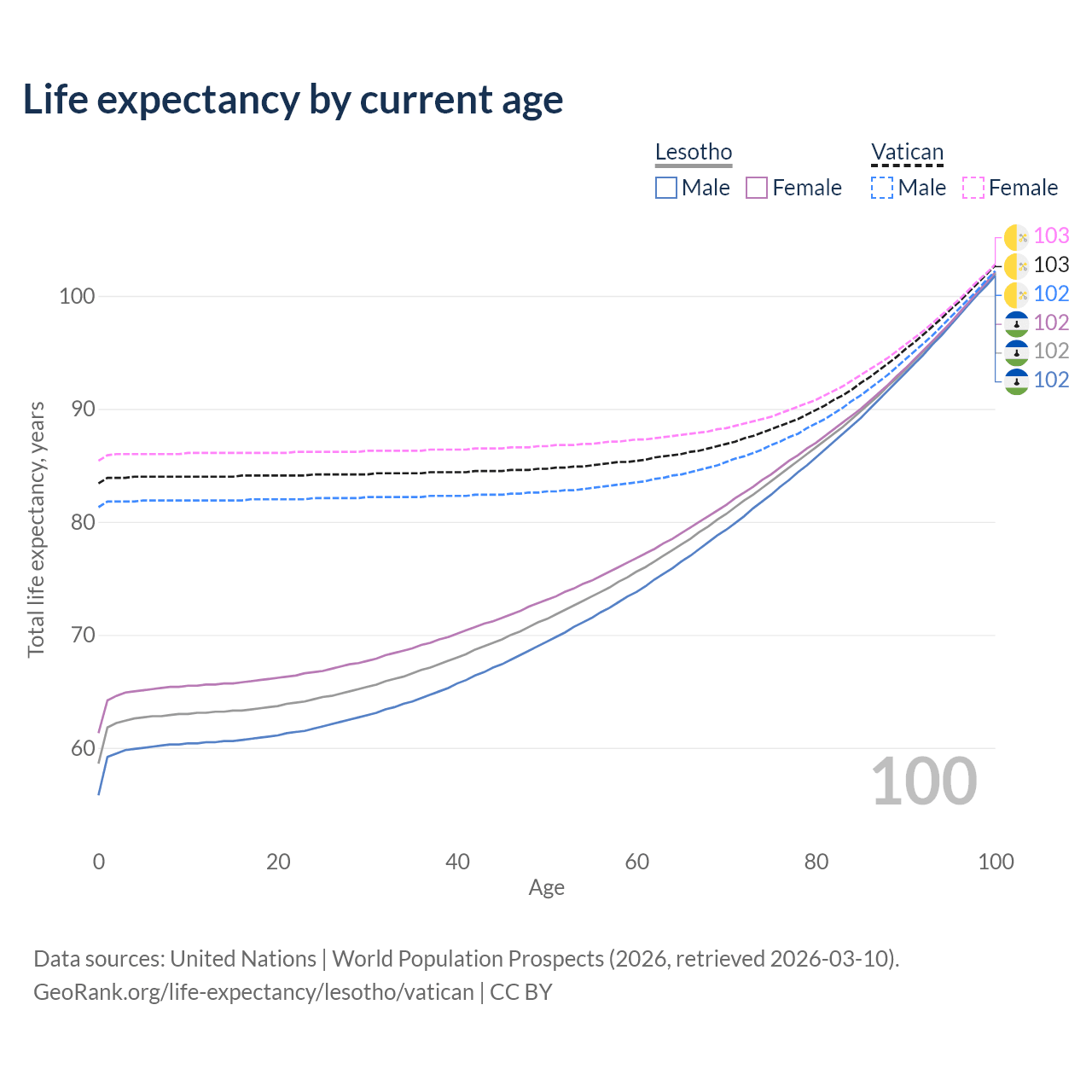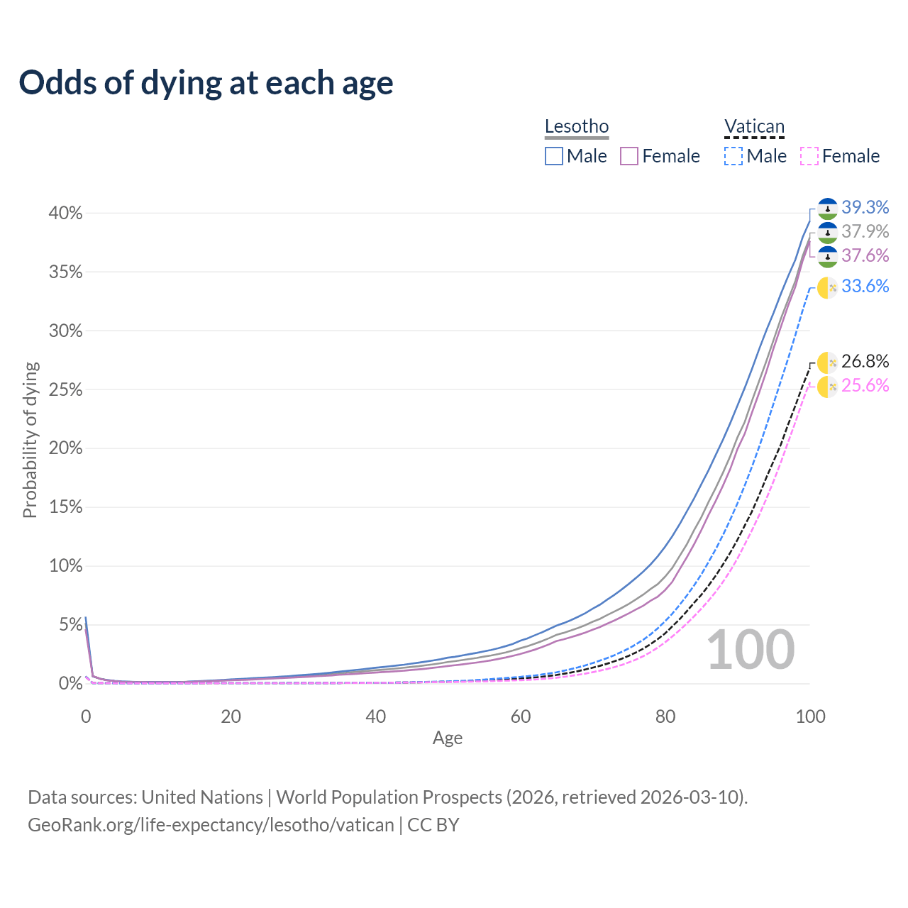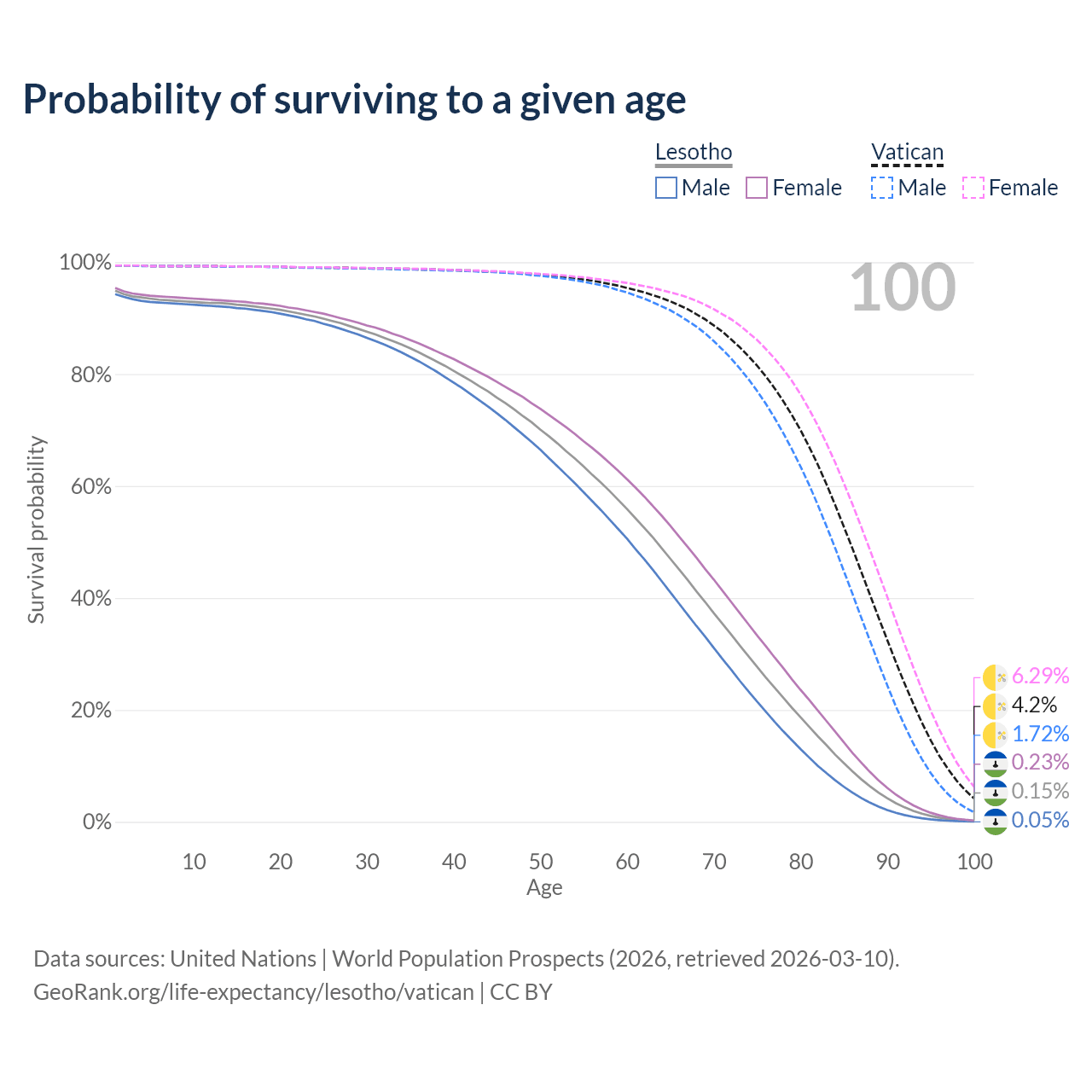 This life expectancy calculator shows the odds of living to 100, 95, 90, and below based on current age for both males and females in Lesotho and the Vatican, along with mean and median age of death. The calculations are based on the 2026 life tables (actuarial tables) from the UN World Population Prospects.