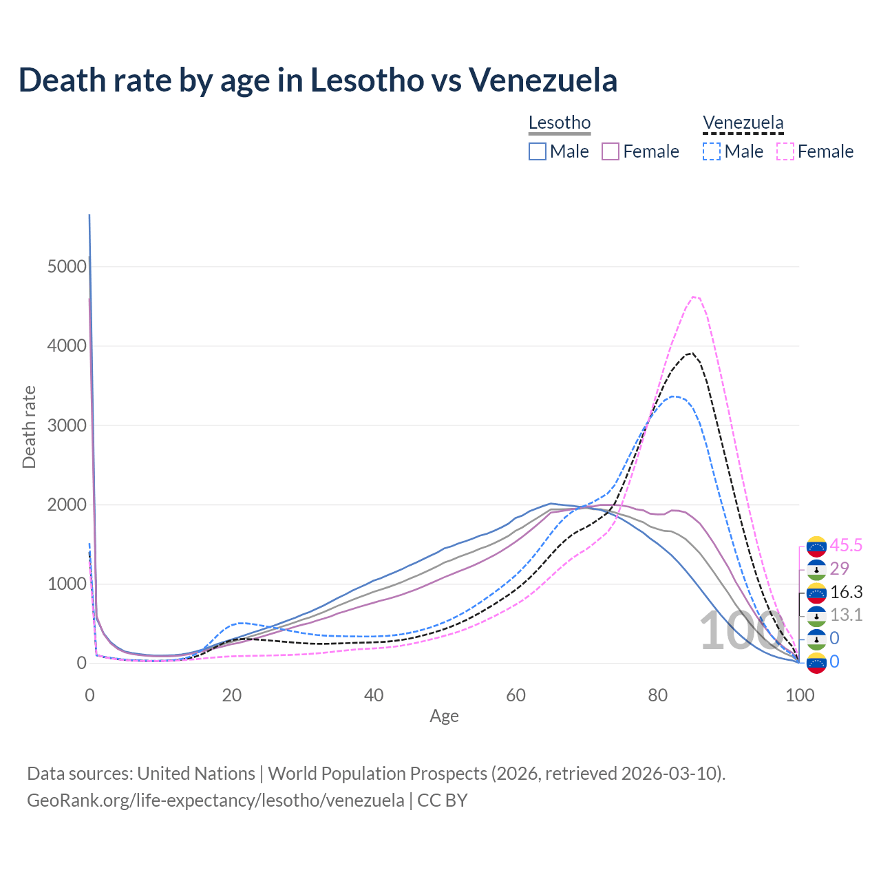 In Lesotho, the most common age of death is 0, compared to 85 in Venezuela. The median age of death is 63.4 in Lesotho and 79 in Venezuela, meaning only half of each cohort is expected to live past that age.