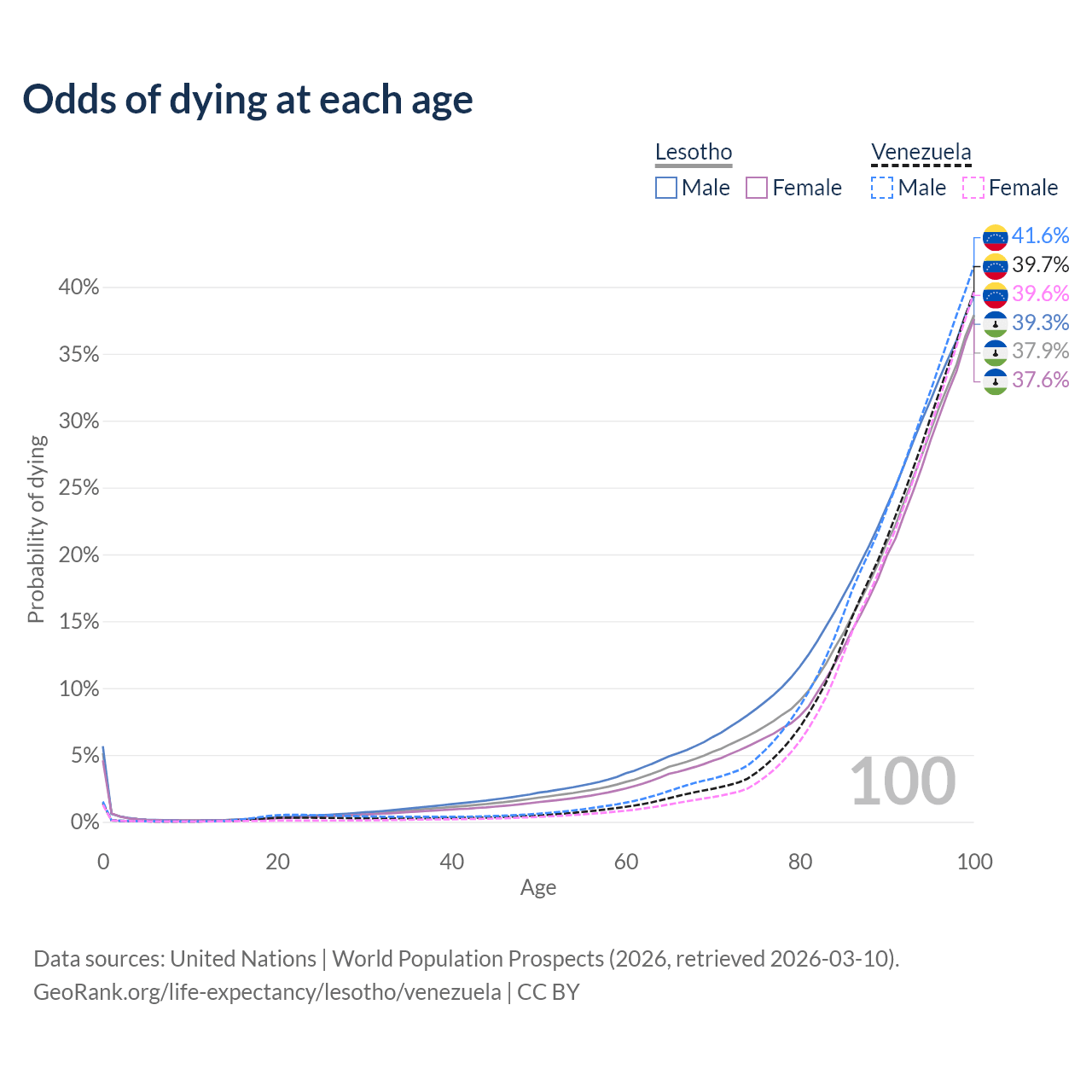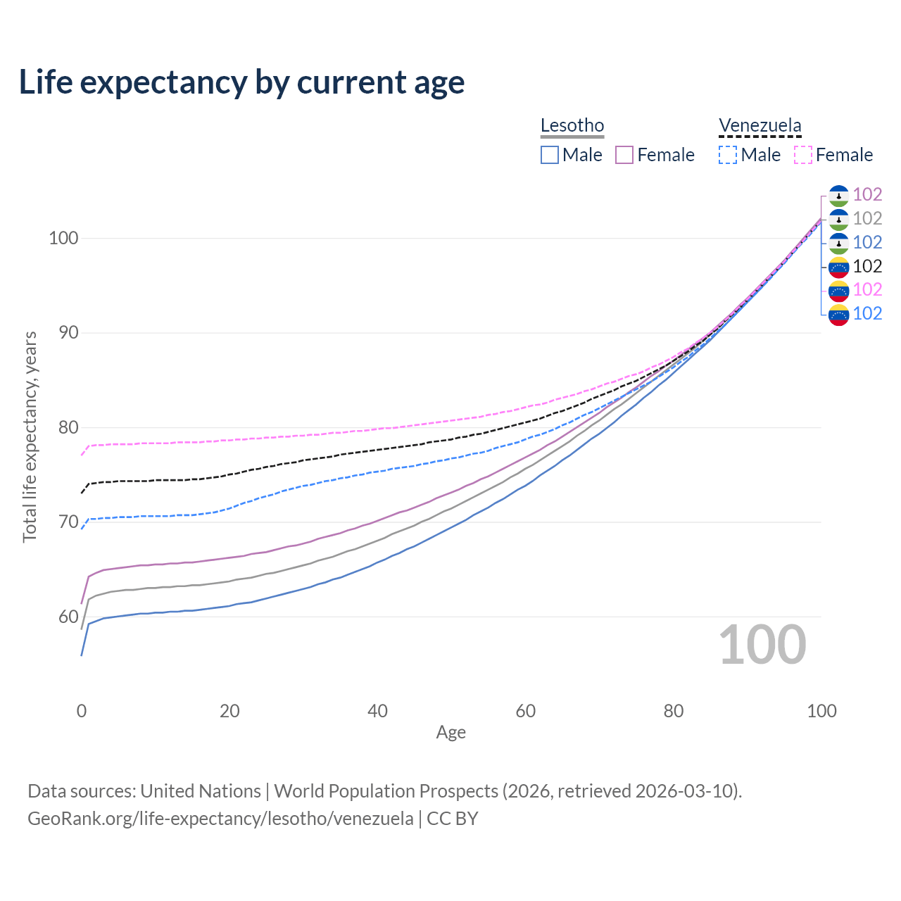 This life expectancy calculator shows the odds of living to 100, 95, 90, and below based on current age for both males and females in Lesotho and Venezuela, along with mean and median age of death. The calculations are based on the 2026 life tables (actuarial tables) from the UN World Population Prospects.