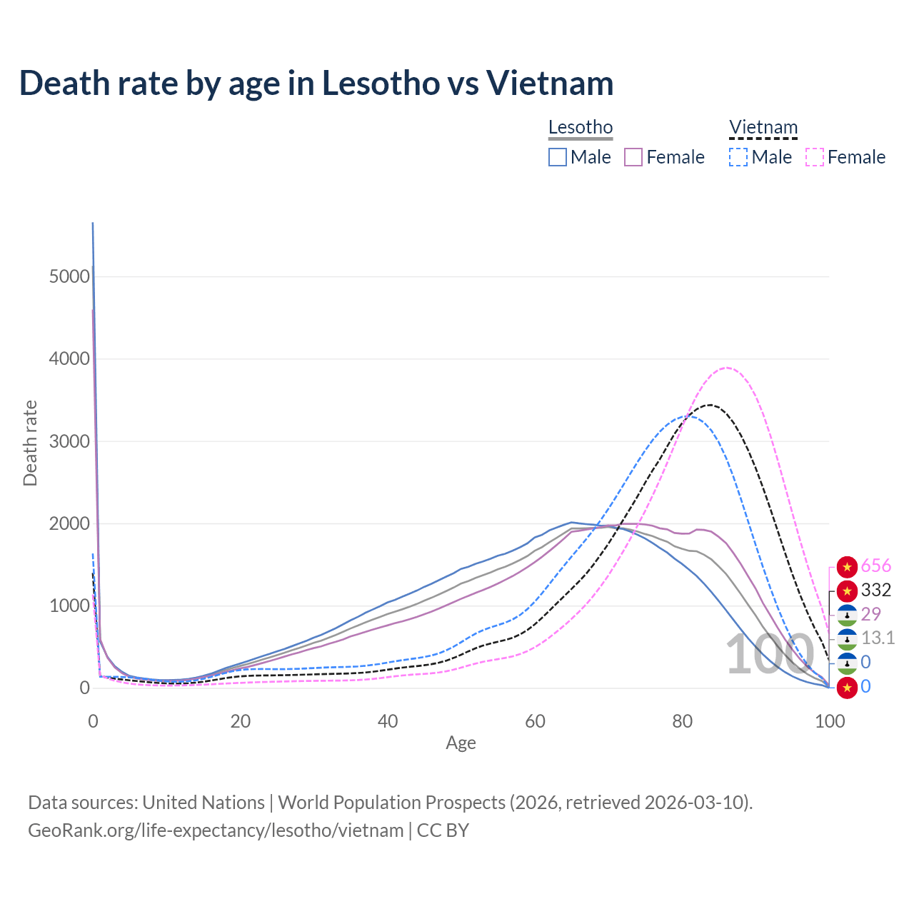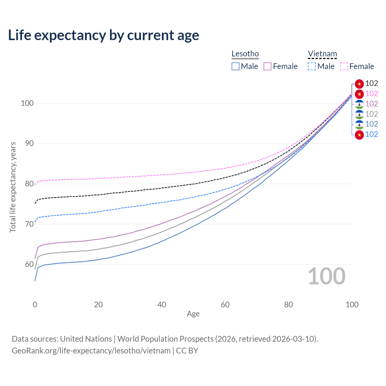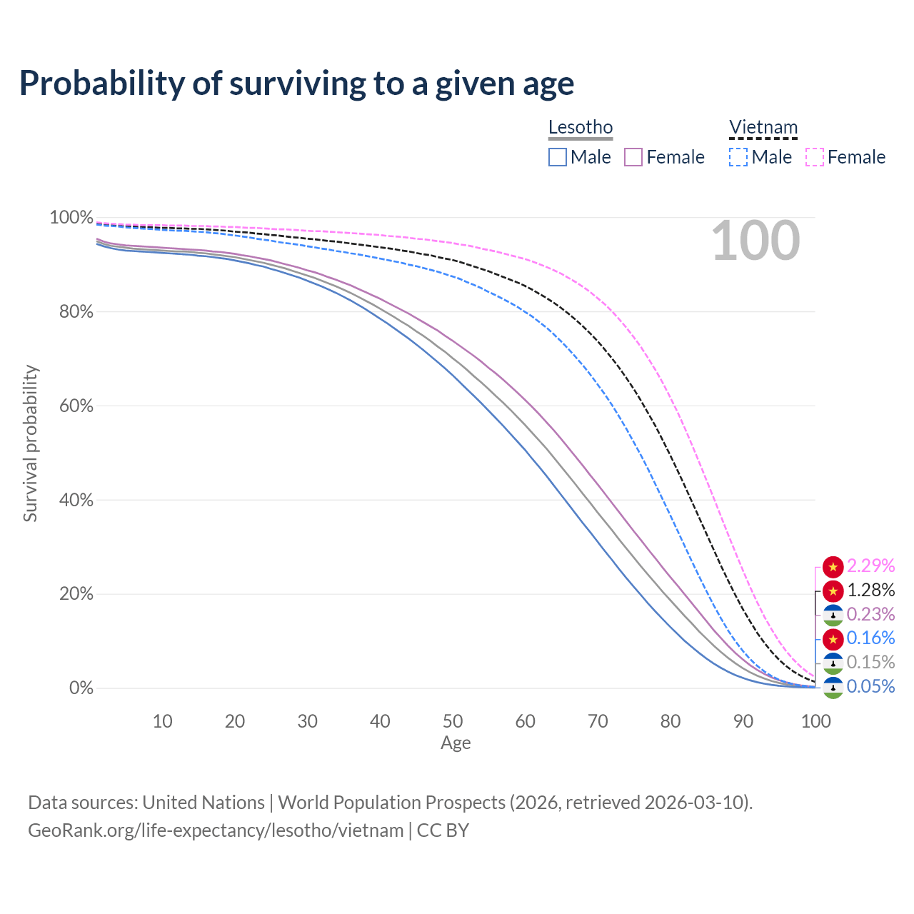 This life expectancy calculator shows the odds of living to 100, 95, 90, and below based on current age for both males and females in Lesotho and Vietnam, along with mean and median age of death. The calculations are based on the 2026 life tables (actuarial tables) from the UN World Population Prospects.