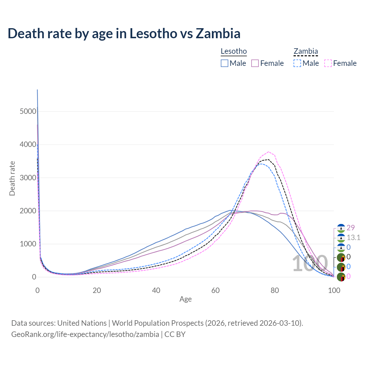 In Lesotho, the most common age of death is 0, compared to 0 in Zambia. The median age of death is 63.4 in Lesotho and 73.1 in Zambia, meaning only half of each cohort is expected to live past that age.