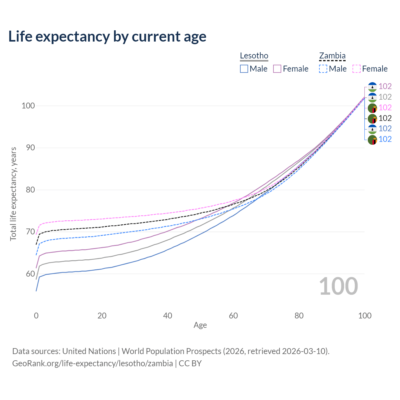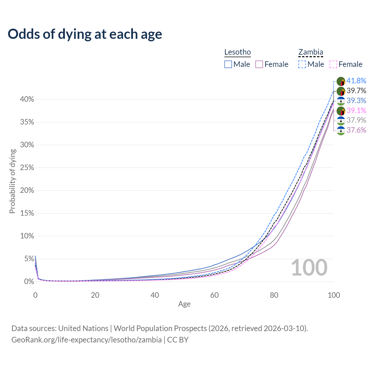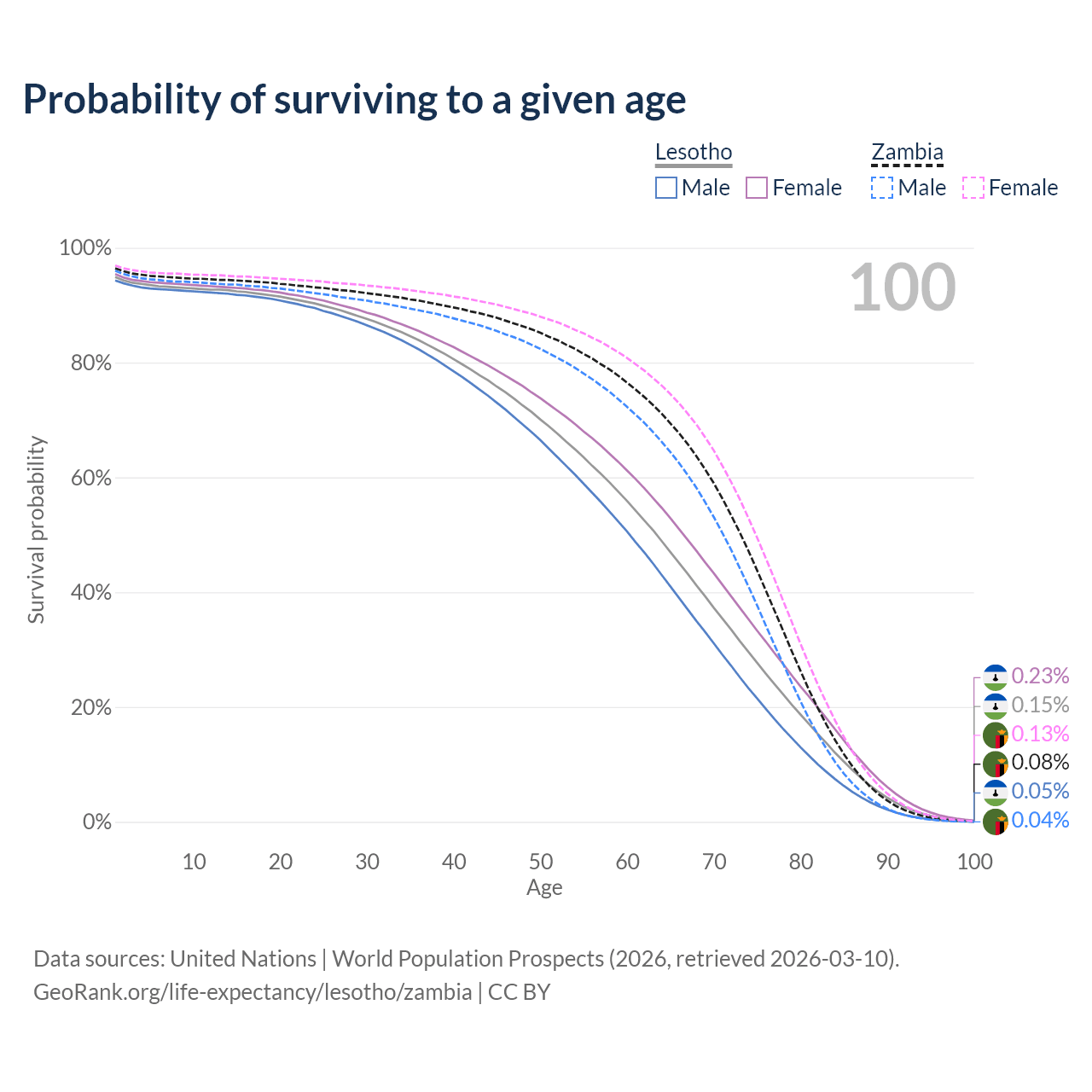 This life expectancy calculator shows the odds of living to 100, 95, 90, and below based on current age for both males and females in Lesotho and Zambia, along with mean and median age of death. The calculations are based on the 2026 life tables (actuarial tables) from the UN World Population Prospects.