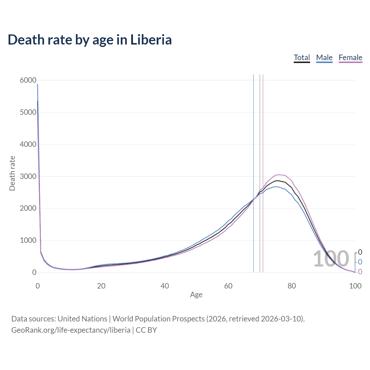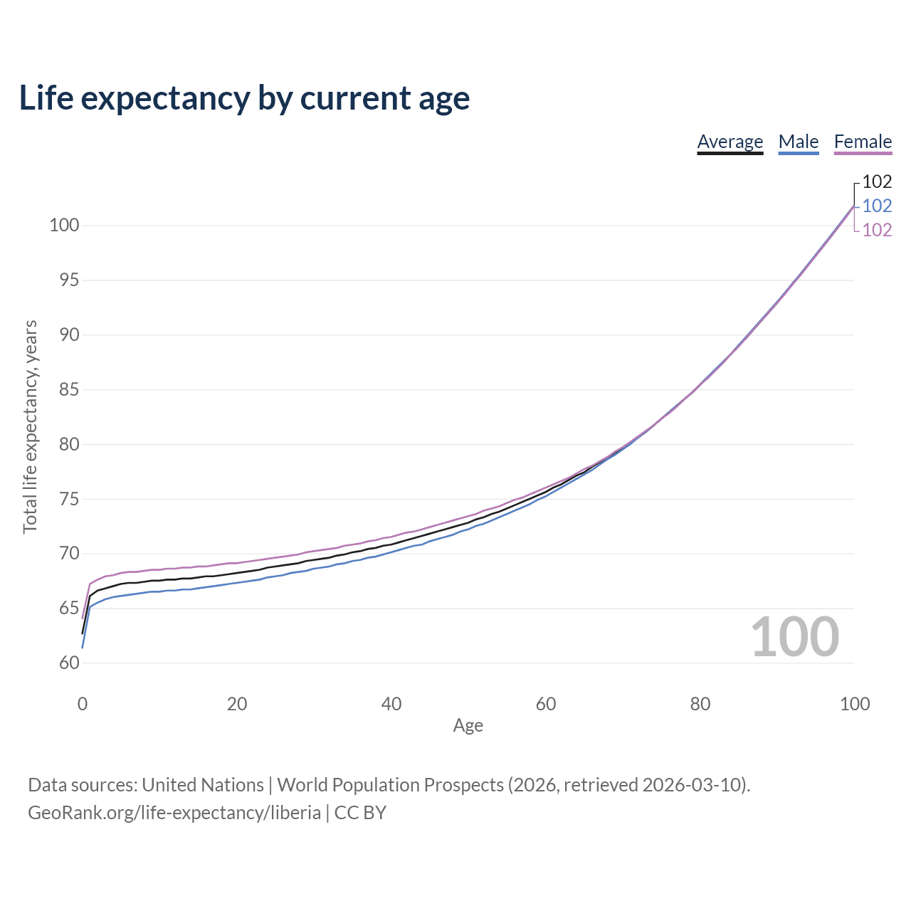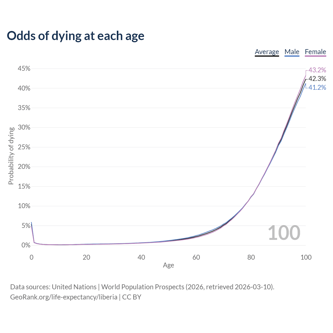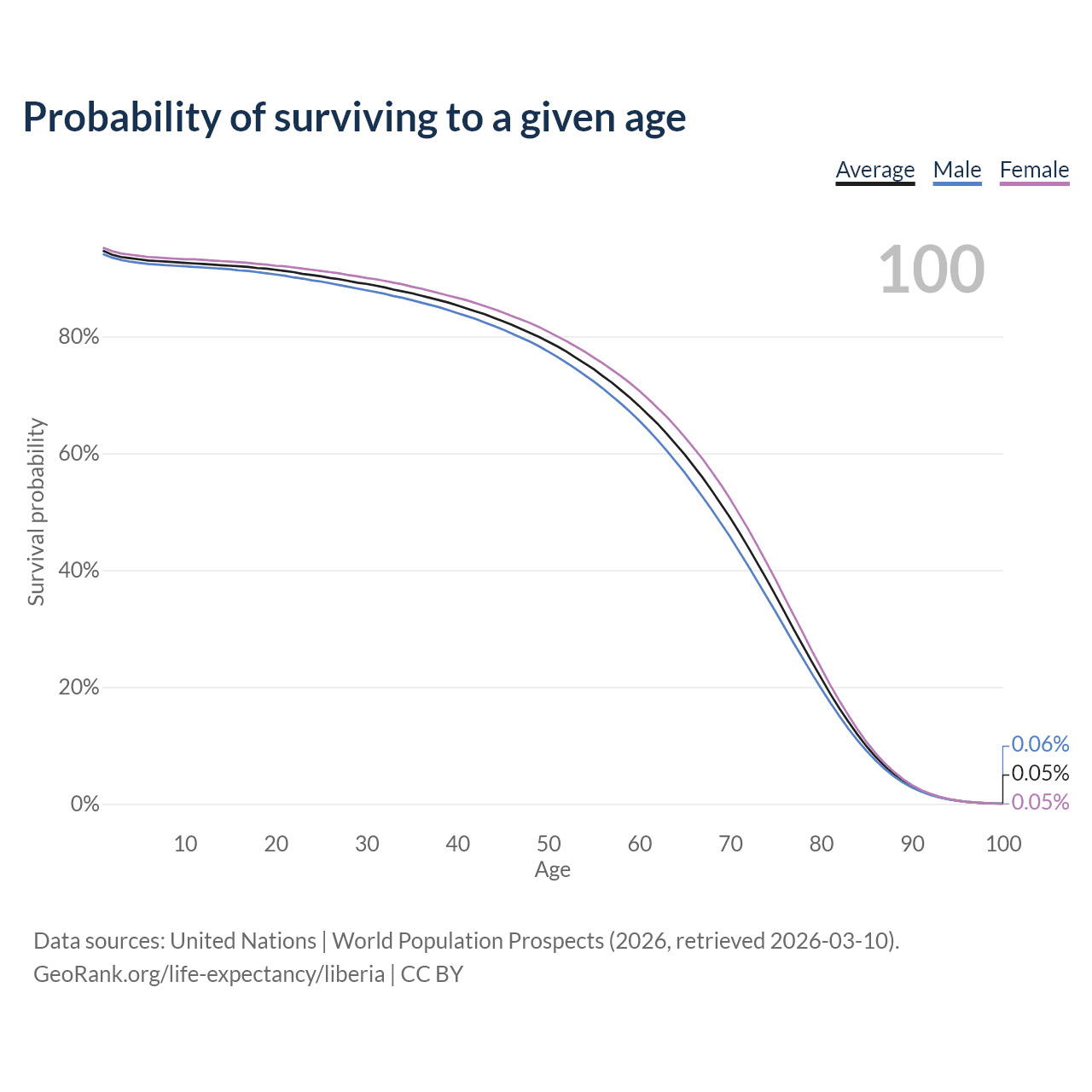 This life expectancy calculator shows the odds of living to 100, 95, 90, and below based on current age for both males and females in Liberia, along with mean and median age of death. The calculations are based on the 2026 life tables (actuarial tables) from the UN World Population Prospects.