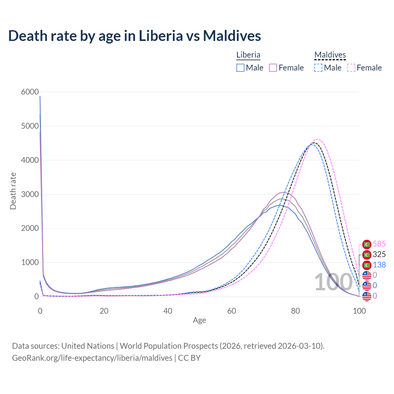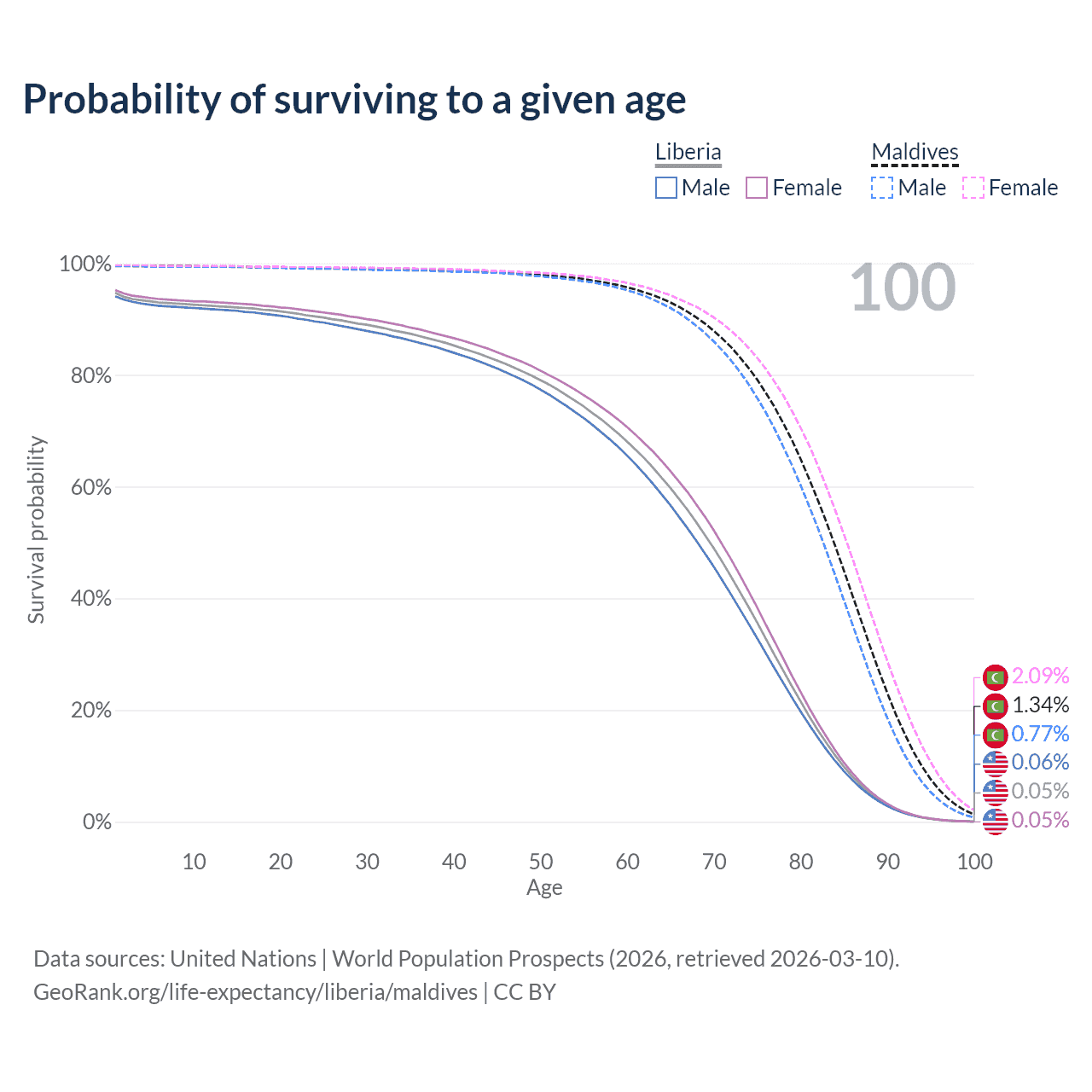 This life expectancy calculator shows the odds of living to 100, 95, 90, and below based on current age for both males and females in Liberia and Maldives, along with mean and median age of death. The calculations are based on the 2026 life tables (actuarial tables) from the UN World Population Prospects.