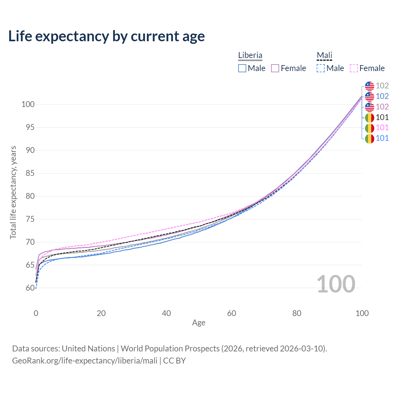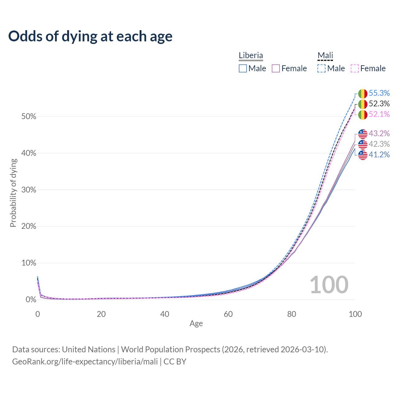 This life expectancy calculator shows the odds of living to 100, 95, 90, and below based on current age for both males and females in Liberia and Mali, along with mean and median age of death. The calculations are based on the 2026 life tables (actuarial tables) from the UN World Population Prospects.