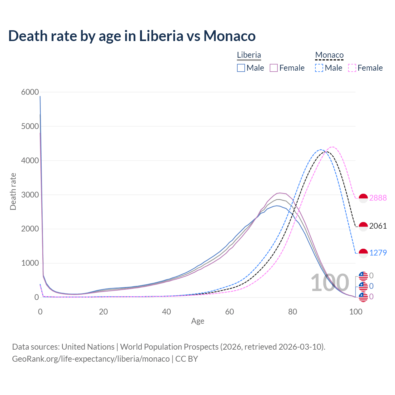 In Liberia, the most common age of death is 0, compared to 91 in Monaco. The median age of death is 69.6 in Liberia and 88.7 in Monaco, meaning only half of each cohort is expected to live past that age.