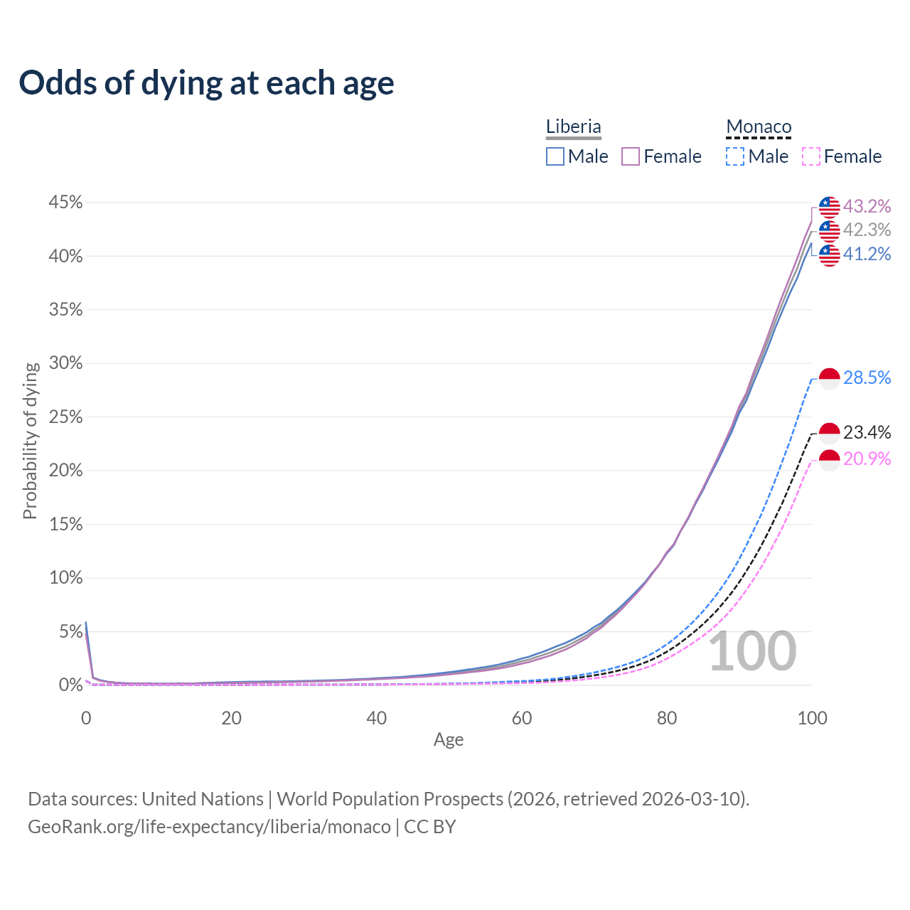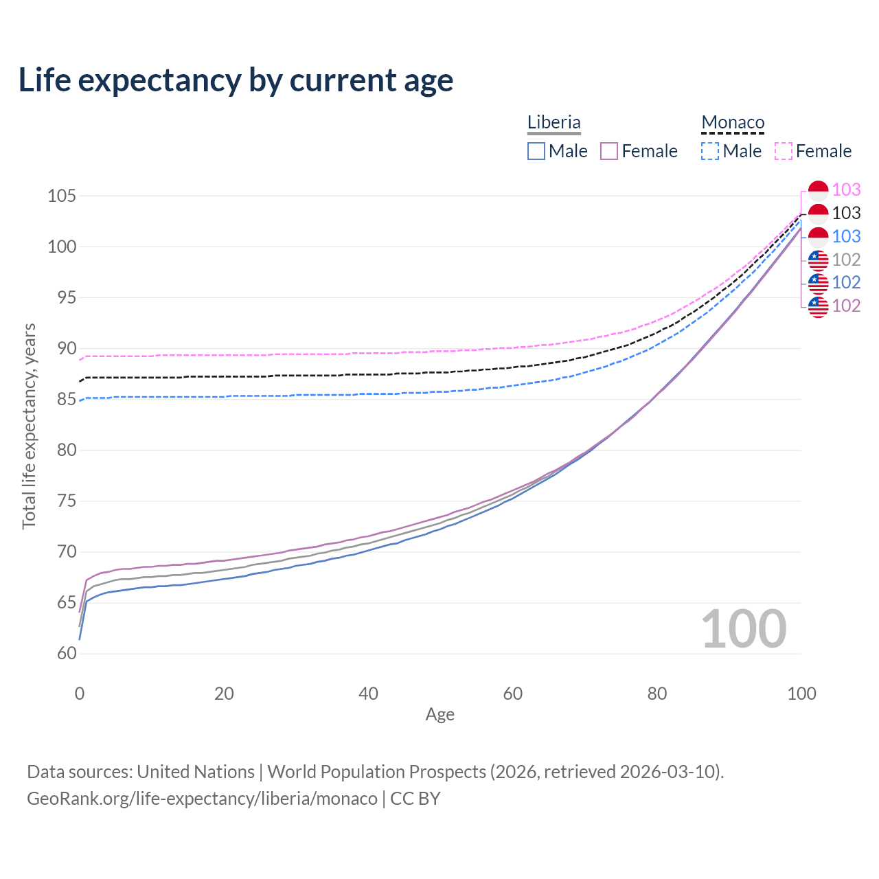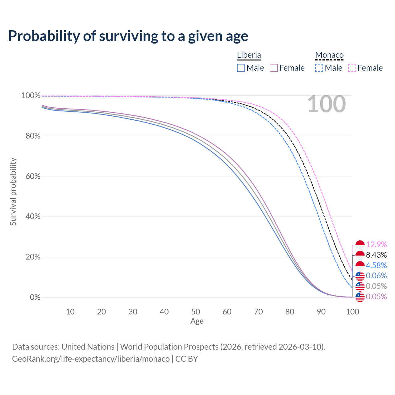 This life expectancy calculator shows the odds of living to 100, 95, 90, and below based on current age for both males and females in Liberia and Monaco, along with mean and median age of death. The calculations are based on the 2026 life tables (actuarial tables) from the UN World Population Prospects.