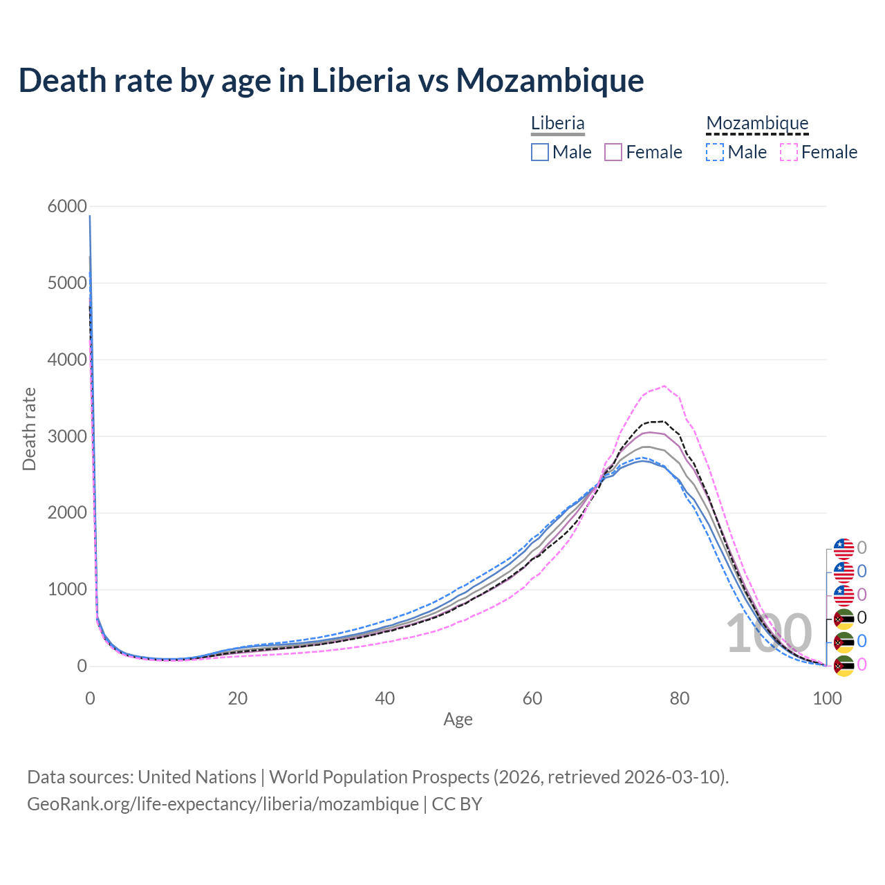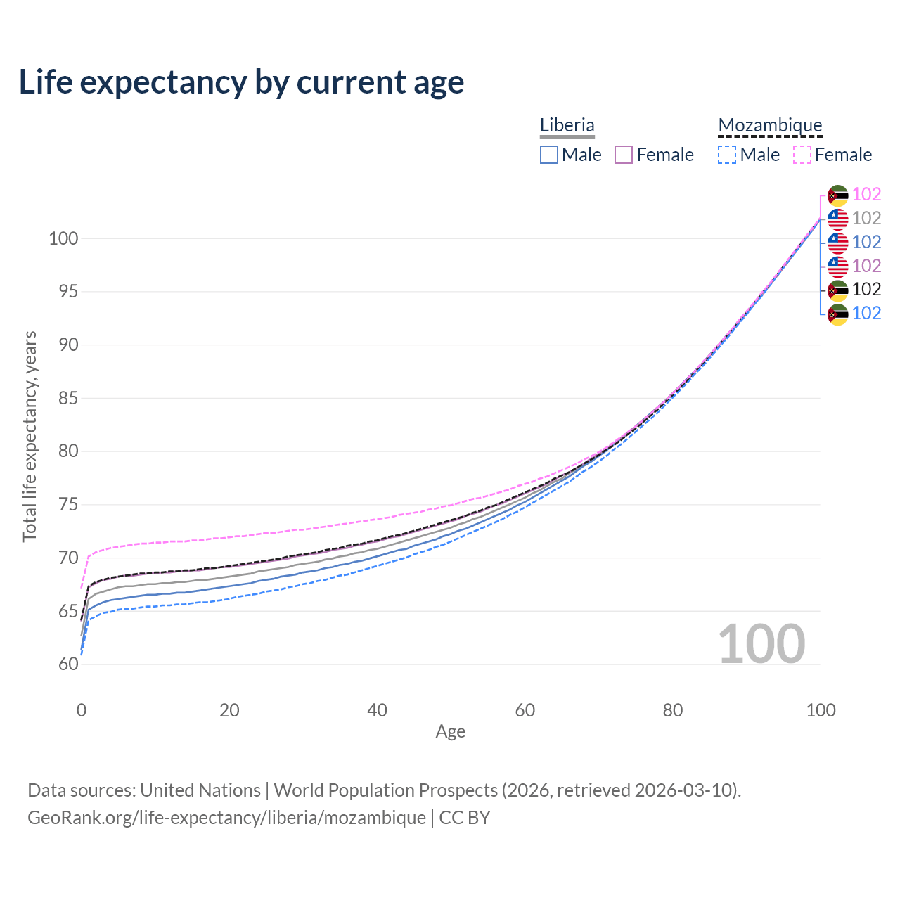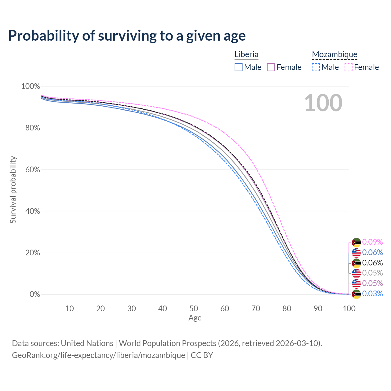 This life expectancy calculator shows the odds of living to 100, 95, 90, and below based on current age for both males and females in Liberia and Mozambique, along with mean and median age of death. The calculations are based on the 2026 life tables (actuarial tables) from the UN World Population Prospects.