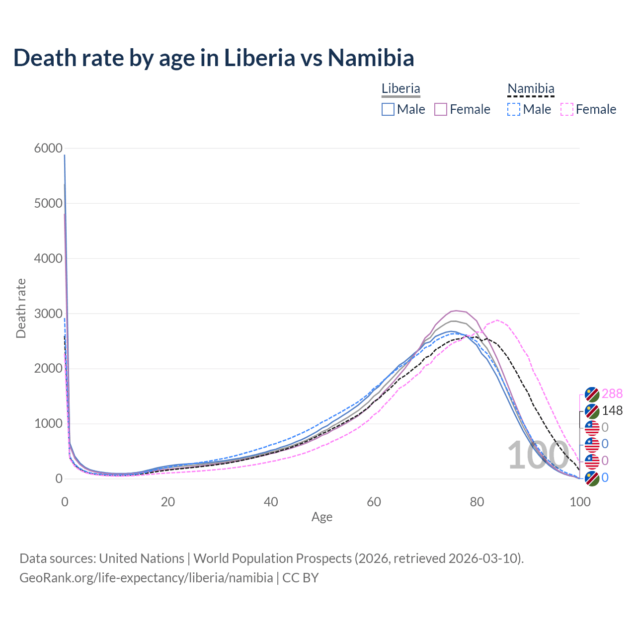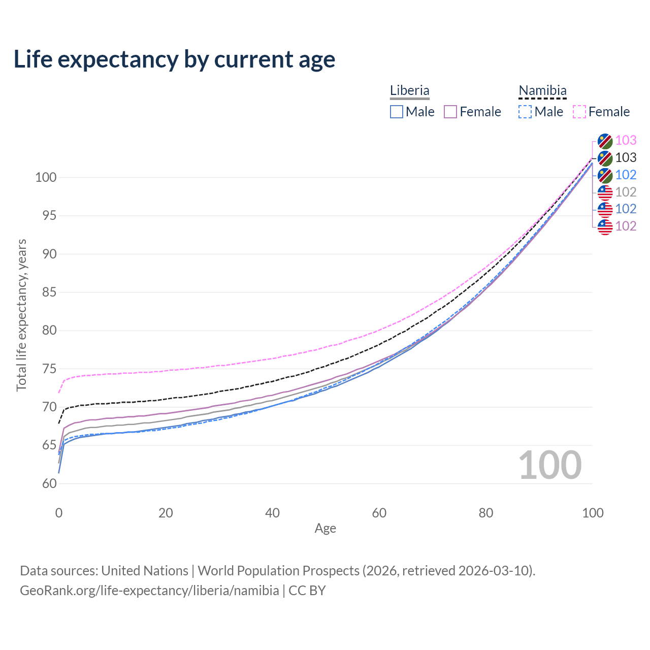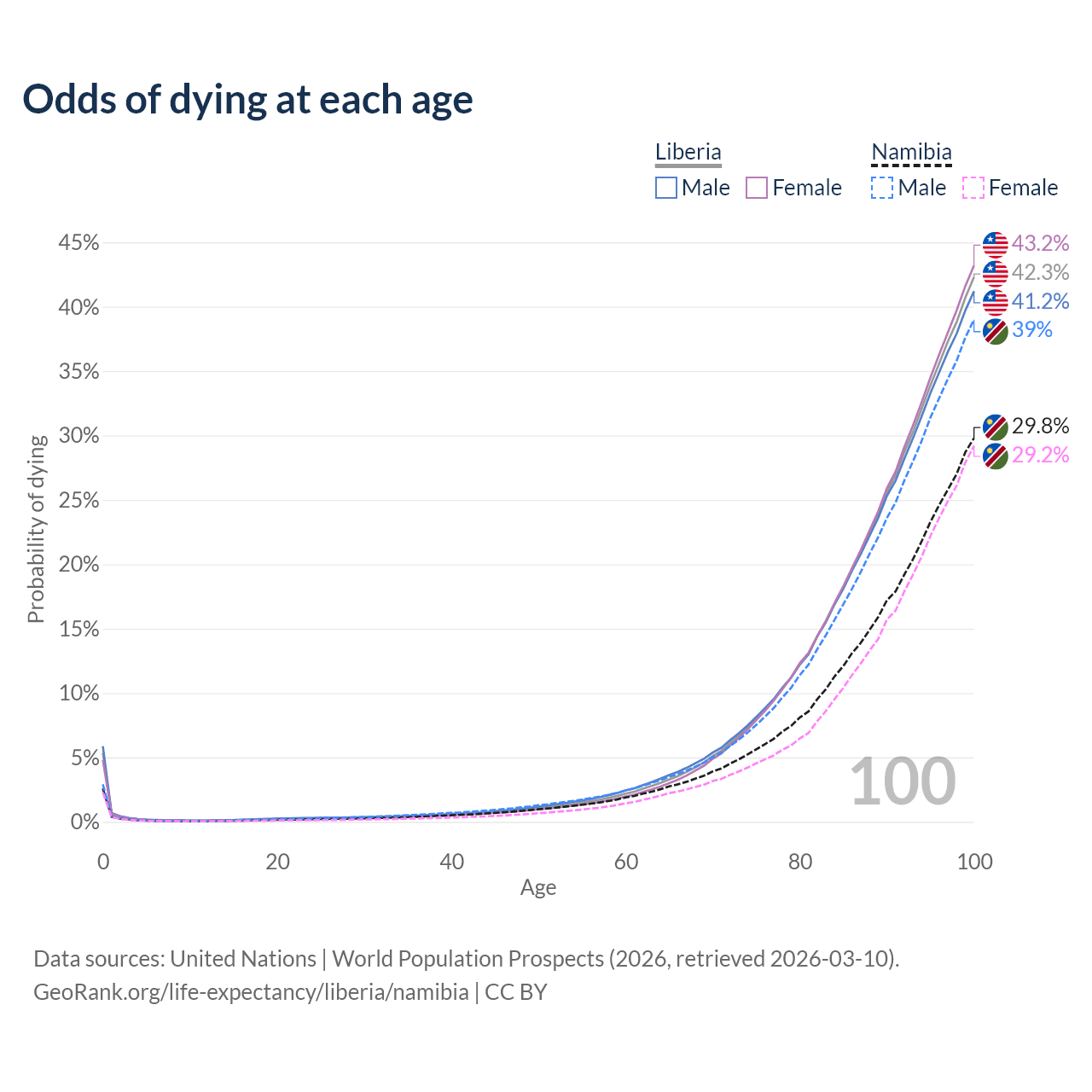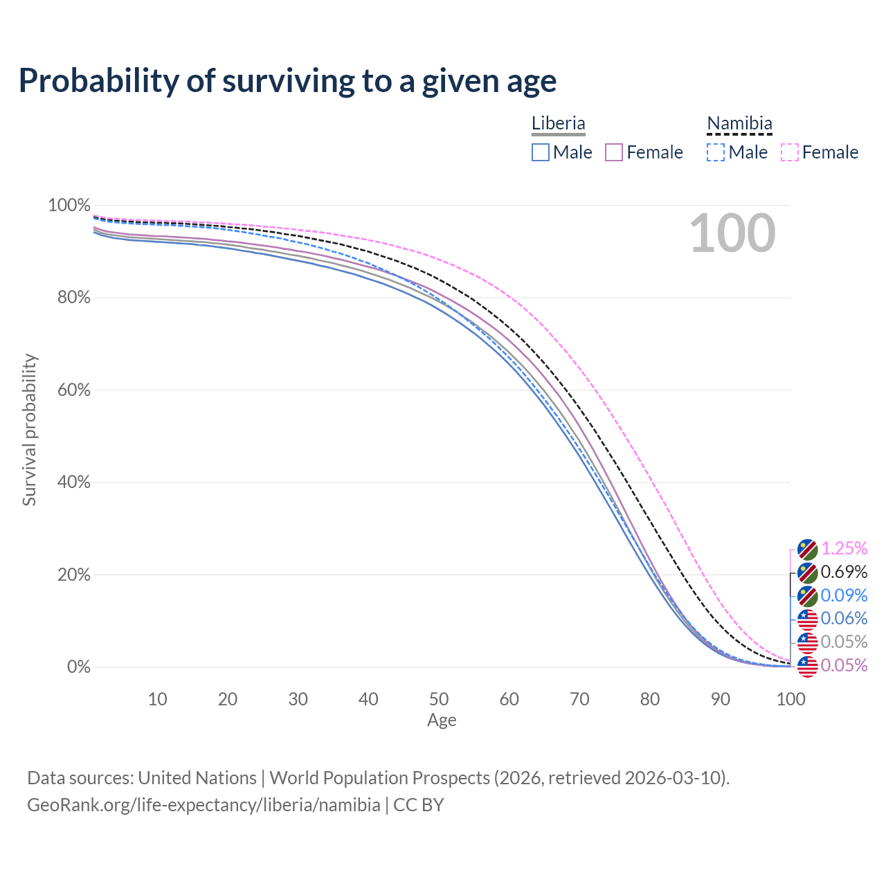 This life expectancy calculator shows the odds of living to 100, 95, 90, and below based on current age for both males and females in Liberia and Namibia, along with mean and median age of death. The calculations are based on the 2026 life tables (actuarial tables) from the UN World Population Prospects.