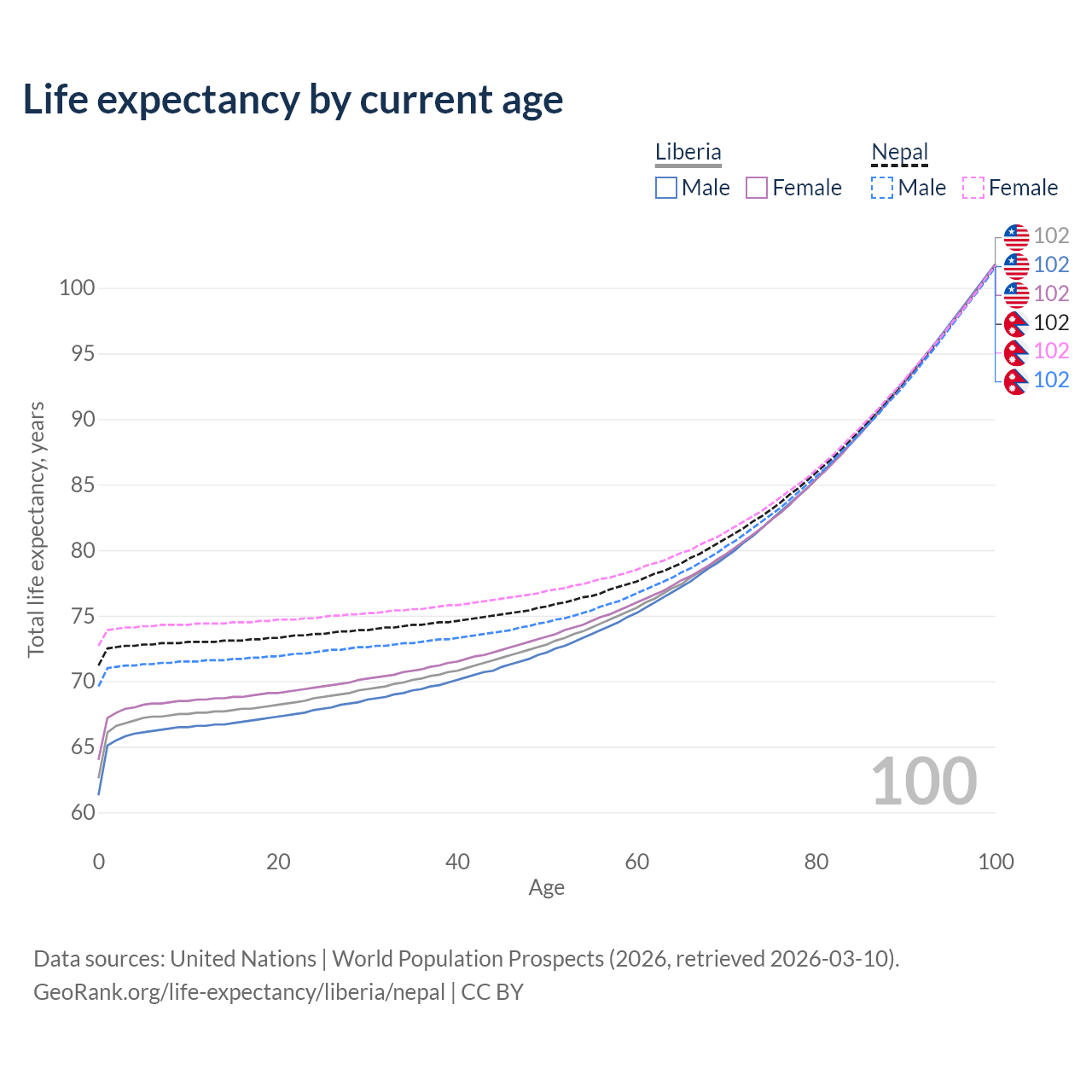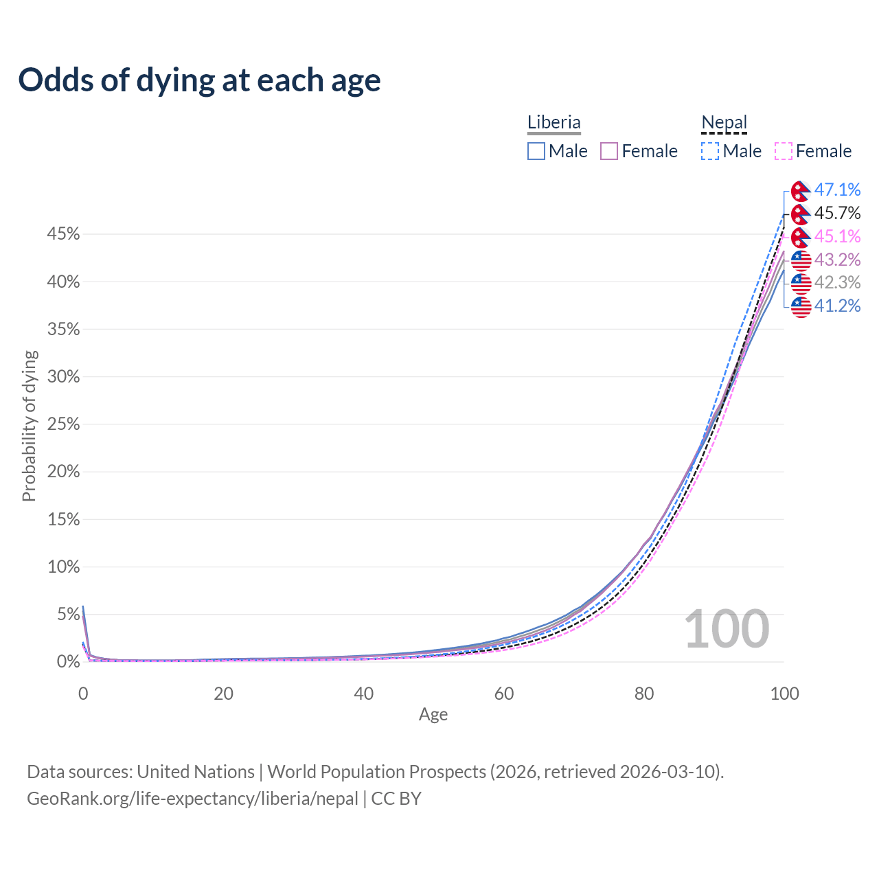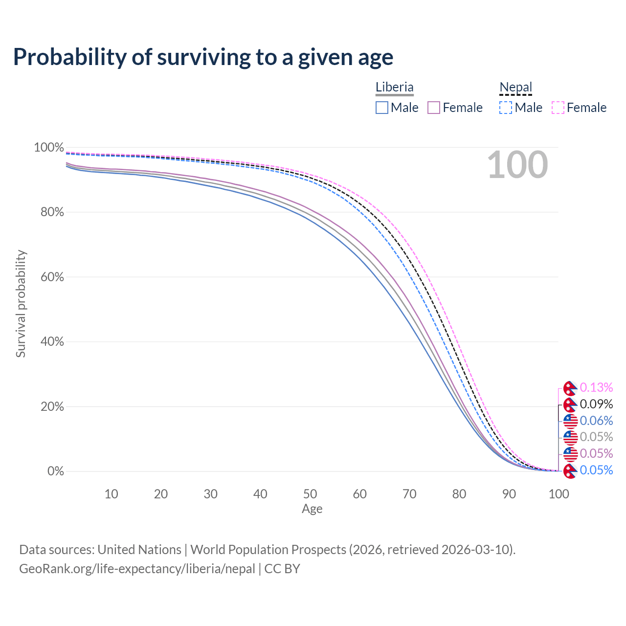 This life expectancy calculator shows the odds of living to 100, 95, 90, and below based on current age for both males and females in Liberia and Nepal, along with mean and median age of death. The calculations are based on the 2026 life tables (actuarial tables) from the UN World Population Prospects.