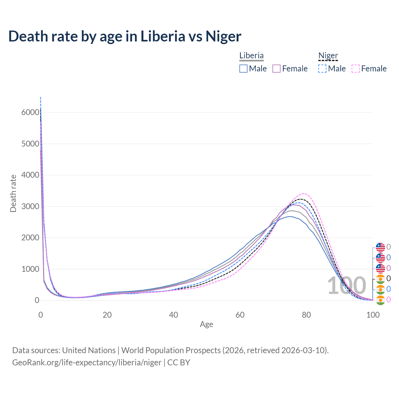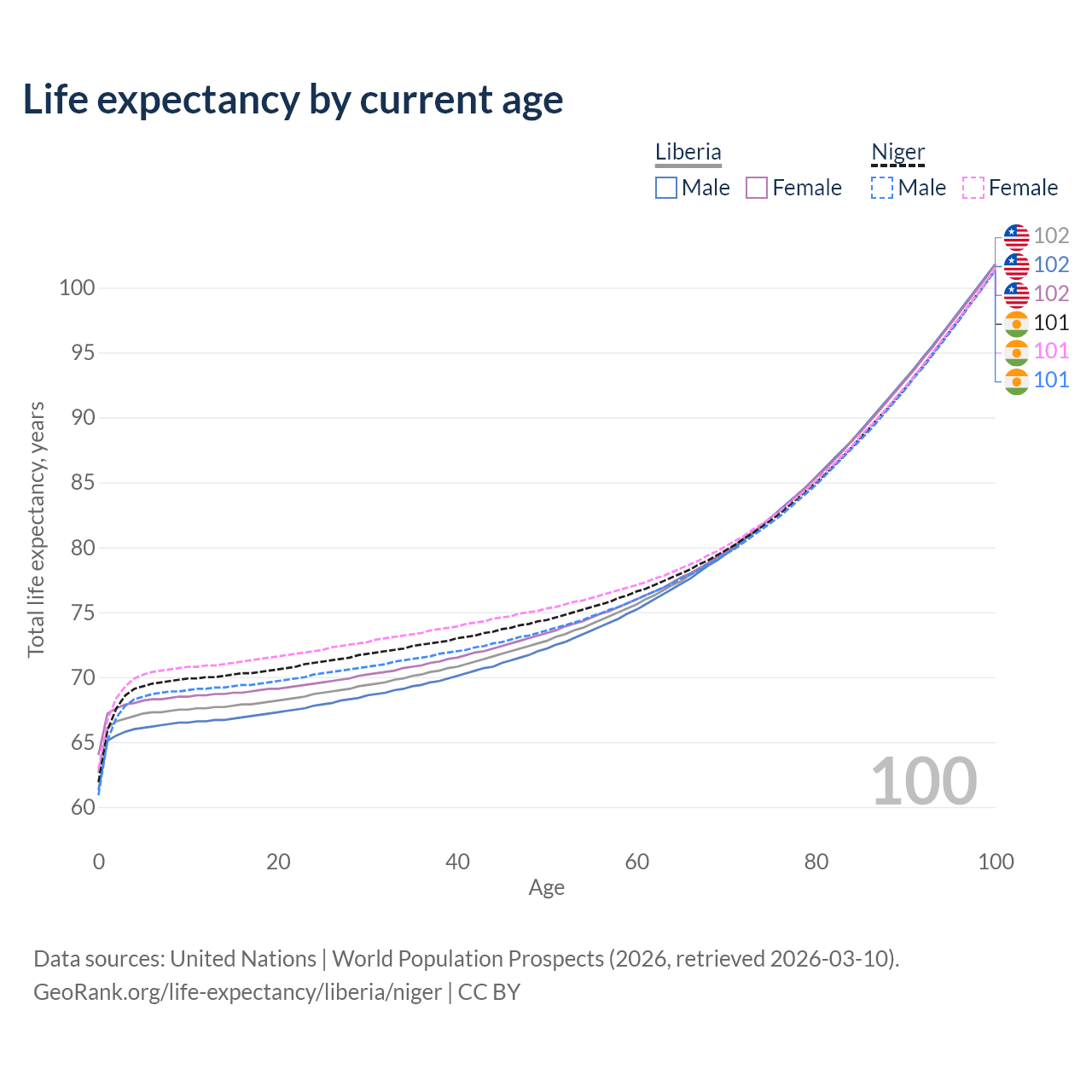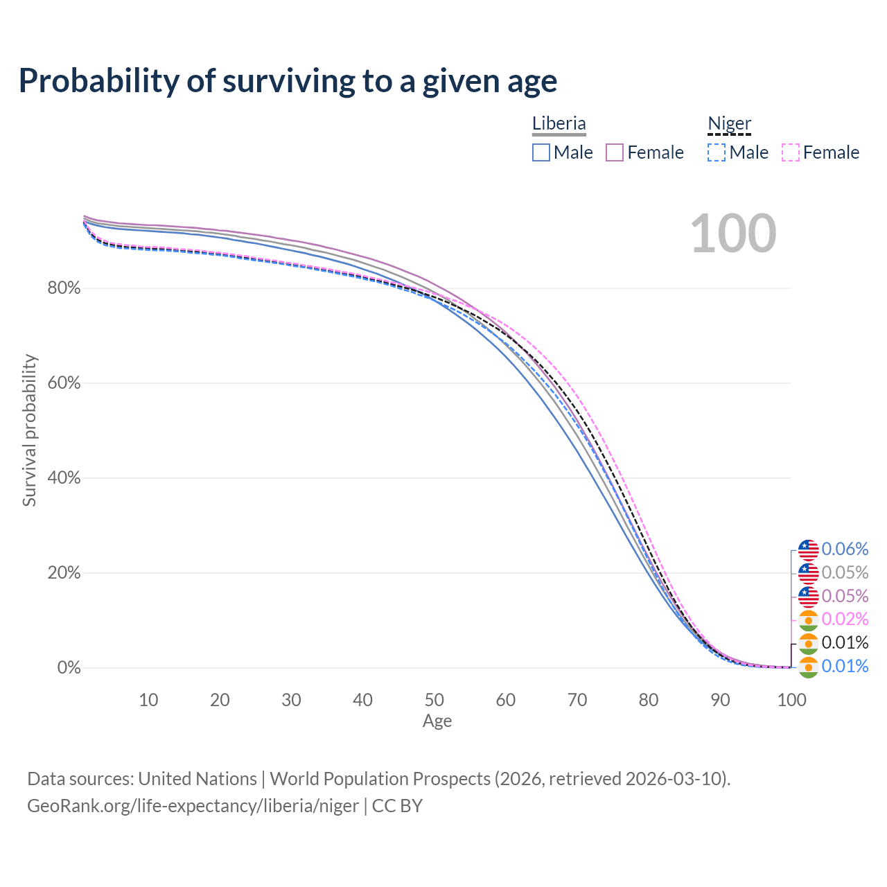 This life expectancy calculator shows the odds of living to 100, 95, 90, and below based on current age for both males and females in Liberia and Niger, along with mean and median age of death. The calculations are based on the 2026 life tables (actuarial tables) from the UN World Population Prospects.
