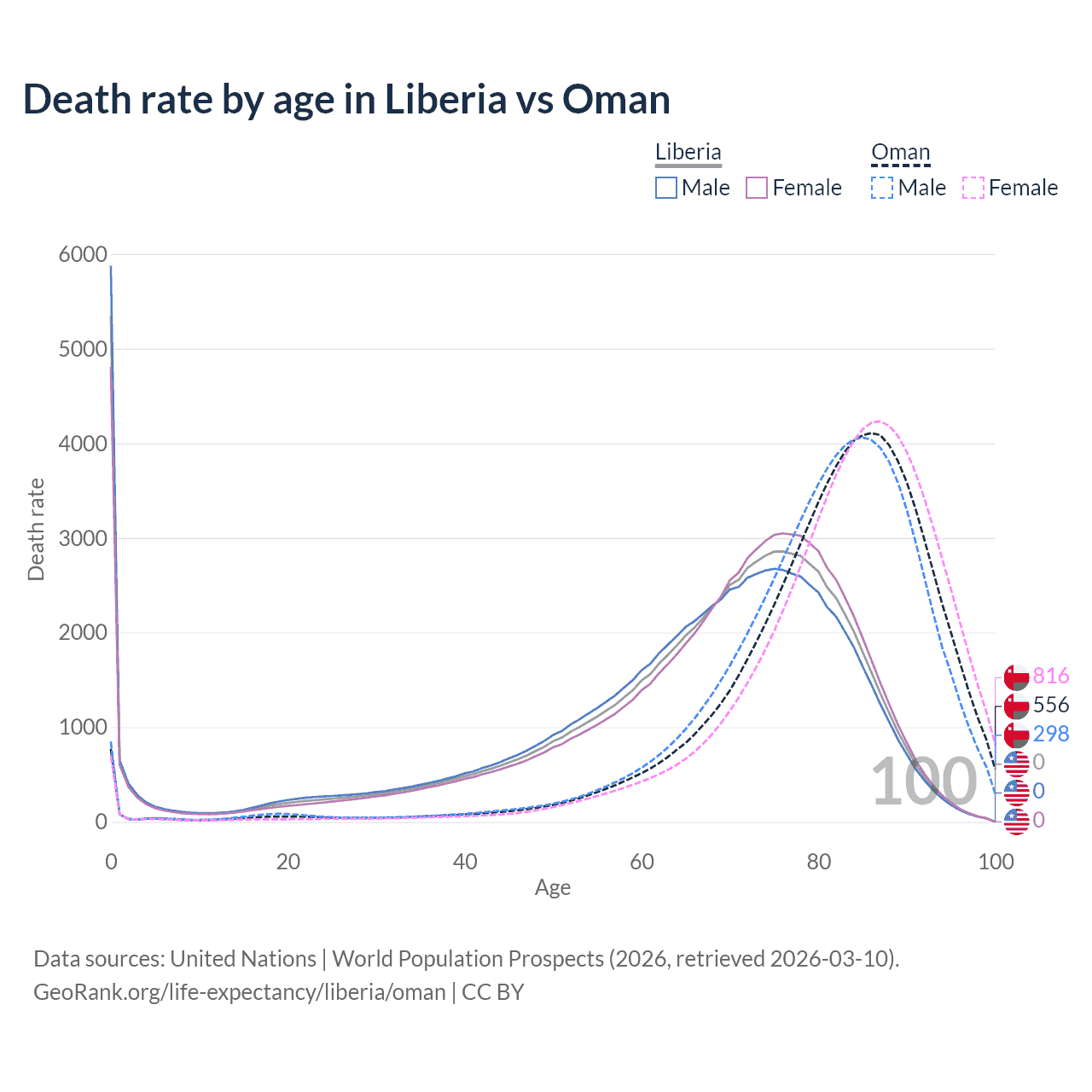 This life expectancy calculator shows the odds of living to 100, 95, 90, and below based on current age for both males and females in Liberia and Oman, along with mean and median age of death. The calculations are based on the 2026 life tables (actuarial tables) from the UN World Population Prospects.