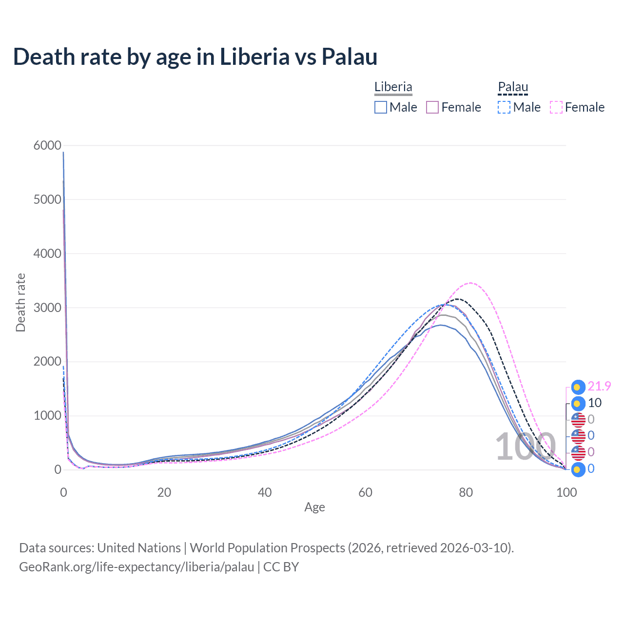 In Liberia, the most common age of death is 0, compared to 78 in Palau. The median age of death is 69.6 in Liberia and 73.8 in Palau, meaning only half of each cohort is expected to live past that age.