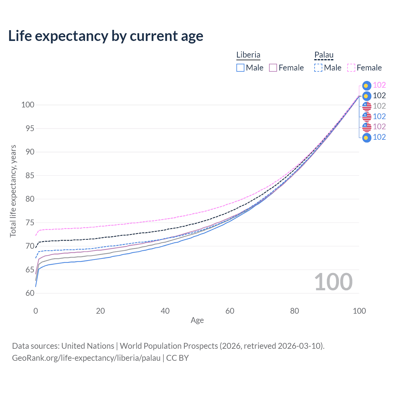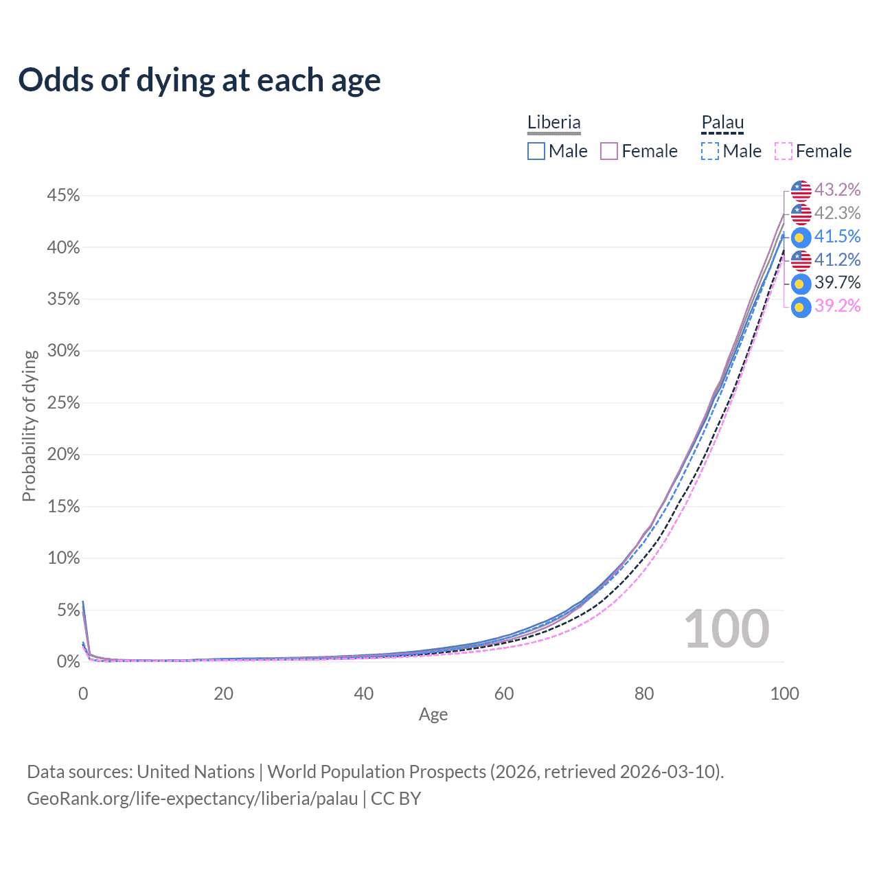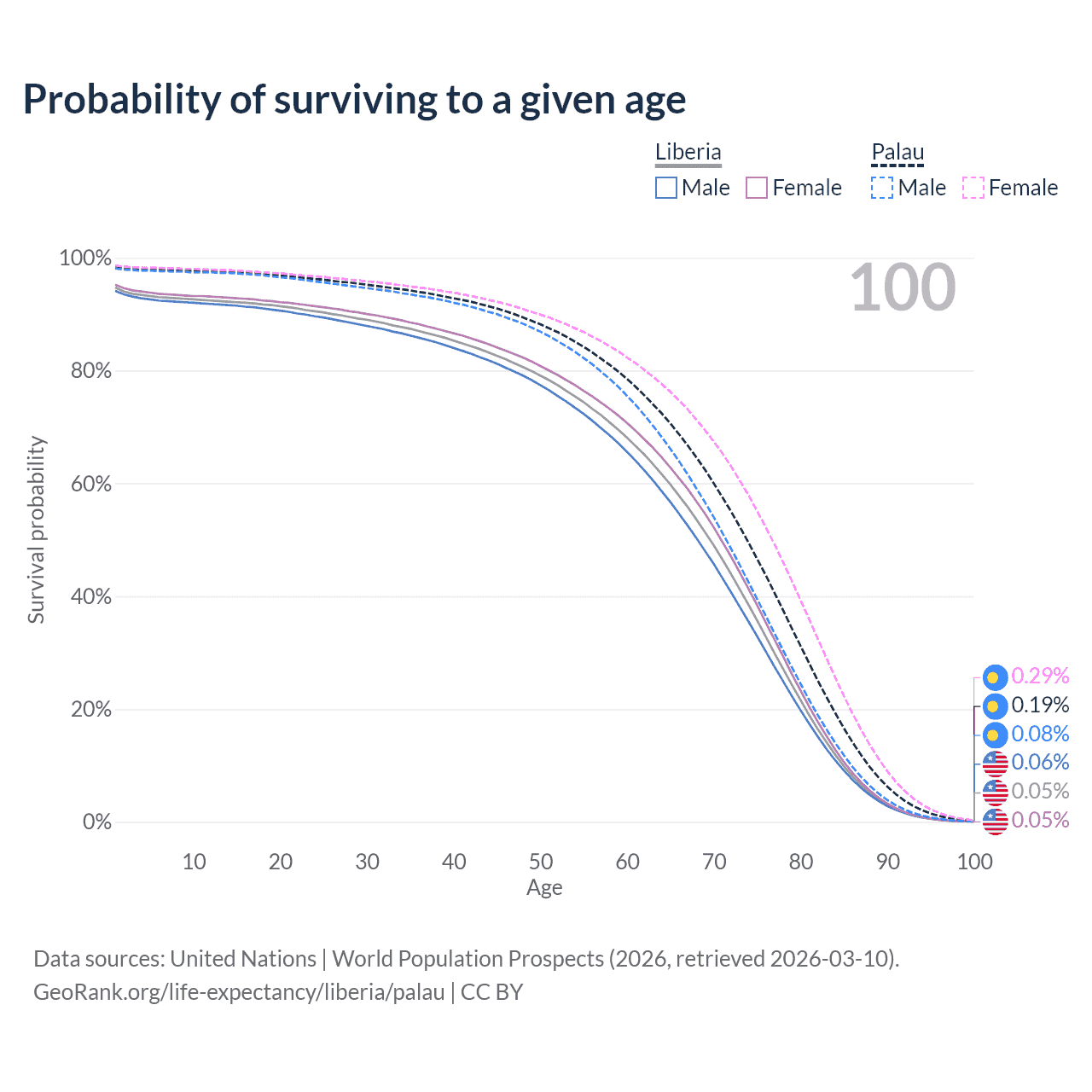 This life expectancy calculator shows the odds of living to 100, 95, 90, and below based on current age for both males and females in Liberia and Palau, along with mean and median age of death. The calculations are based on the 2026 life tables (actuarial tables) from the UN World Population Prospects.