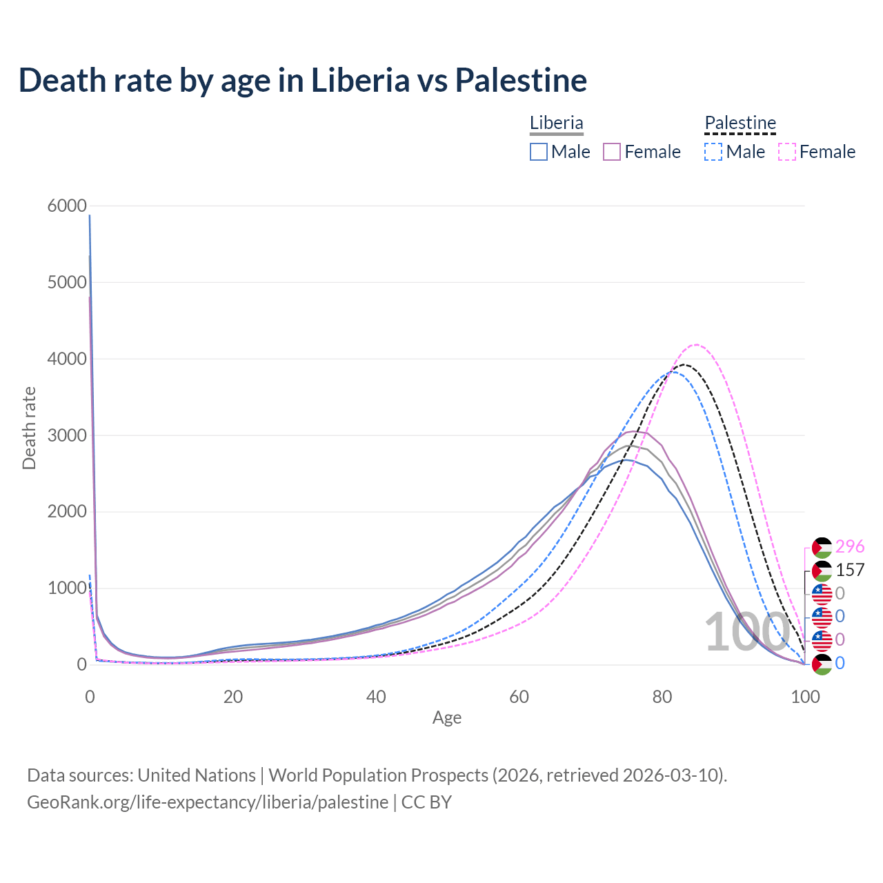 In Liberia, the most common age of death is 0, compared to 83 in Palestine. The median age of death is 69.6 in Liberia and 80.5 in Palestine, meaning only half of each cohort is expected to live past that age.