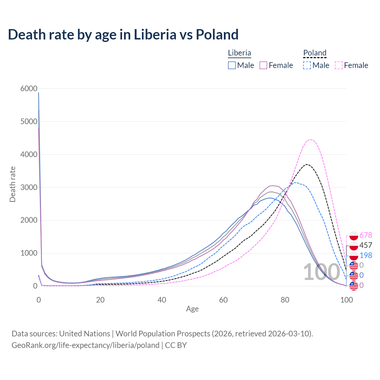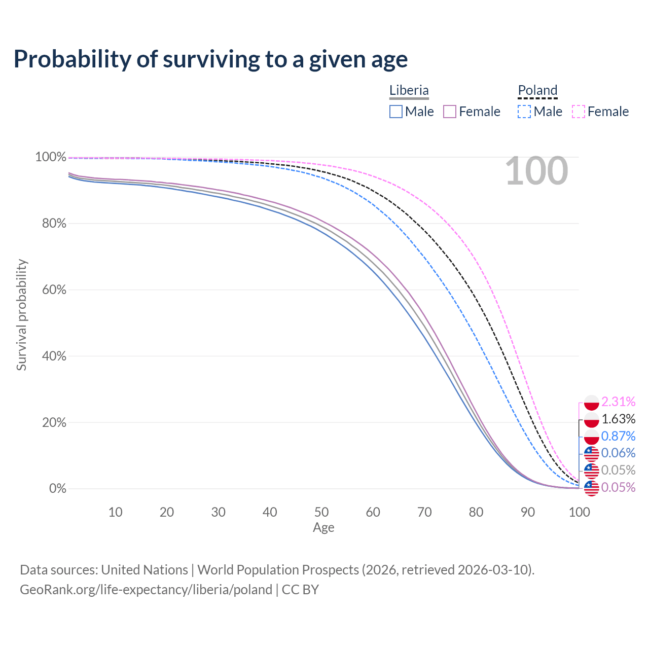 This life expectancy calculator shows the odds of living to 100, 95, 90, and below based on current age for both males and females in Liberia and Poland, along with mean and median age of death. The calculations are based on the 2026 life tables (actuarial tables) from the UN World Population Prospects.