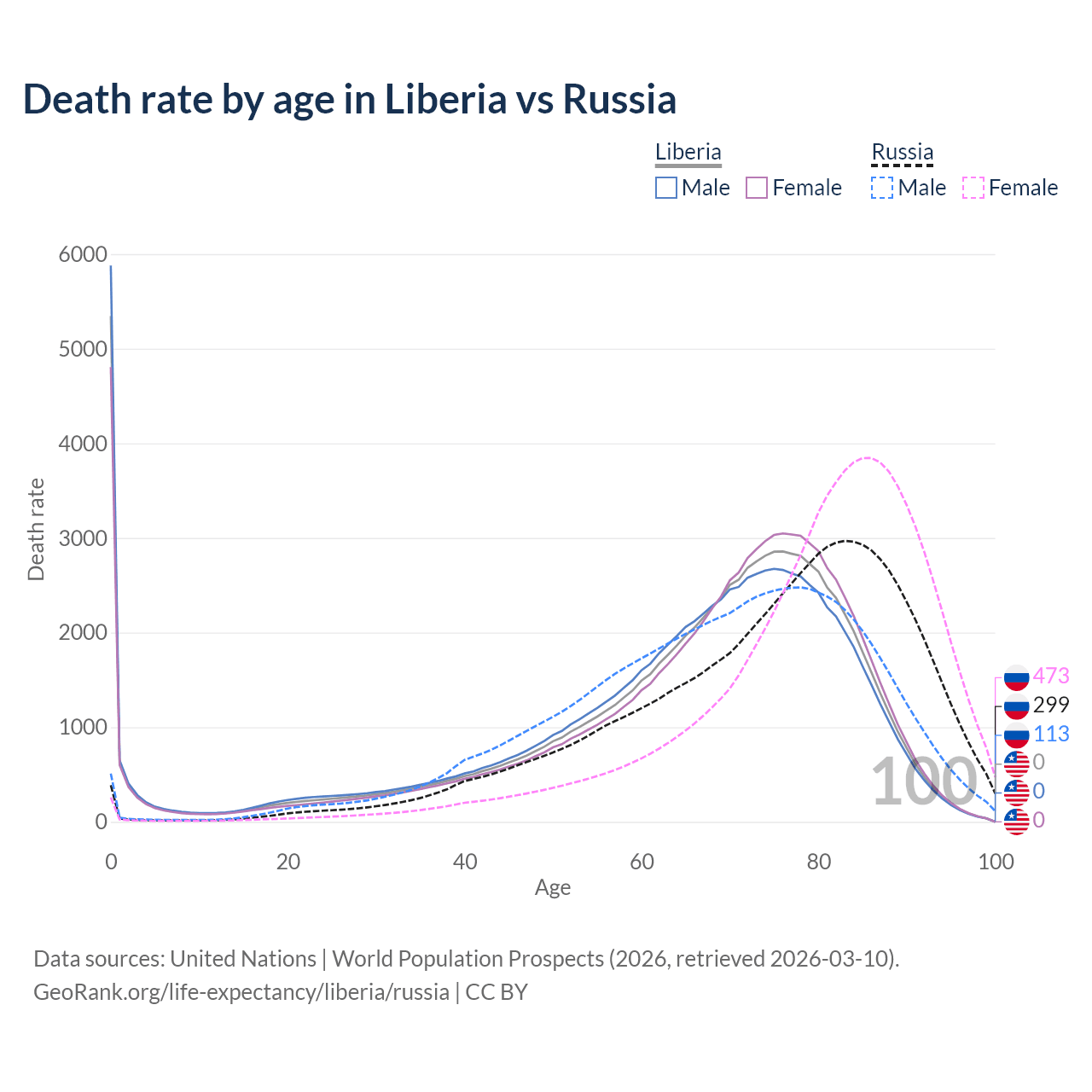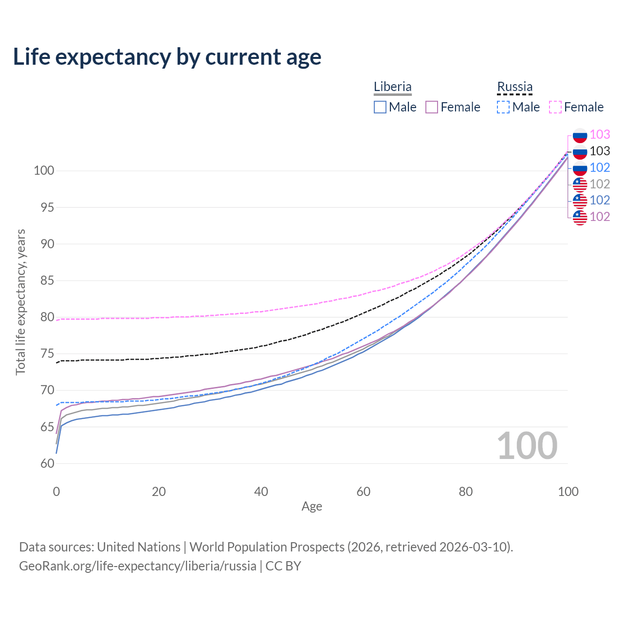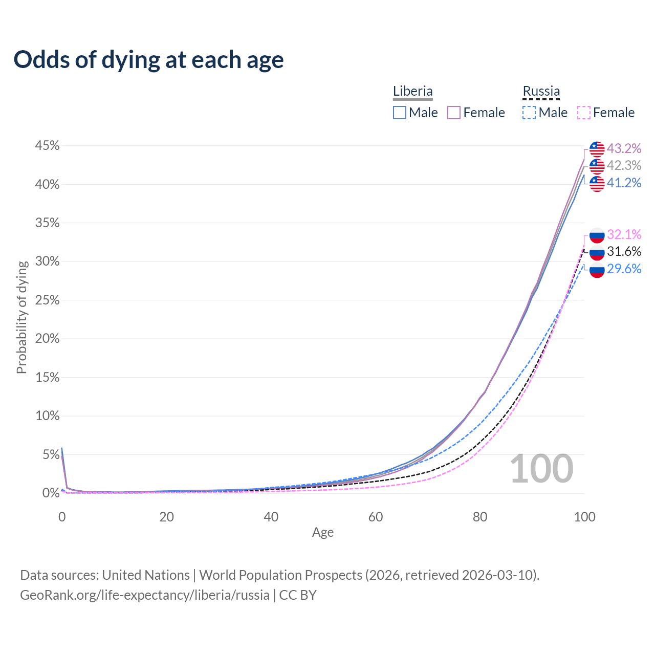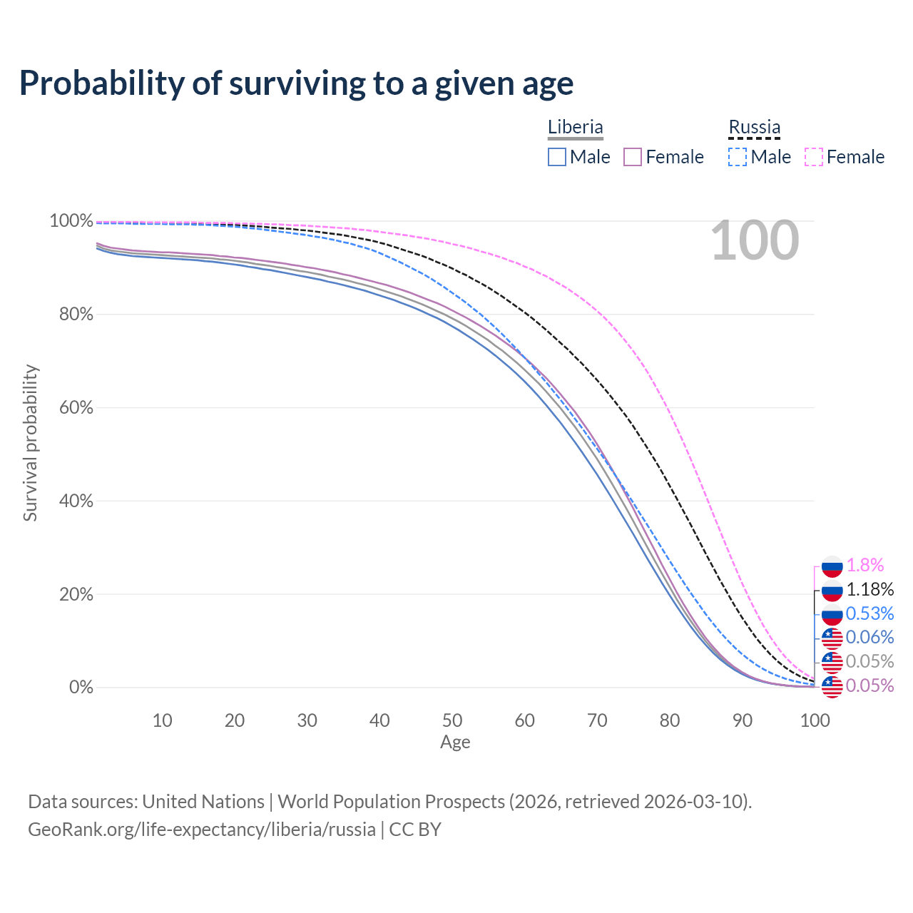 This life expectancy calculator shows the odds of living to 100, 95, 90, and below based on current age for both males and females in Liberia and Russia, along with mean and median age of death. The calculations are based on the 2026 life tables (actuarial tables) from the UN World Population Prospects.