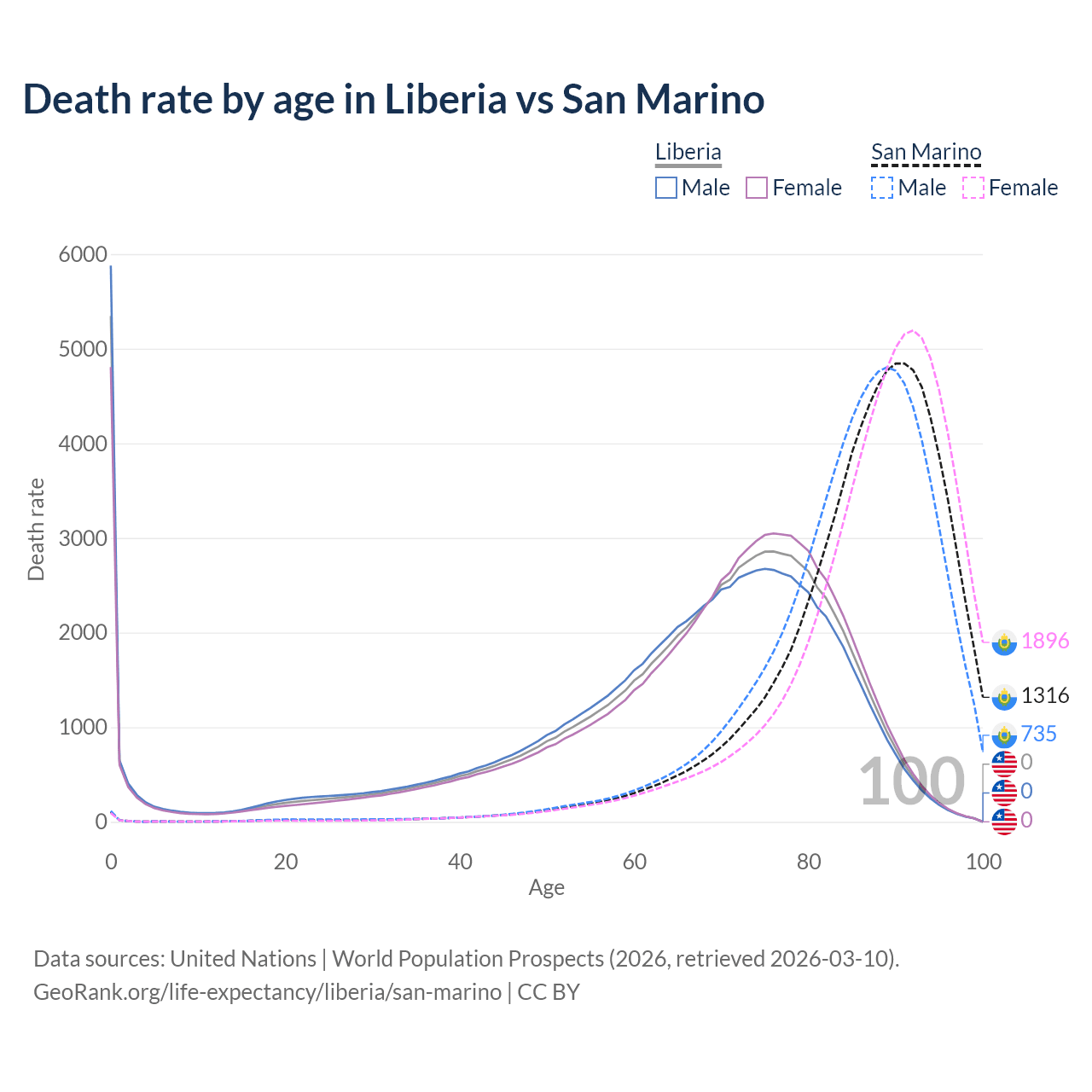 In Liberia, the most common age of death is 0, compared to 91 in San Marino. The median age of death is 69.6 in Liberia and 88.3 in San Marino, meaning only half of each cohort is expected to live past that age.
