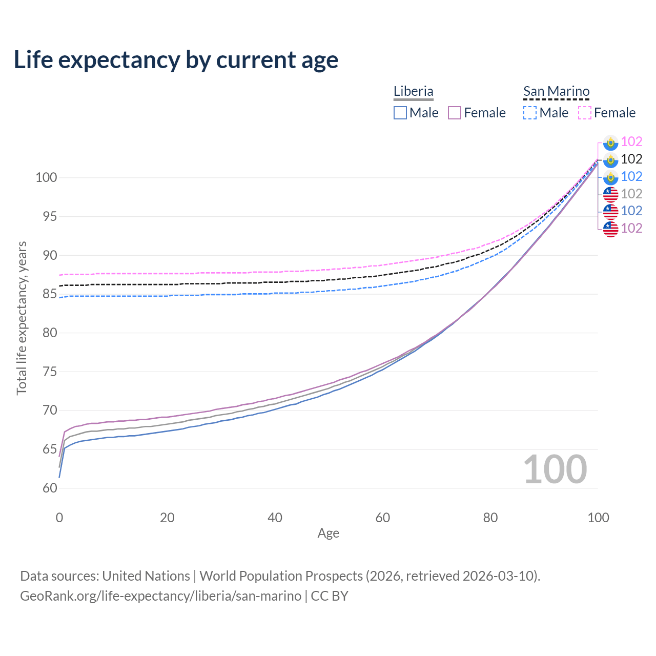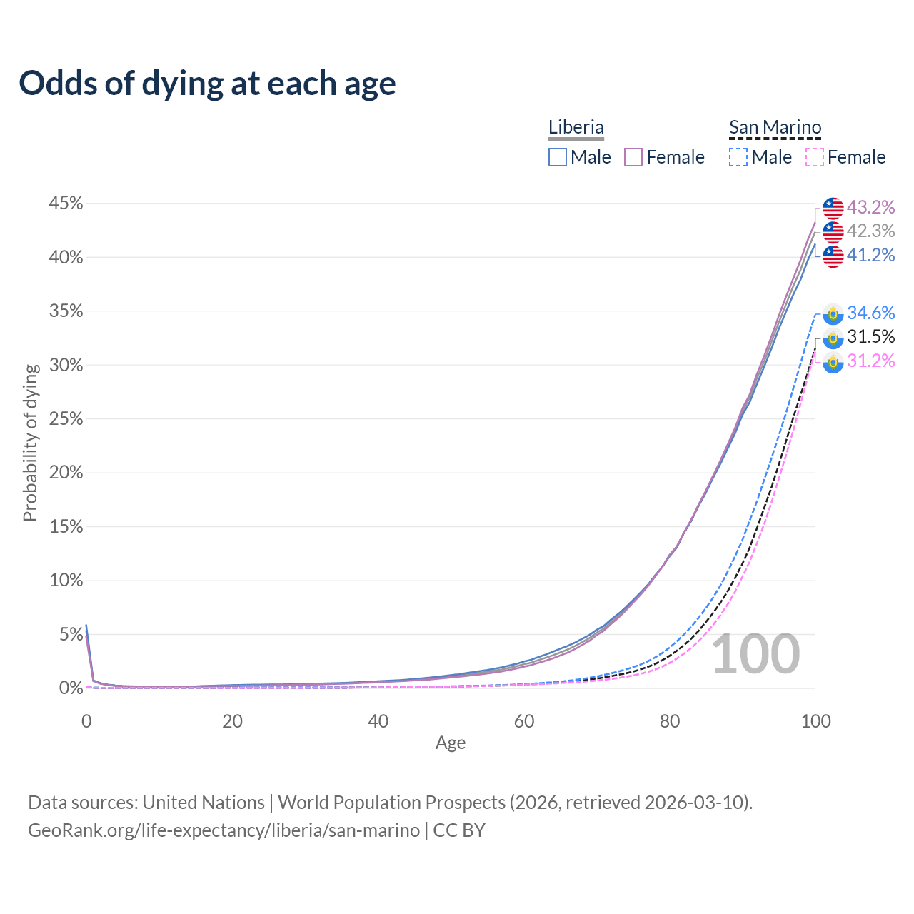 This life expectancy calculator shows the odds of living to 100, 95, 90, and below based on current age for both males and females in Liberia and San Marino, along with mean and median age of death. The calculations are based on the 2026 life tables (actuarial tables) from the UN World Population Prospects.