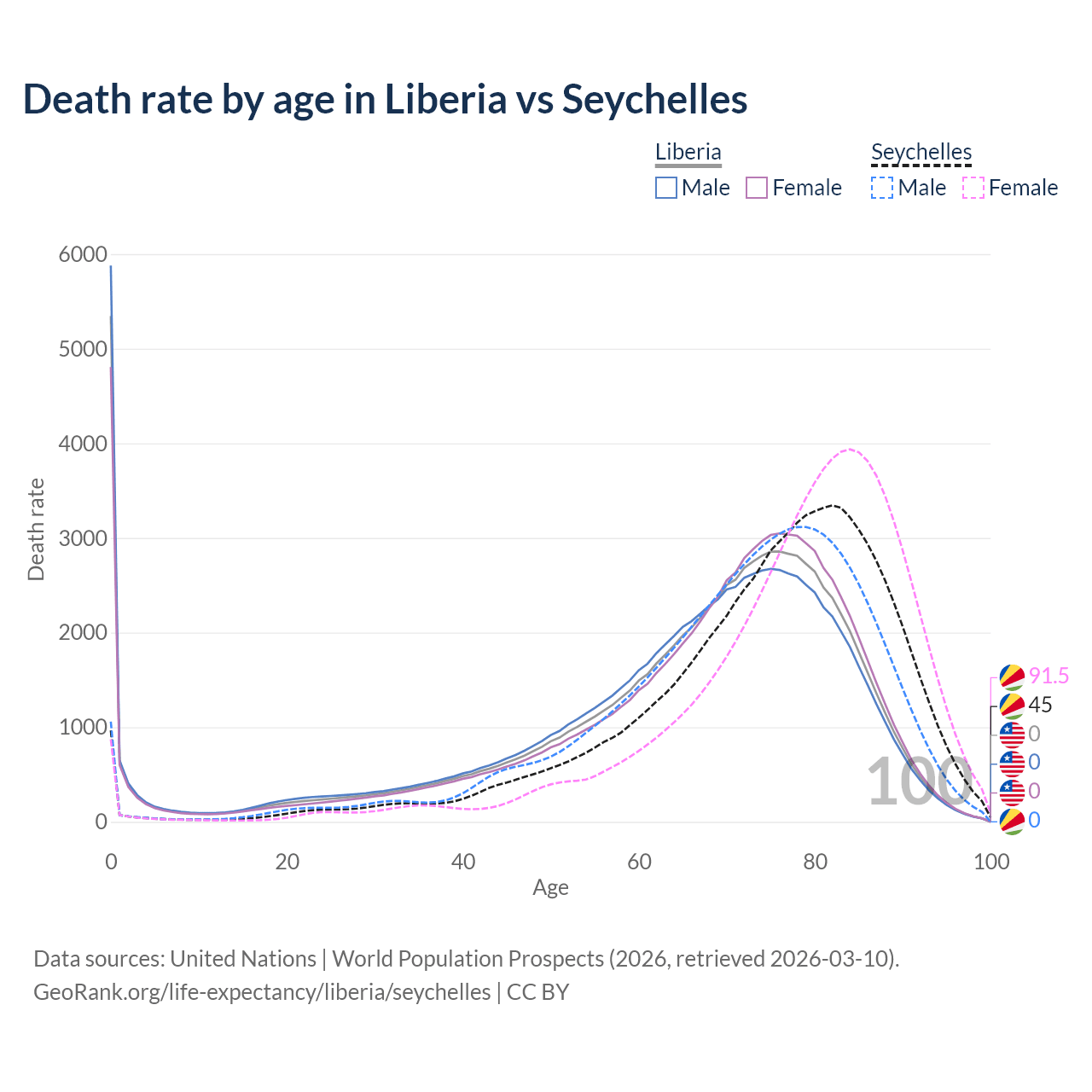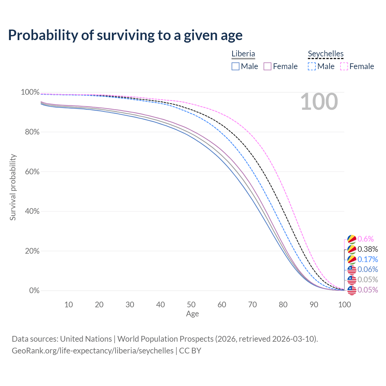 This life expectancy calculator shows the odds of living to 100, 95, 90, and below based on current age for both males and females in Liberia and the Seychelles, along with mean and median age of death. The calculations are based on the 2026 life tables (actuarial tables) from the UN World Population Prospects.