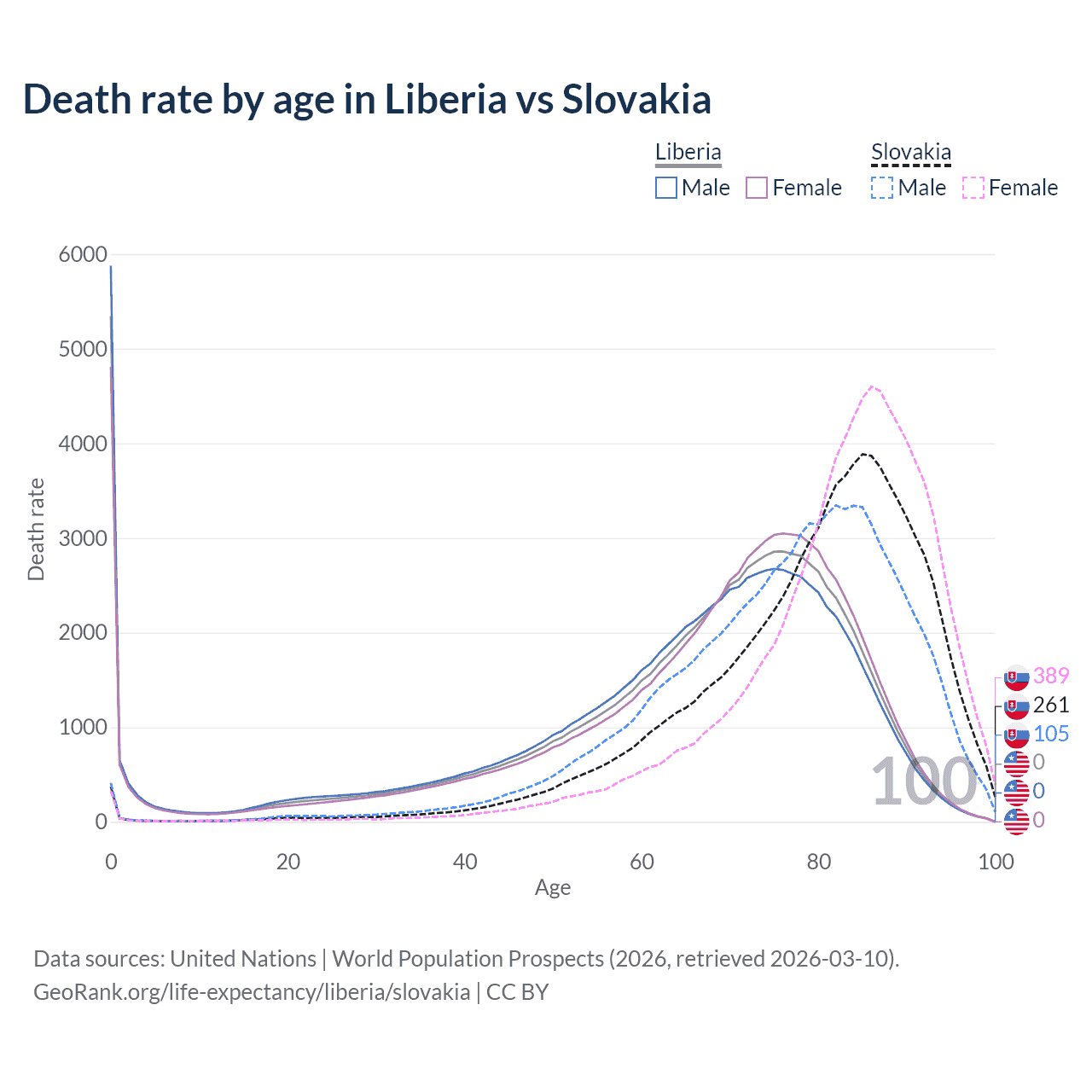In Liberia, the most common age of death is 0, compared to 85 in Slovakia. The median age of death is 69.6 in Liberia and 82 in Slovakia, meaning only half of each cohort is expected to live past that age.