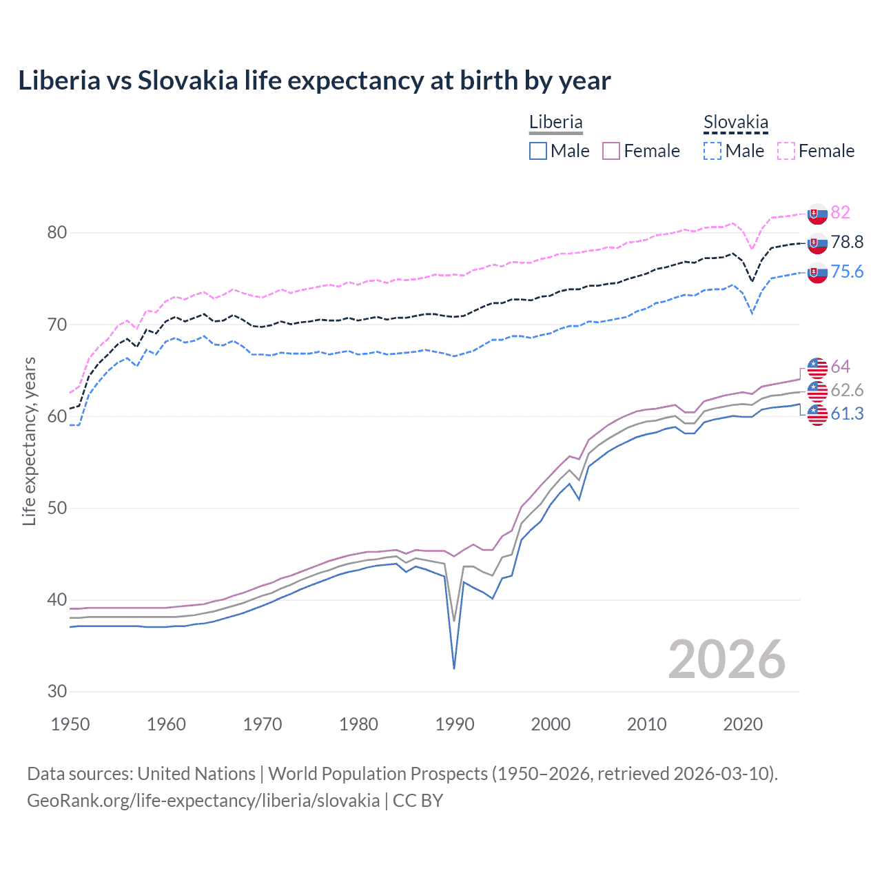 The average life expectancy at birth is 62.6 years in Liberia vs 78.8 in Slovakia. Liberia is ranked 182/197 by life expectancy, and Slovakia is 53/197. In Liberia, the life expectancy is 61.3 years for males and 64 years for females. In Slovakia, it's 75.6 years for males and 82 years for females.