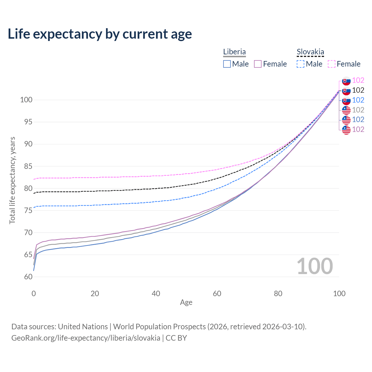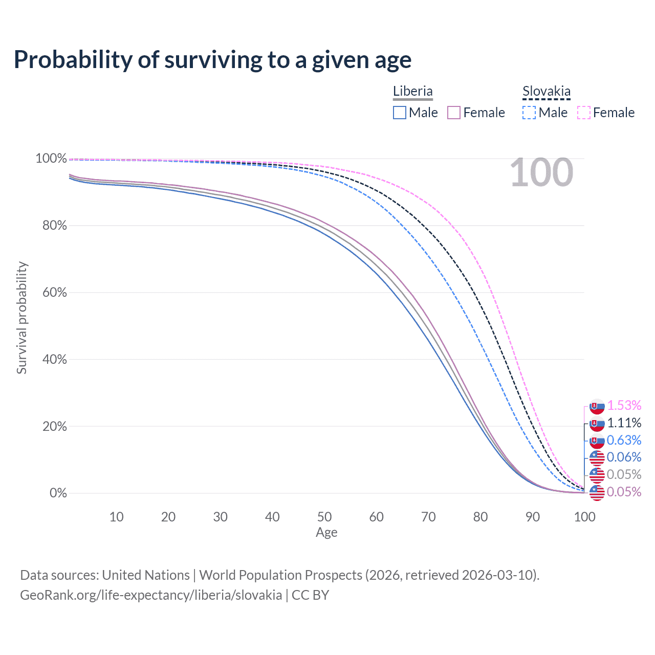 This life expectancy calculator shows the odds of living to 100, 95, 90, and below based on current age for both males and females in Liberia and Slovakia, along with mean and median age of death. The calculations are based on the 2026 life tables (actuarial tables) from the UN World Population Prospects.