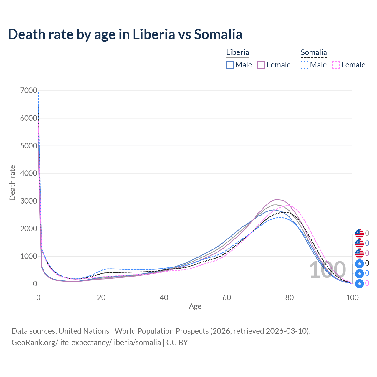 In Liberia, the most common age of death is 0, compared to 0 in Somalia. The median age of death is 69.6 in Liberia and 69 in Somalia, meaning only half of each cohort is expected to live past that age.