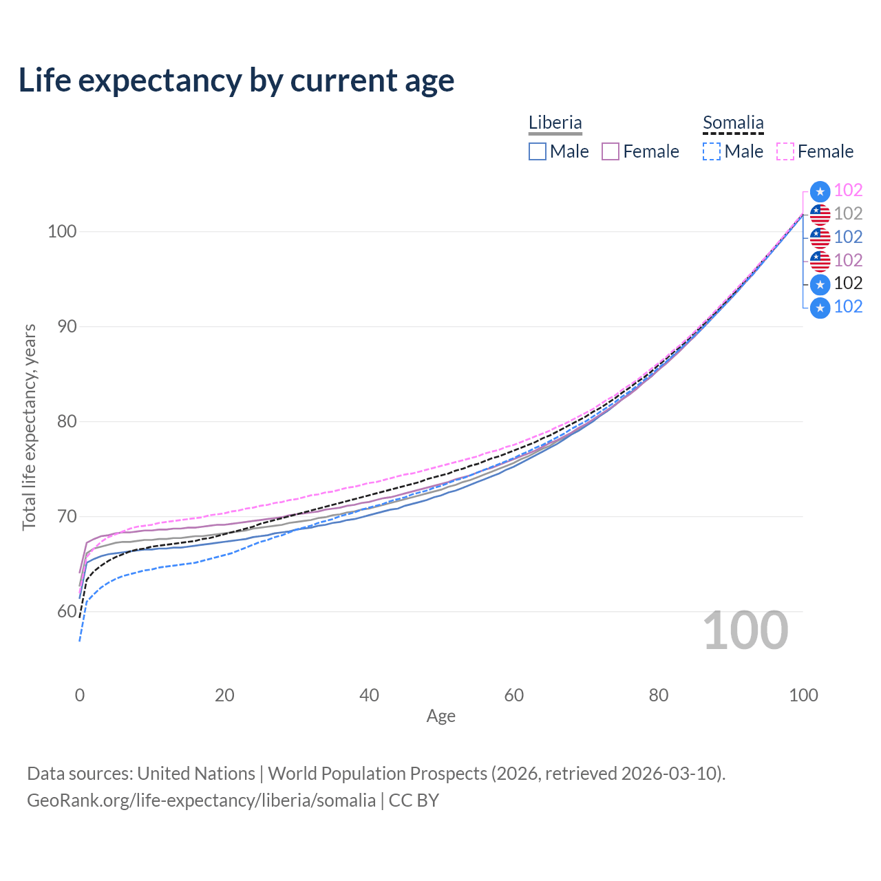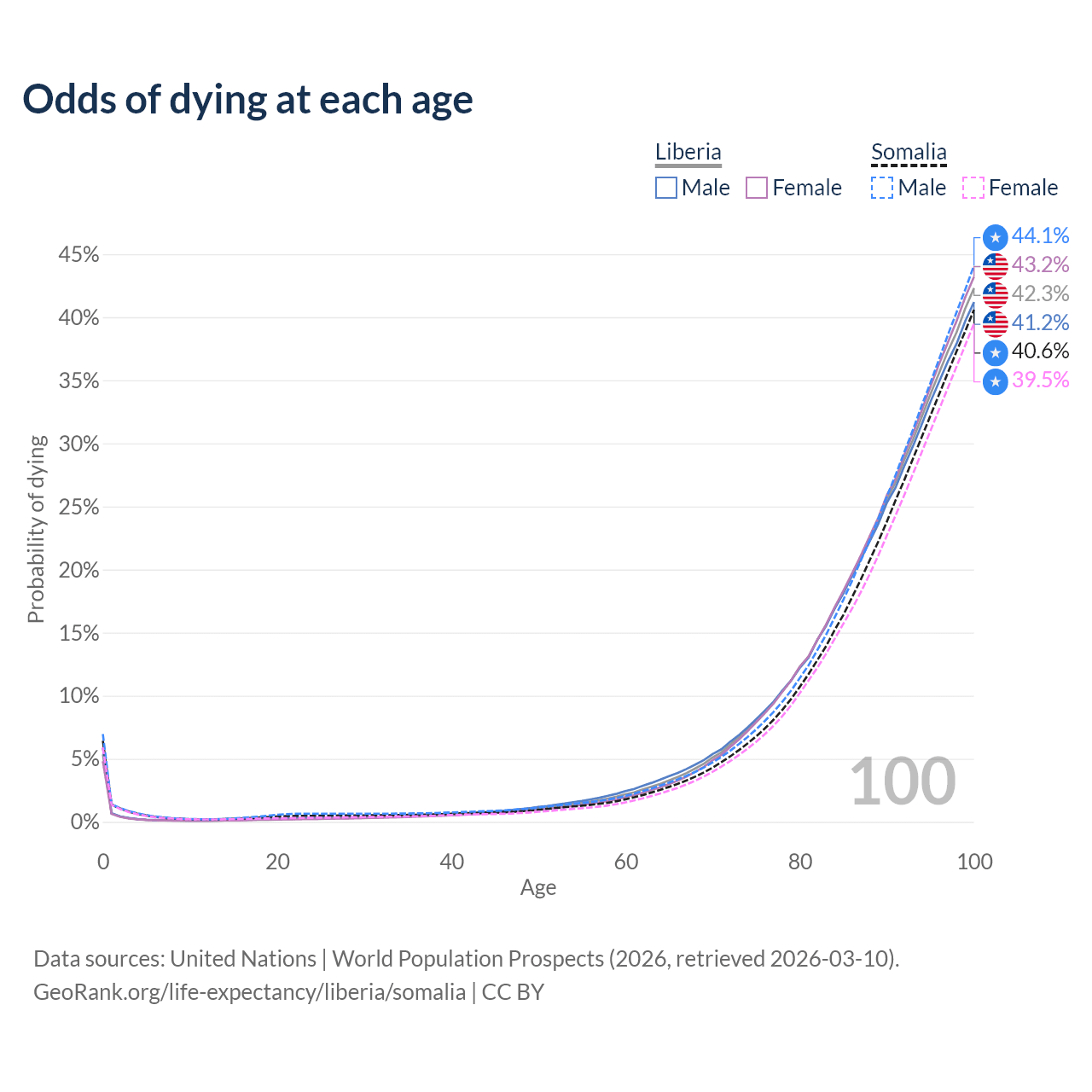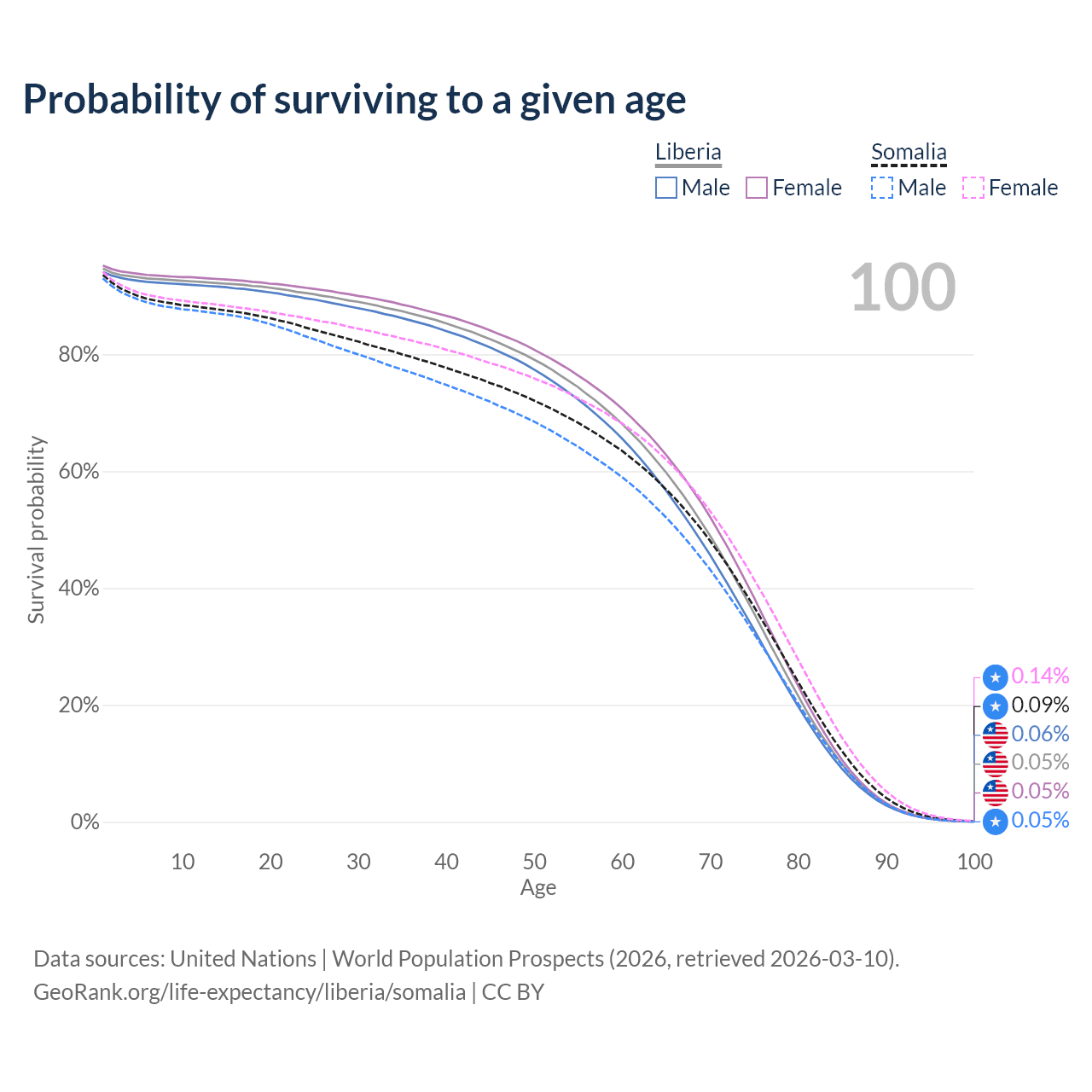 This life expectancy calculator shows the odds of living to 100, 95, 90, and below based on current age for both males and females in Liberia and Somalia, along with mean and median age of death. The calculations are based on the 2026 life tables (actuarial tables) from the UN World Population Prospects.