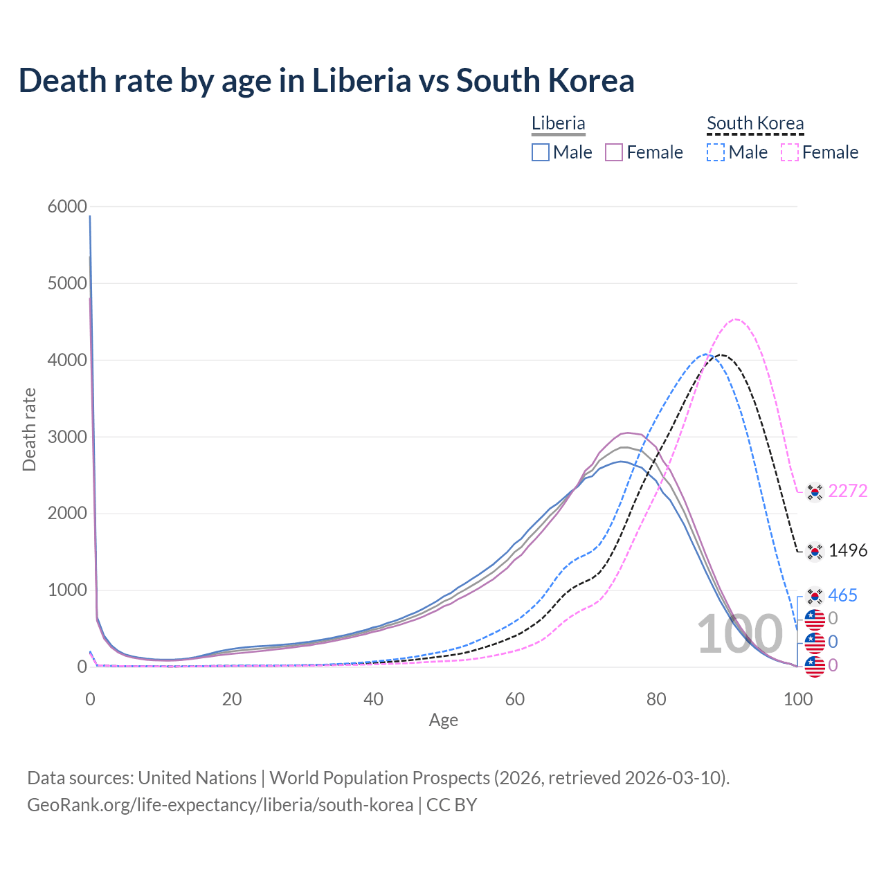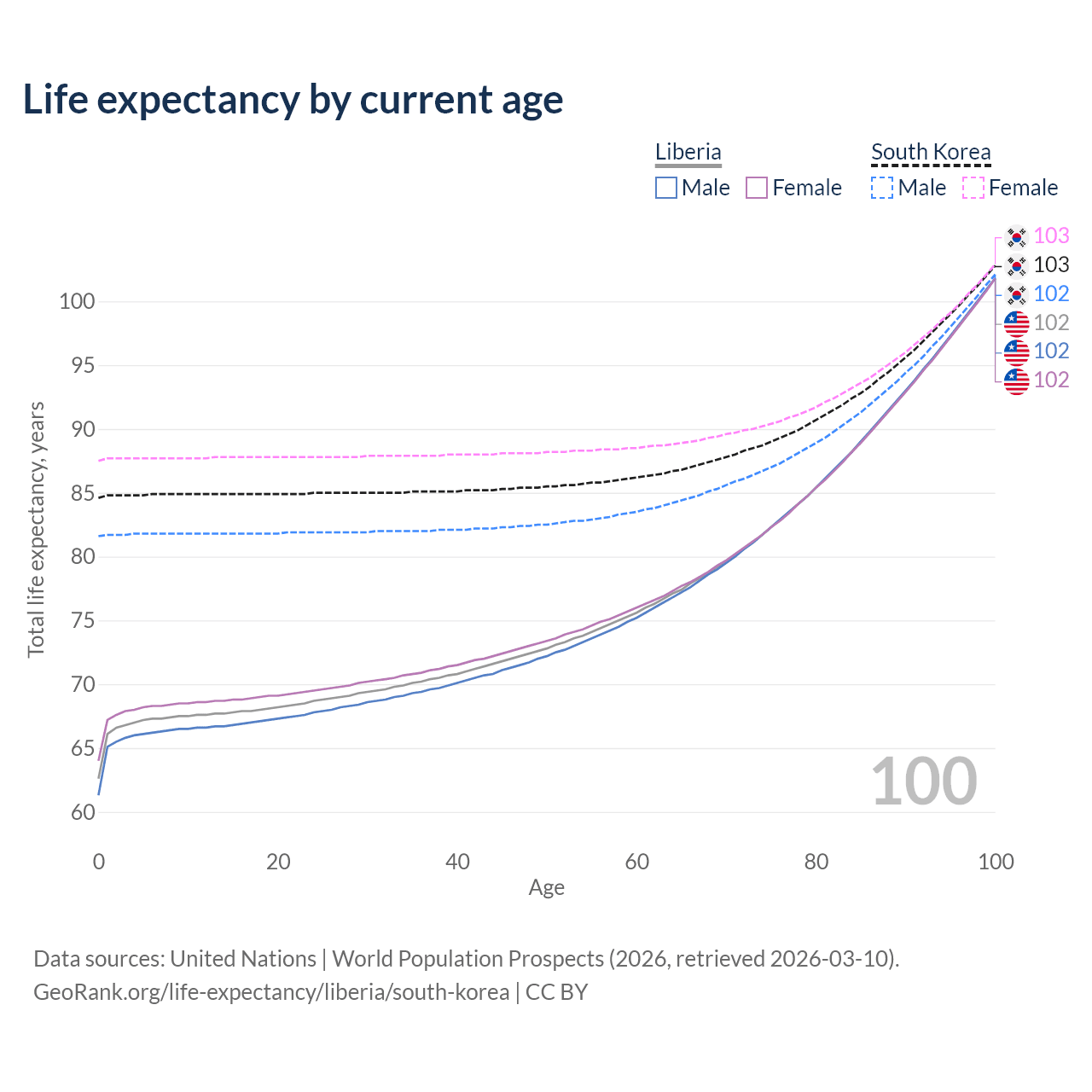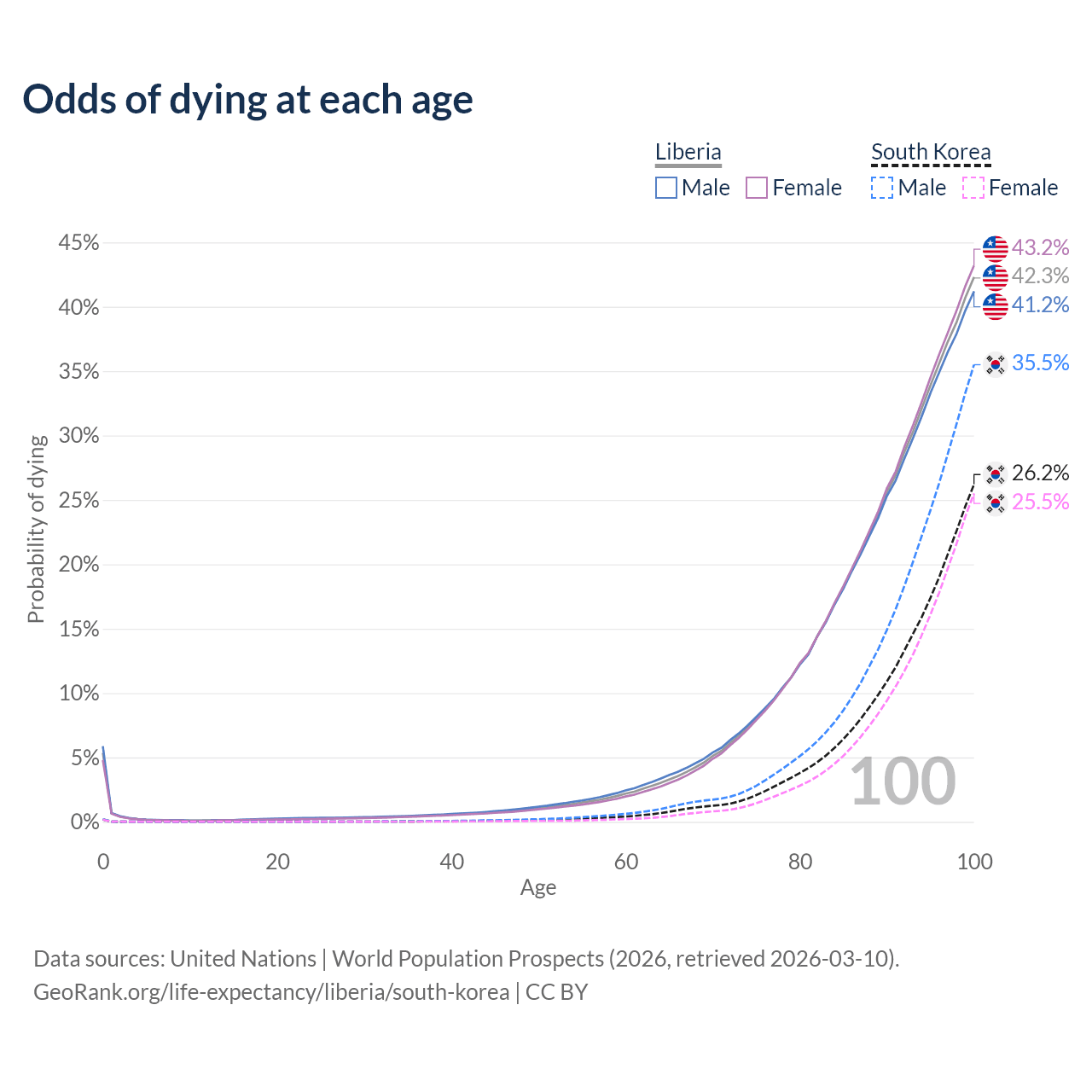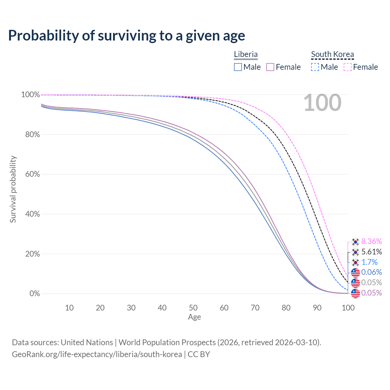 This life expectancy calculator shows the odds of living to 100, 95, 90, and below based on current age for both males and females in Liberia and South Korea, along with mean and median age of death. The calculations are based on the 2026 life tables (actuarial tables) from the UN World Population Prospects.