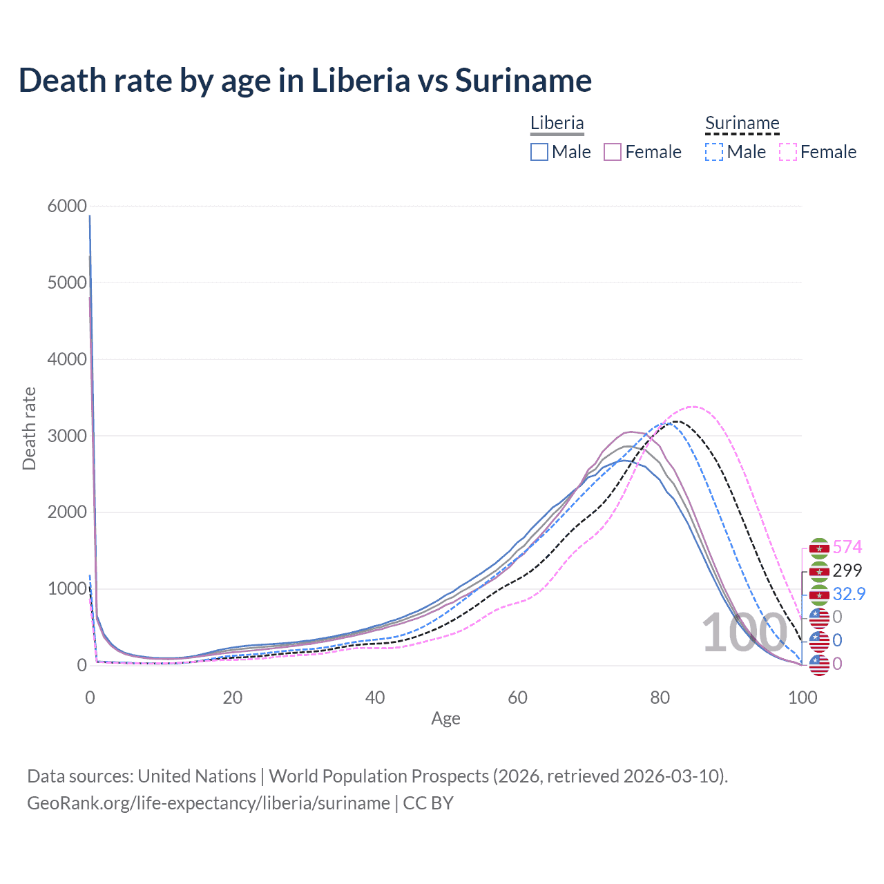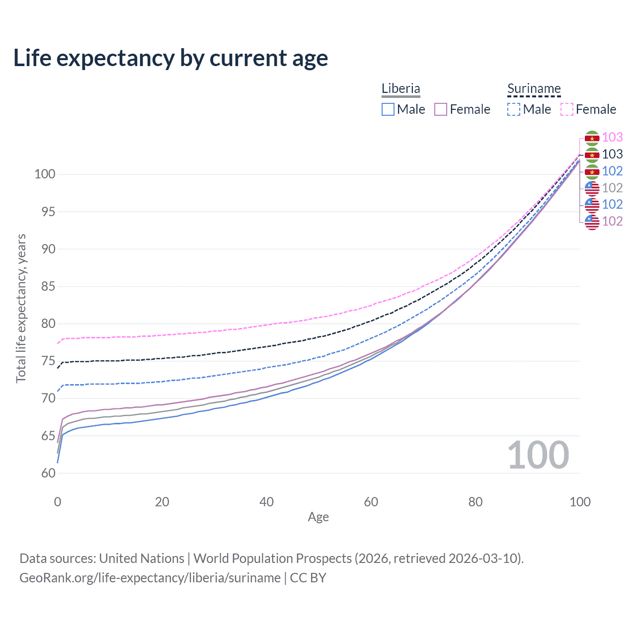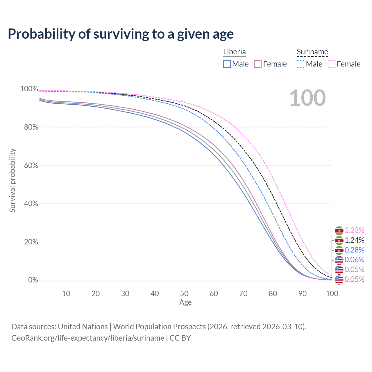 This life expectancy calculator shows the odds of living to 100, 95, 90, and below based on current age for both males and females in Liberia and Suriname, along with mean and median age of death. The calculations are based on the 2026 life tables (actuarial tables) from the UN World Population Prospects.
