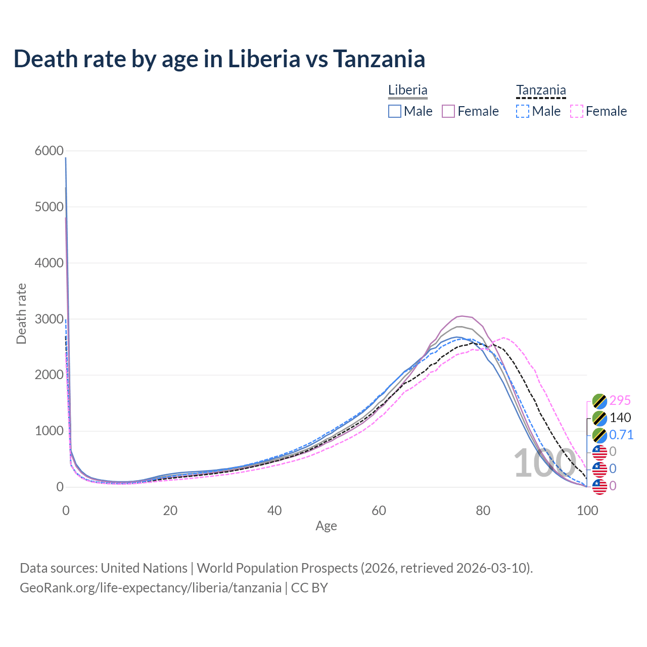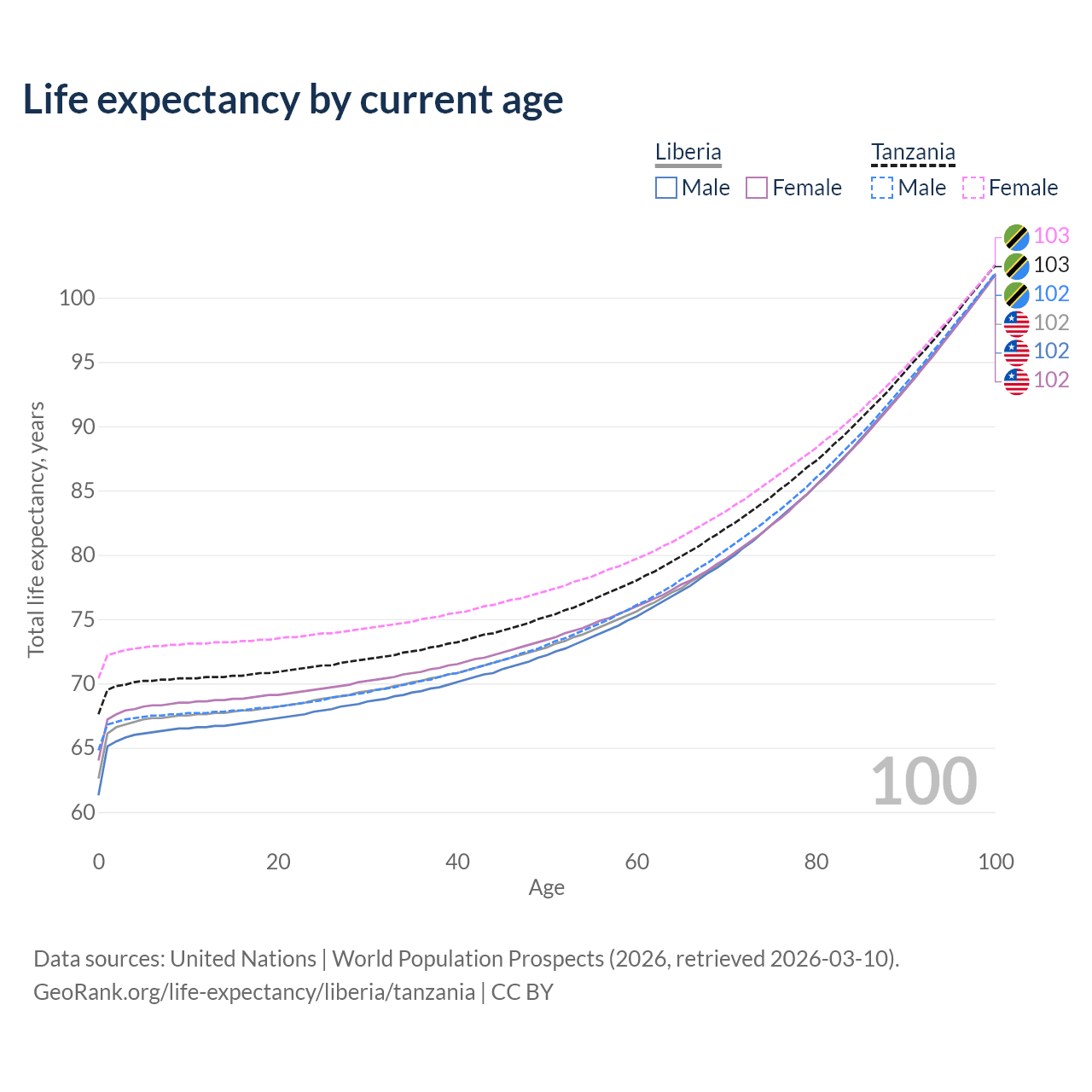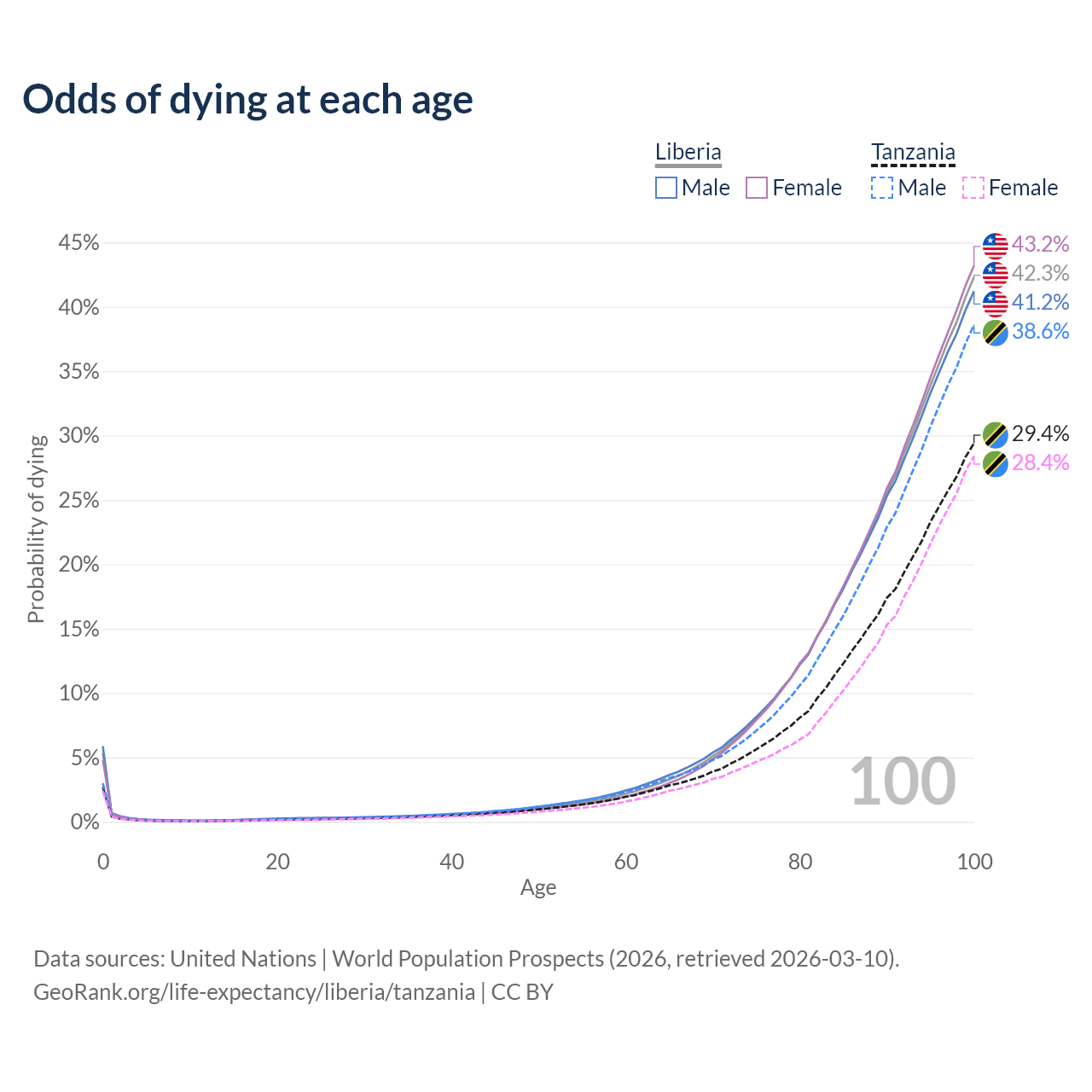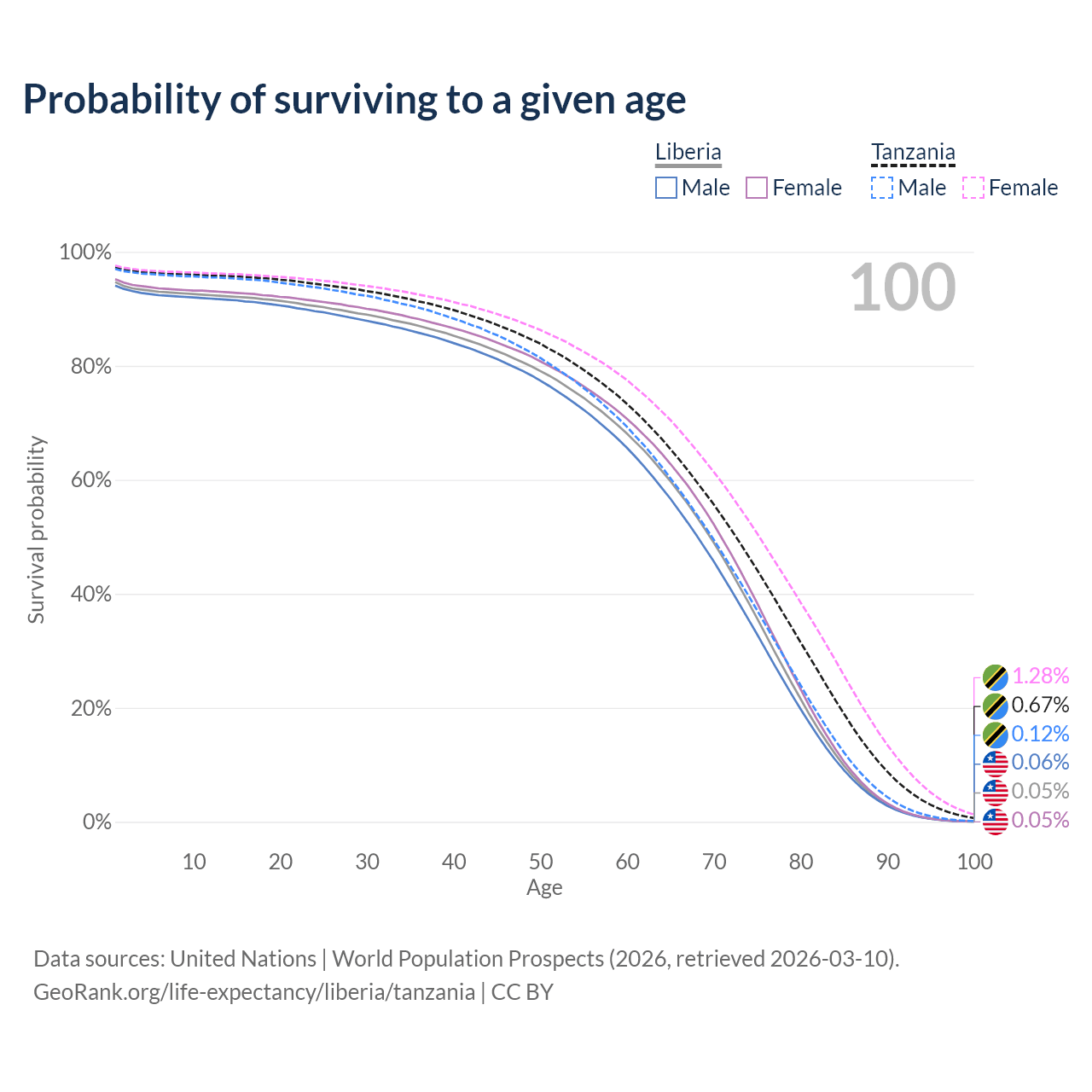 This life expectancy calculator shows the odds of living to 100, 95, 90, and below based on current age for both males and females in Liberia and Tanzania, along with mean and median age of death. The calculations are based on the 2026 life tables (actuarial tables) from the UN World Population Prospects.