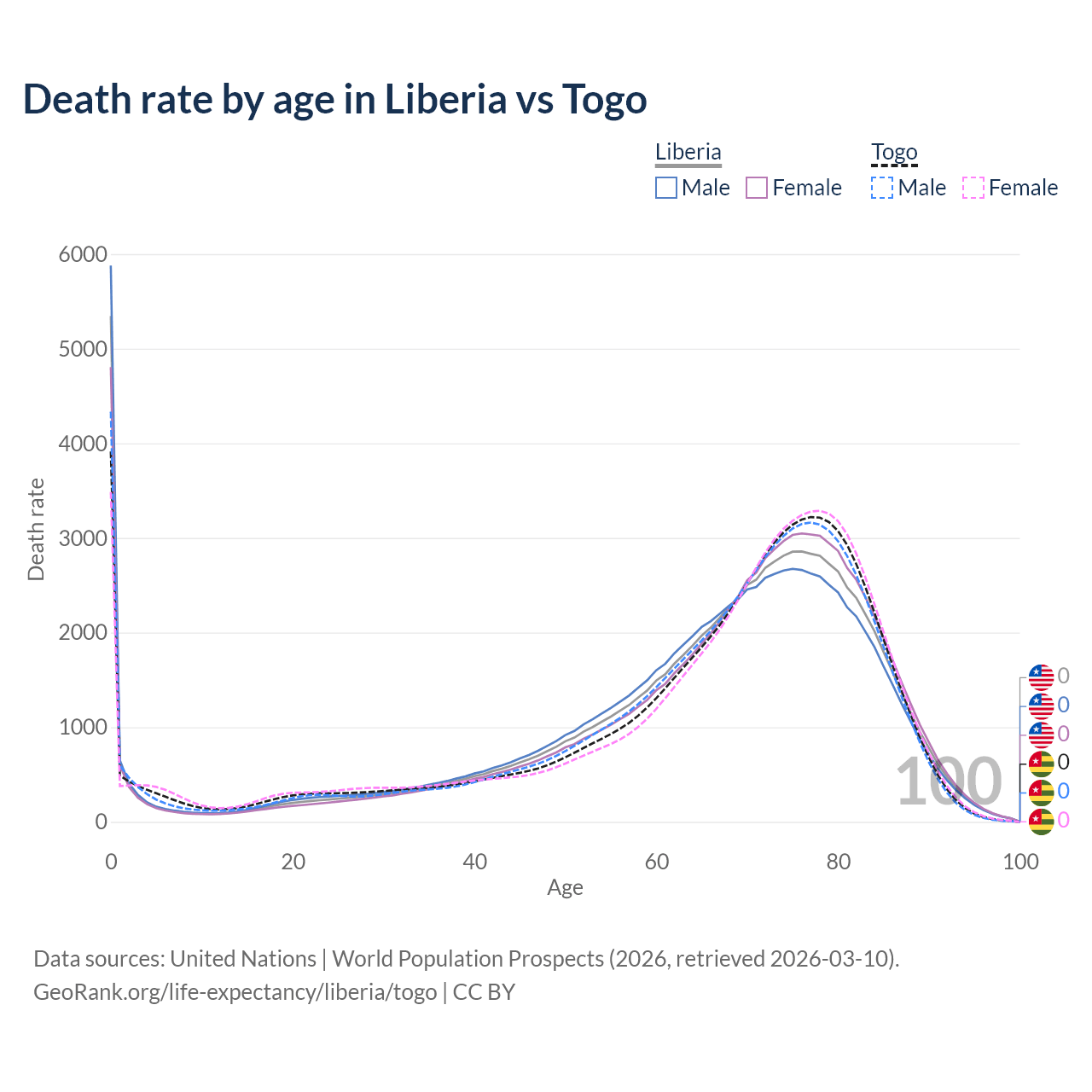 In Liberia, the most common age of death is 0, compared to 0 in Togo. The median age of death is 69.6 in Liberia and 71 in Togo, meaning only half of each cohort is expected to live past that age.