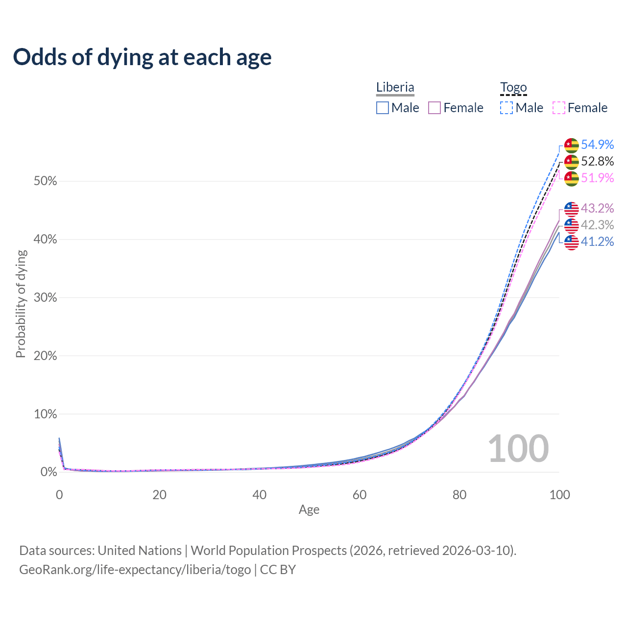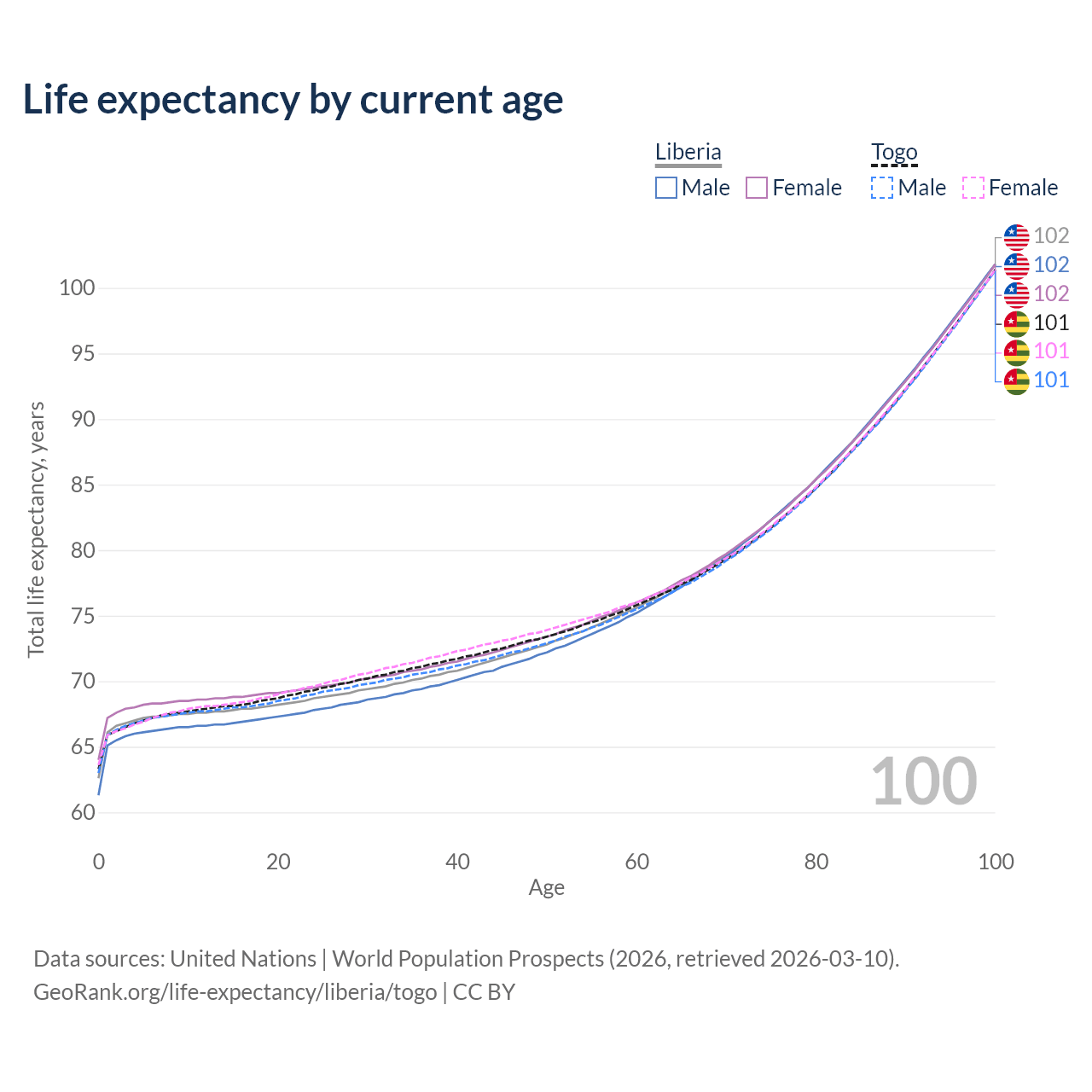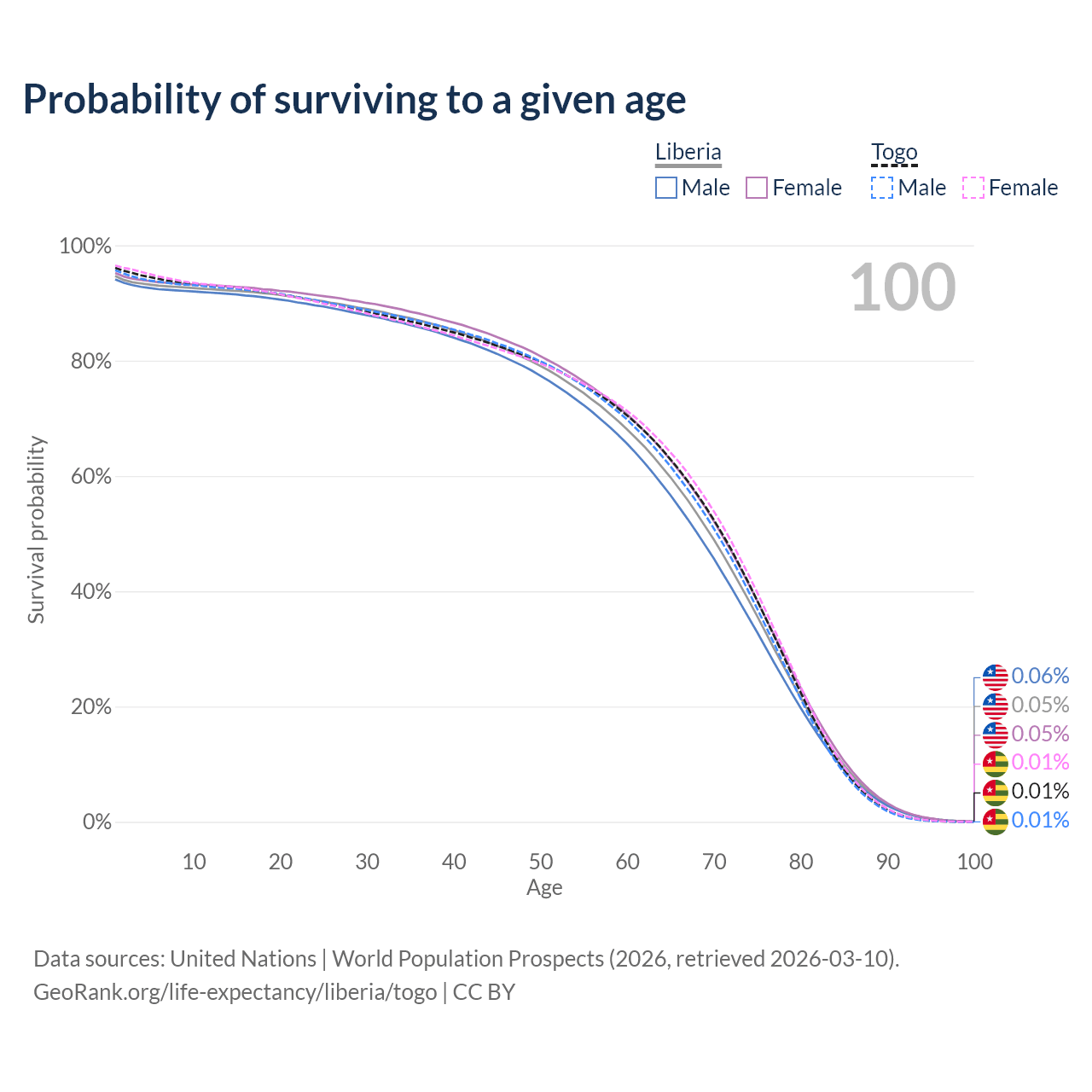 This life expectancy calculator shows the odds of living to 100, 95, 90, and below based on current age for both males and females in Liberia and Togo, along with mean and median age of death. The calculations are based on the 2026 life tables (actuarial tables) from the UN World Population Prospects.