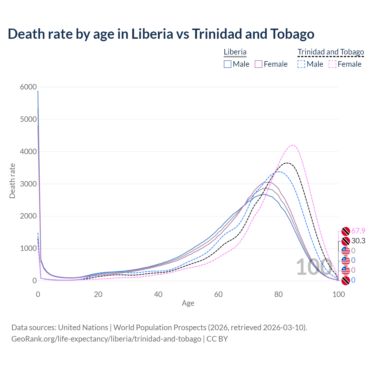 In Liberia, the most common age of death is 0, compared to 83 in Trinidad and Tobago. The median age of death is 69.6 in Liberia and 78.4 in Trinidad and Tobago, meaning only half of each cohort is expected to live past that age.