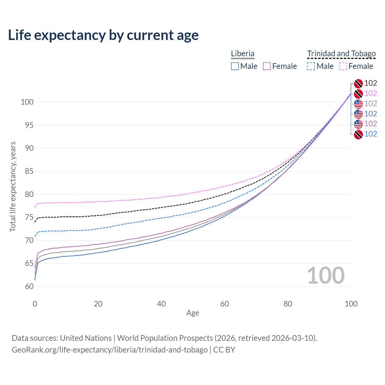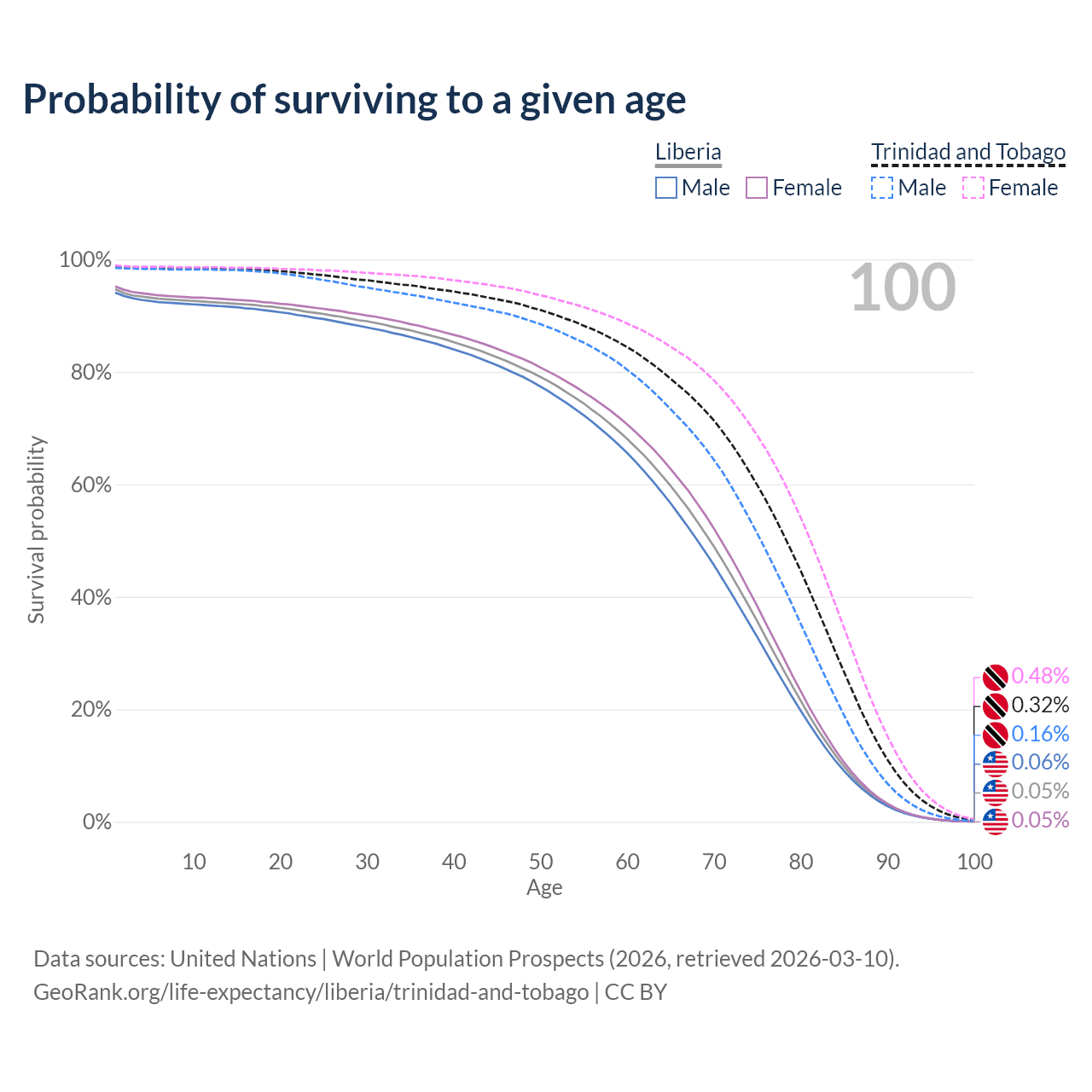 This life expectancy calculator shows the odds of living to 100, 95, 90, and below based on current age for both males and females in Liberia and Trinidad and Tobago, along with mean and median age of death. The calculations are based on the 2026 life tables (actuarial tables) from the UN World Population Prospects.