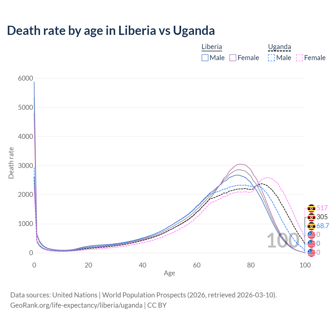 In Liberia, the most common age of death is 0, compared to 0 in Uganda. The median age of death is 69.6 in Liberia and 73.3 in Uganda, meaning only half of each cohort is expected to live past that age.