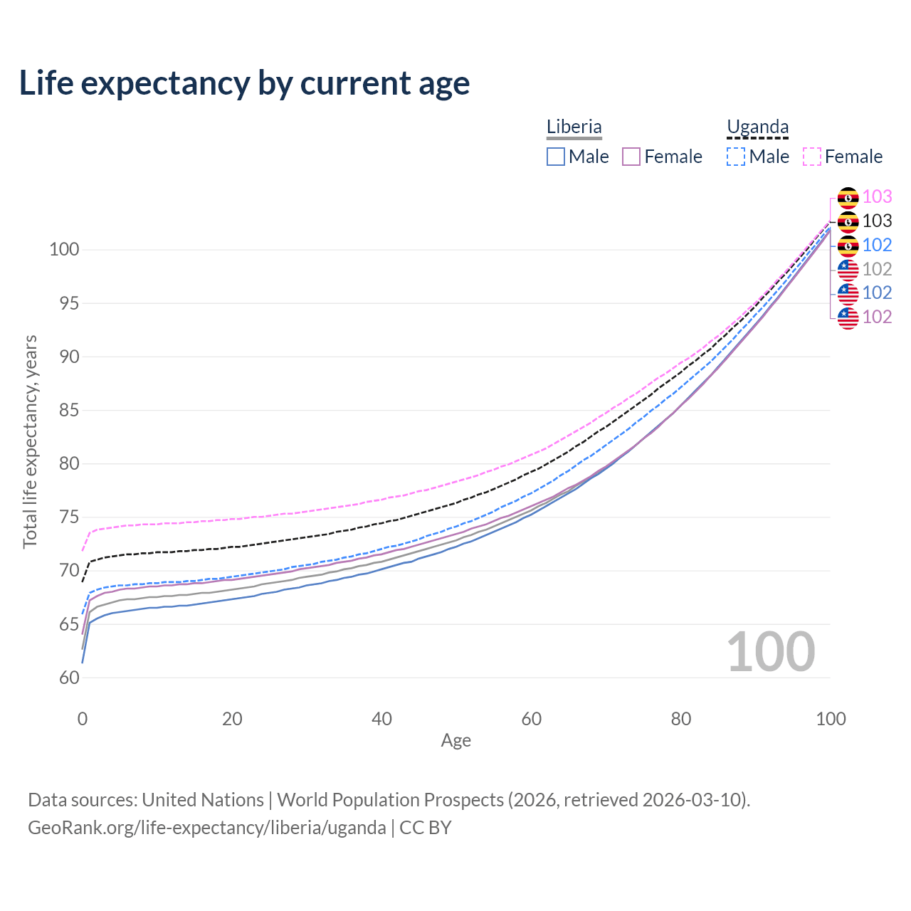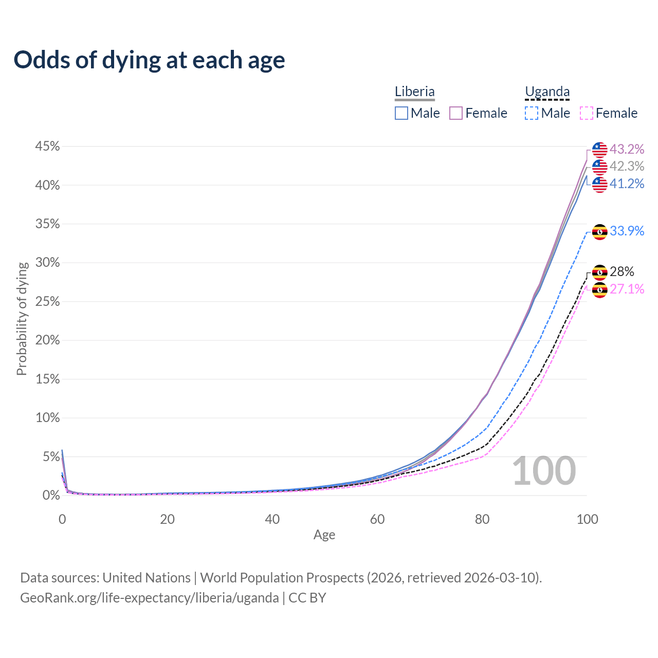This life expectancy calculator shows the odds of living to 100, 95, 90, and below based on current age for both males and females in Liberia and Uganda, along with mean and median age of death. The calculations are based on the 2026 life tables (actuarial tables) from the UN World Population Prospects.