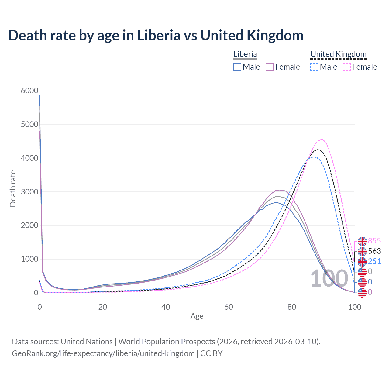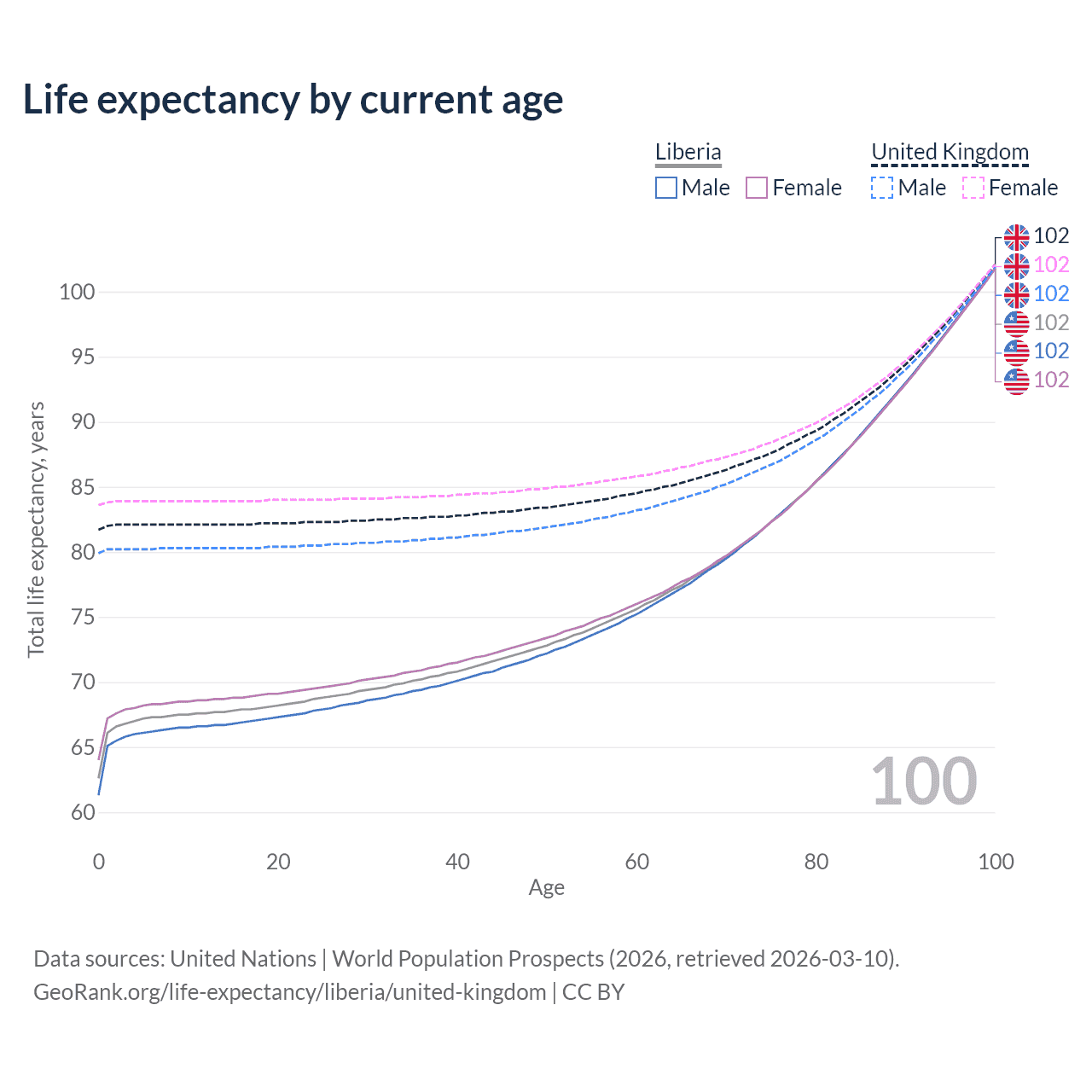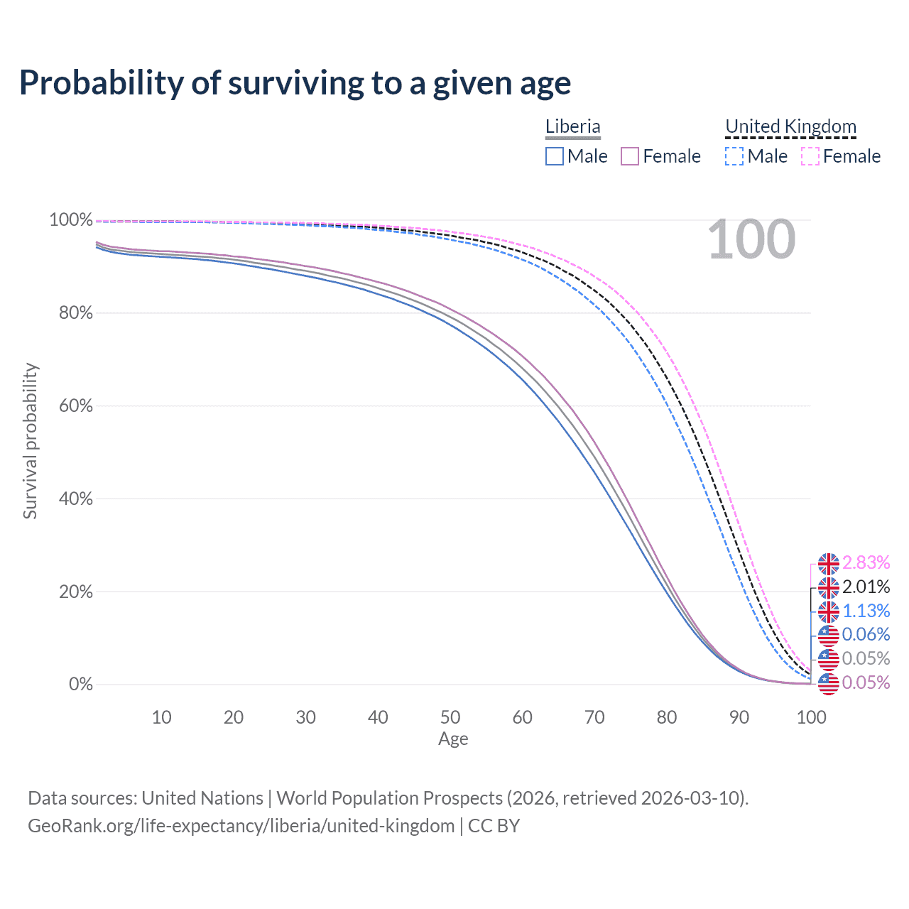 This life expectancy calculator shows the odds of living to 100, 95, 90, and below based on current age for both males and females in Liberia and the United Kingdom, along with mean and median age of death. The calculations are based on the 2026 life tables (actuarial tables) from the UN World Population Prospects.