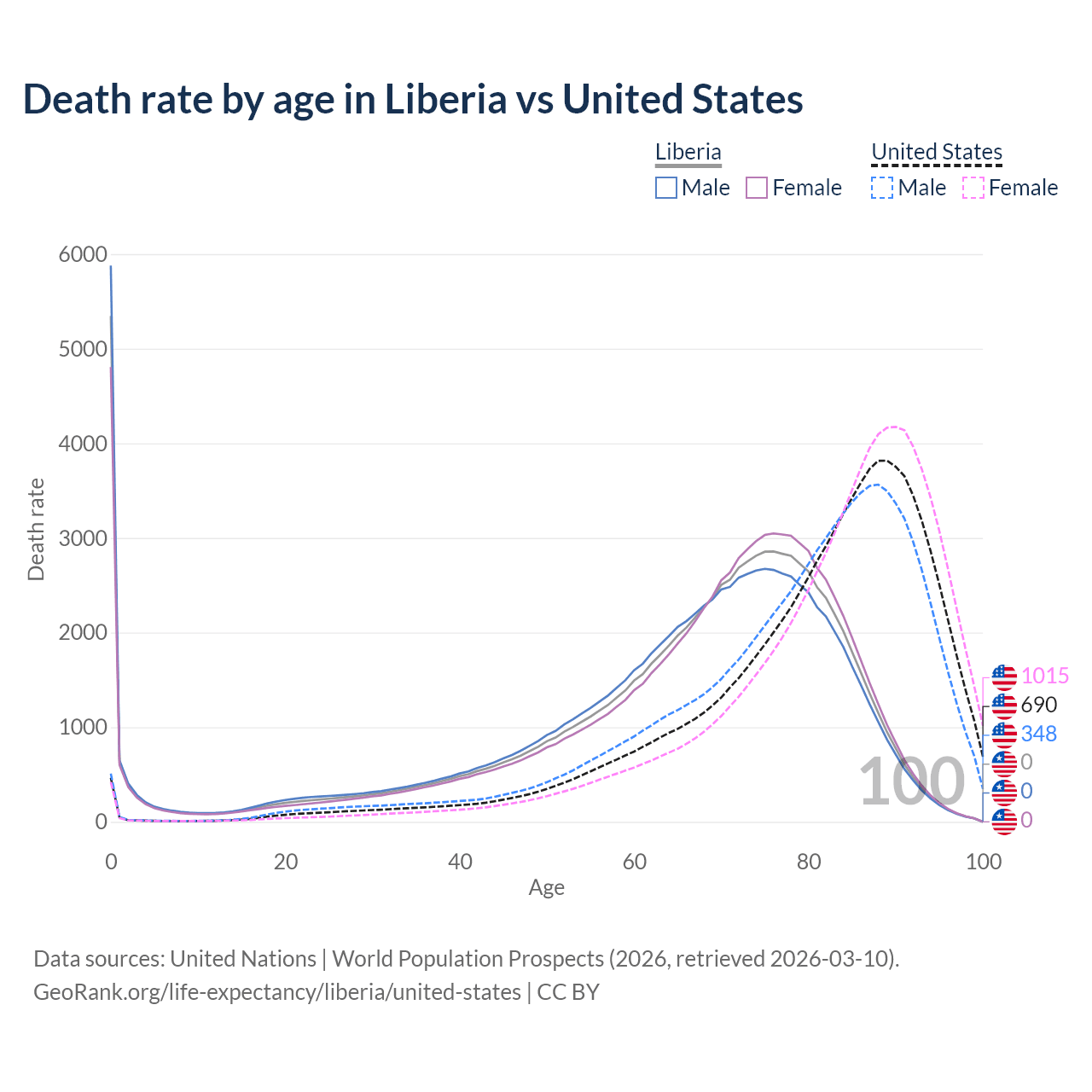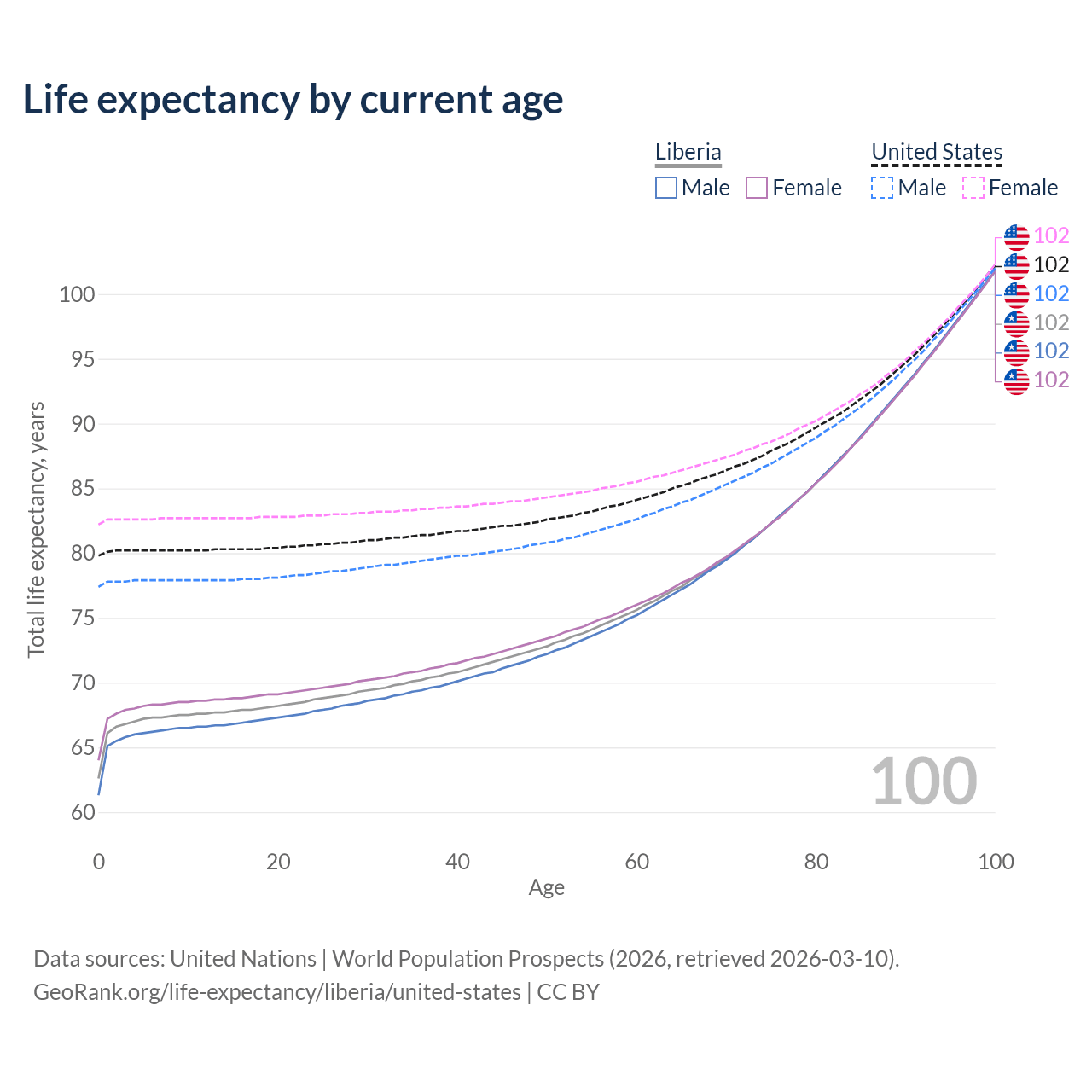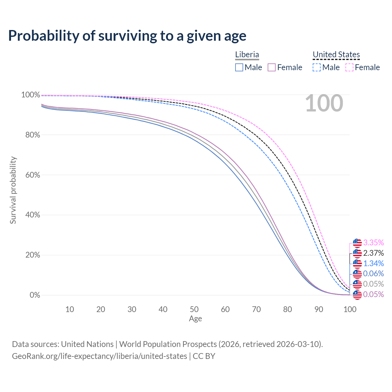 This life expectancy calculator shows the odds of living to 100, 95, 90, and below based on current age for both males and females in Liberia and the United States, along with mean and median age of death. The calculations are based on the 2026 life tables (actuarial tables) from the UN World Population Prospects.