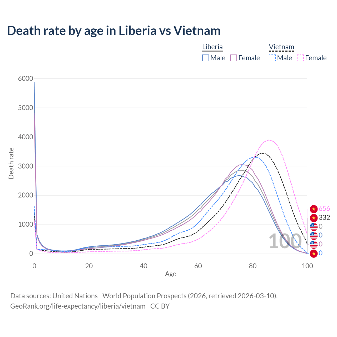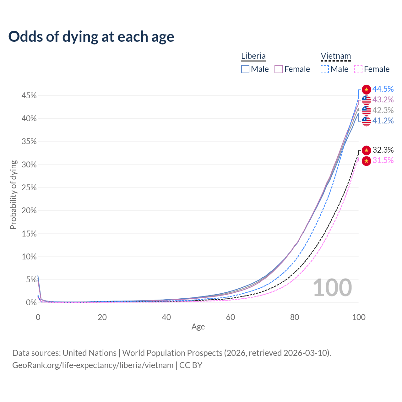 This life expectancy calculator shows the odds of living to 100, 95, 90, and below based on current age for both males and females in Liberia and Vietnam, along with mean and median age of death. The calculations are based on the 2026 life tables (actuarial tables) from the UN World Population Prospects.